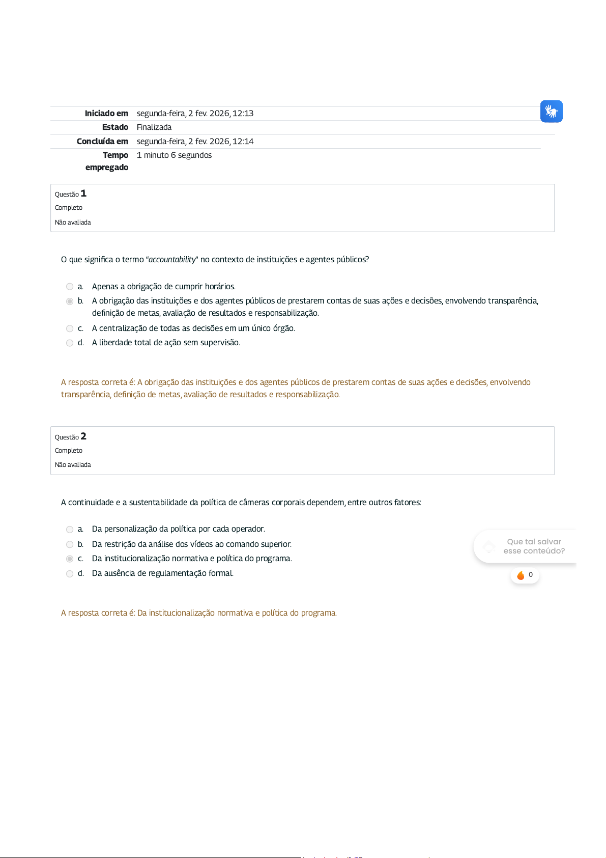 02/02/2026, 13:38 Atividade de Fixação do Módulo 3: Revisão da tentativa https://mooc41.escolavirtual.gov.br/mod/quiz/review.php?attempt=21257429&cmid=336343 1/2 Iniciado em segunda-feira, 2 fev. 2026, 12:13 Estado Finalizada Concluída em segunda-feira, 2 fev. 2026, 12:14 Tempo empregado 1 minuto 6 segundos Questão 1 Completo Não avaliada Questão 2 Completo Não avaliada O que signi�ca o termo “accountability” no contexto de instituições e agentes públicos? a. Apenas a obrigação de cumprir horários. b. A obrigação das instituições e dos agentes públicos de prestarem contas de suas ações e decisões, envolvendo transparência, de�nição de metas, avaliação de resultados e responsabilização. c. A centralização de todas as decisões em um único órgão. d. A liberdade total de ação sem supervisão. A resposta correta é: A obrigação das instituições e dos agentes públicos de prestarem contas de suas ações e decisões, envolvendo transparência, de�nição de metas, avaliação de resultados e responsabilização. A continuidade e a sustentabilidade da política de câmeras corporais dependem, entre outros fatores: a. Da personalização da política por cada operador. b. Da restrição da análise dos vídeos ao comando superior. c. Da institucionalização normativa e política do programa. d. Da ausência de regulamentação formal. A resposta correta é: Da institucionalização normativa e política do programa. Que tal salvar esse conteúdo? 0 02/02/2026, 13:38 Atividade de Fixação do Módulo 3: Revisão da tentativa https://mooc41.escolavirtual.gov.br/mod/quiz/review.php?attempt=21257429&cmid=336343 2/2 Questão 3 Completo Não avaliada Questão 4 Completo Não avaliada Questão 5 Completo Não avaliada Segundo a Portaria MJSP nº 648/2024, as instituições devem possuir uma política institucional especí�ca sobre o uso das câmeras. Qual é uma das condições mínimas para a adesão ao programa federal de apoio à sua implementação? a. Apenas a aquisição de um número mínimo de câmeras. b. Adoção de um único fornecedor de equipamentos. c. A política institucional deve estar fundamentada em princípios como transparência e respeito aos direitos fundamentais. d. Restringir o acesso às imagens apenas ao comando. A resposta correta é: A política institucional deve estar fundamentada em princípios como transparência e respeito aos direitos fundamentais. Sobre os escopos de implementação da política de câmeras corporais, é correto a�rmar que: a. O uso é exclusivo das forças armadas. b. O uso restrito a delegacias é obrigatório. c. A política só pode ser aplicada em todo o efetivo de forma simultânea. d. A aplicação pode ser setorial, iniciando em unidades especí�cas. A resposta correta é: A aplicação pode ser setorial, iniciando em unidades especí�cas. Segundo o material, a implementação e�caz das câmeras deve envolver: a. Supressão das etapas de normatização. b. Exclusivamente a aquisição de bons equipamentos. c. Proibição do uso em áreas públicas. d. Treinamento técnico e ético dos operadores. A resposta correta é: Treinamento técnico e ético dos operadores. Que tal salvar esse conteúdo?