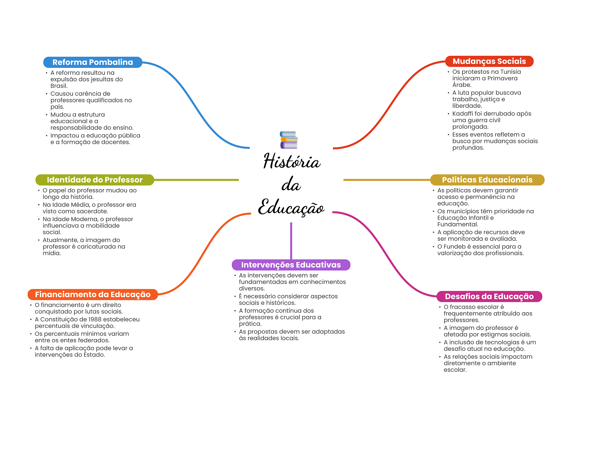 Reforma Pombalina Mudanças Sociais A reforma resultou na Os protestos na Tunísia expulsão dos jesuítas do iniciaram a Primavera Brasil. Árabe. Causou carência de A luta popular buscava professores qualificados no trabalho, justiça e país. liberdade. Mudou a estrutura Kadaffi foi derrubado após educacional e a uma guerra civil responsabilidade do ensino. prolongada. Impactou a educação pública Esses eventos refletem a e a formação de docentes. busca por mudanças sociais profundas. História Identidade do Professor da Políticas Educacionais papel do professor mudou ao As políticas devem garantir longo da história. acesso e permanência na Na Idade Média, O professor era Educação educação. visto como sacerdote. Os municípios têm prioridade na Na Idade Moderna, professor Educação Infantil e influenciava a mobilidade Fundamental. social. A aplicação de recursos deve Atualmente, a imagem do ser monitorada e avaliada. professor é caricaturada na Fundeb é essencial para a mídia. valorização dos profissionais. Intervenções Educativas As intervenções devem ser fundamentadas em conhecimentos diversos. Financiamento da Educação É necessário considerar aspectos Desafios da Educação financiamento é um direito sociais e históricos. fracasso escolar é conquistado por lutas sociais. A formação contínua dos frequentemente aos A Constituição de 1988 estabeleceu professores é crucial para a professores. percentuais de vinculação. prática. A imagem do professor é Os percentuais mínimos variam As propostas devem ser adaptadas entre entes federados. às realidades locais. afetada por estigmas sociais. A inclusão de tecnologias é um A falta de aplicação pode levar a desafio atual na educação. intervenções do Estado. As relações sociais impactam diretamente ambiente escolar.