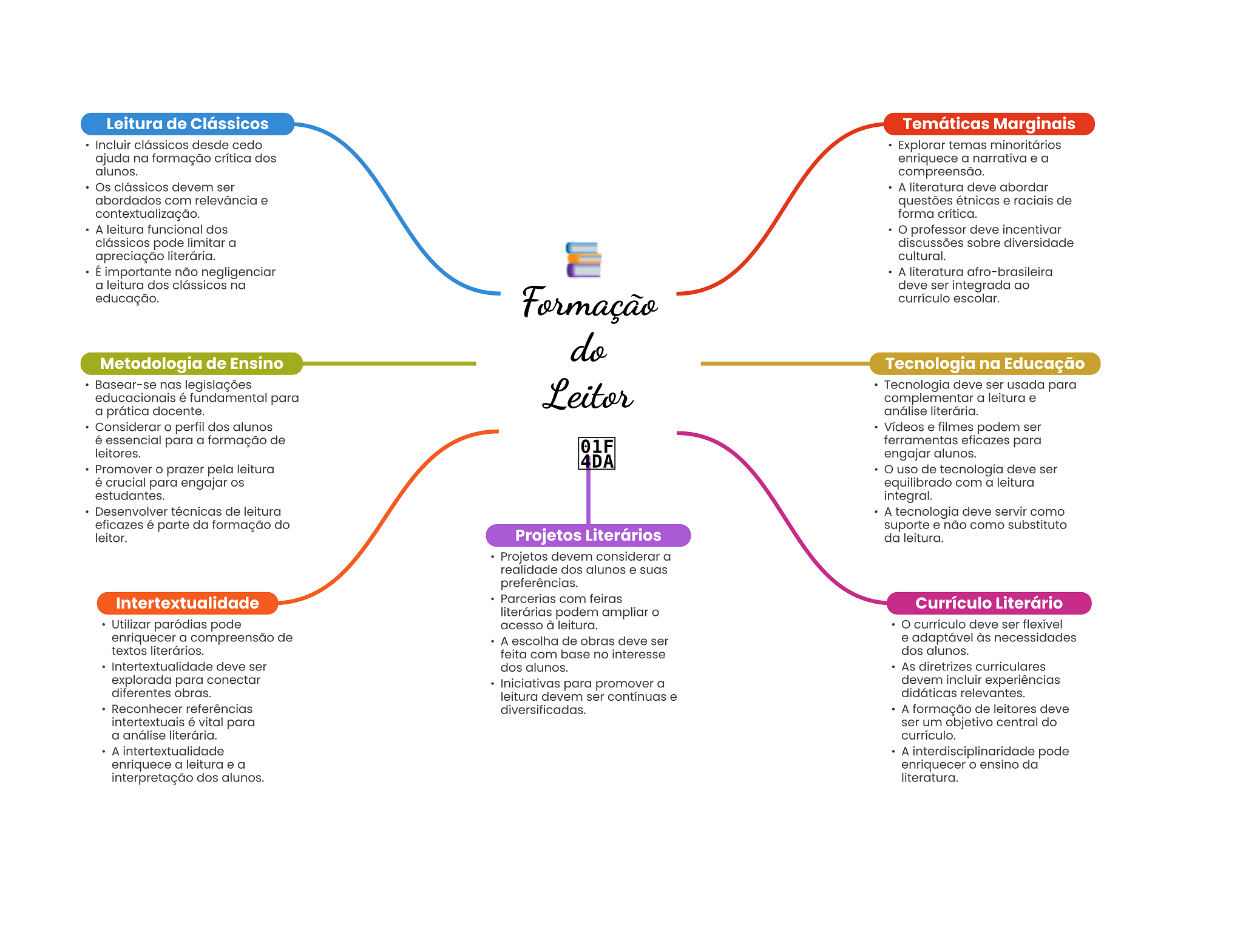 Leitura de Clássicos Temáticas Marginais Incluir clássicos desde cedo Explorar temas minoritários ajuda na formação crítica dos enriquece a narrativa e a alunos. compreensão. Os clássicos devem ser A literatura deve abordar abordados com relevância e questões étnicas e raciais de contextualização. forma crítica. A leitura funcional dos professor deve incentivar clássicos pode limitar a discussões sobre diversidade apreciação literária. cultural. É importante não negligenciar A literatura afro-brasileira a leitura dos clássicos na deve ser integrada ao educação. Formação currículo escolar. do Metodologia de Ensino Tecnologia na Educação Basear-se nas legislações educacionais é fundamental para Leitor Tecnologia deve ser usada para complementar a leitura e a prática docente. análise literária. Considerar perfil dos alunos Vídeos e filmes podem ser é essencial para a formação de 01F ferramentas eficazes para leitores. 4DA engajar alunos. Promover prazer pela leitura uso de tecnologia deve ser é crucial para engajar equilibrado com a leitura estudantes. integral. Desenvolver técnicas de leitura A tecnologia deve servir como eficazes é parte da formação do suporte e não como substituto leitor. Projetos Literários da leitura. Projetos devem considerar a realidade dos alunos e suas preferências. Intertextualidade Parcerias com feiras Currículo Literário literárias podem ampliar Utilizar paródias pode acesso à leitura. currículo deve ser flexível enriquecer a compreensão de A escolha de obras deve ser e adaptável às necessidades textos literários. feita com base no interesse dos alunos. Intertextualidade deve ser dos alunos. As diretrizes curriculares explorada para conectar Iniciativas para promover a devem incluir experiências diferentes obras. leitura devem ser contínuas e didáticas relevantes. Reconhecer referências diversificadas. A formação de leitores deve intertextuais é vital para ser um objetivo central do a análise literária. currículo. A intertextualidade A interdisciplinaridade pode enriquece a leitura e a enriquecer ensino da interpretação dos alunos. literatura.