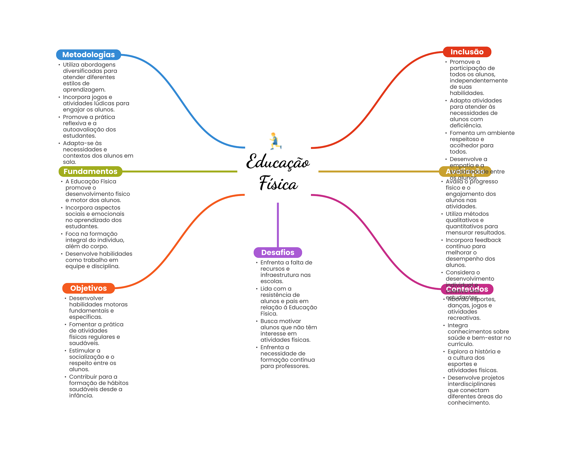 Metodologias Inclusão Promove a Utiliza abordagens diversificadas para participação de atender diferentes todos alunos, estilos de independentemente de suas aprendizagem. habilidades. Incorpora jogos e atividades lúdicas para Adapta atividades engajar alunos. para atender às necessidades de Promove a prática alunos com reflexiva e a deficiência. autoavaliação dos Fomenta um ambiente estudantes. respeitoso e Adapta-se às acolhedor para necessidades e todos. contextos dos alunos em sala. Educação Desenvolve a empatia e a Fundamentos Asolidariedade entre A Educação Física Física os Avalia O progresso promove O físico e desenvolvimento físico engajamento dos e motor dos alunos. alunos nas Incorpora aspectos atividades. sociais e emocionais Utiliza métodos no aprendizado dos qualitativos e estudantes. quantitativos para Foca na formação mensurar resultados. integral do indivíduo, Incorpora feedback além do corpo. contínuo para Desenvolve habilidades Desafios melhorar como trabalho em desempenho dos Enfrenta a falta de equipe e disciplina. alunos. recursos e infraestrutura nas Considera o desenvolvimento escolas. Objetivos Lida com a Conteudos resistência de Desenvolver habilidades motoras alunos e pais em relação à Educação danças, jogos e fundamentais e Física. atividades específicas. recreativas. Busca motivar Fomentar a prática de atividades alunos que não têm Integra interesse em conhecimentos sobre físicas regulares e atividades físicas. saúde e bem-estar no saudáveis. currículo. Enfrenta a Estimular a necessidade de Explora a história e socialização e formação contínua a cultura dos respeito entre para professores. esportes e alunos. atividades físicas. Contribuir para a Desenvolve projetos formação de hábitos interdisciplinares saudáveis desde a que conectam infância. diferentes áreas do conhecimento.