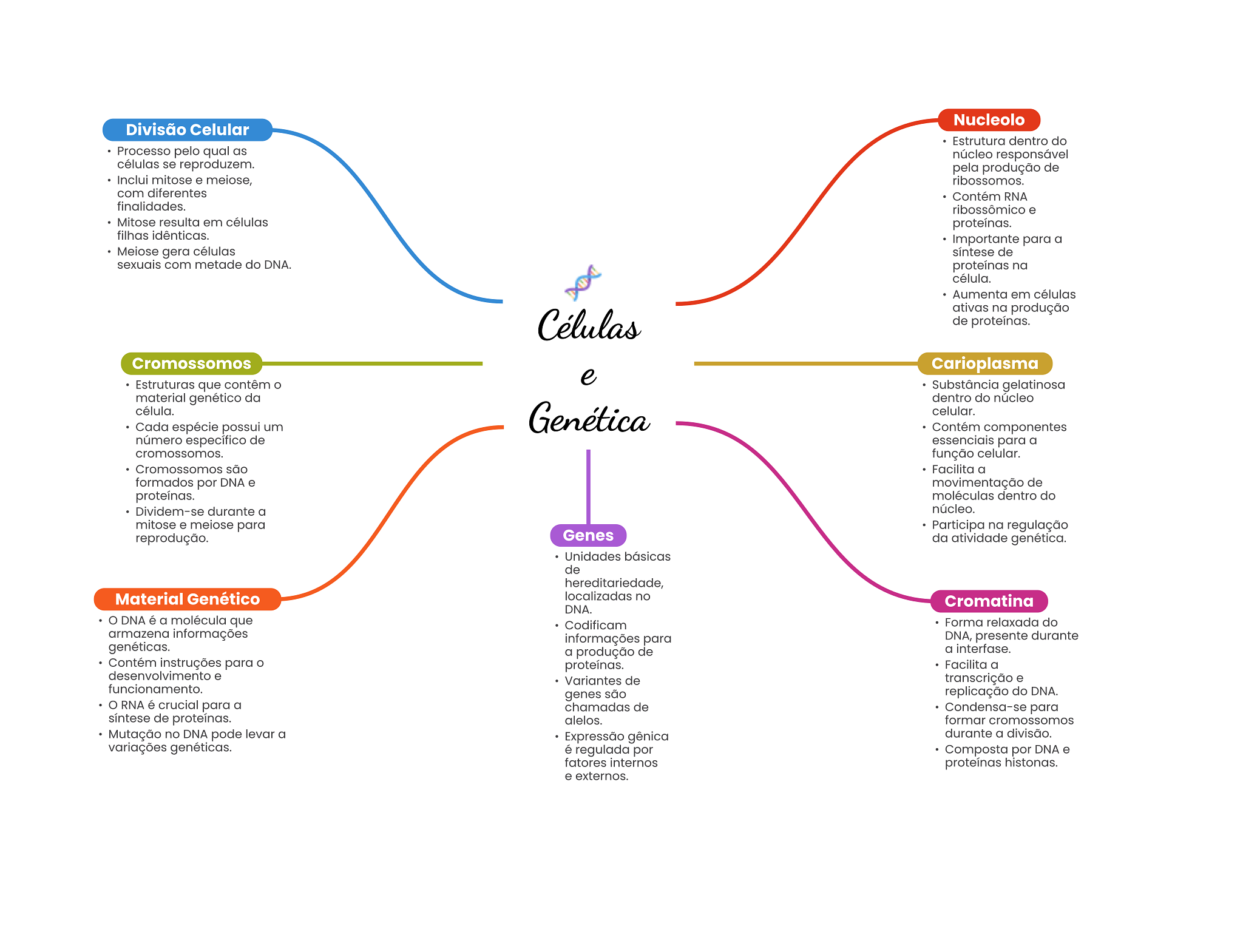 Nucleolo Divisão Celular Estrutura dentro do Processo pelo qual as núcleo responsável células se reproduzem. pela produção de Inclui mitose e meiose, ribossomos. com diferentes Contém RNA finalidades. ribossômico e Mitose resulta em células proteínas. filhas idênticas. Importante para a Meiose gera células síntese de sexuais com metade do DNA. proteínas na célula. Aumenta em células ativas na produção Células de proteínas. Cromossomos Carioplasma e Estruturas que contêm Substância gelatinosa material genético da dentro do núcleo célula. Cada espécie possui um Genética celular. Contém componentes número específico de essenciais para a função celular. Cromossomos são Facilita a formados por DNA e movimentação de proteínas. moléculas dentro do Dividem-se durante a núcleo. mitose e meiose para Participa na regulação reprodução. Genes da atividade genética. Unidades básicas de hereditariedade, Material Genético localizadas no Cromatina DNA. DNA é a molécula que Codificam Forma relaxada do armazena informações informações para DNA, presente durante genéticas. a produção de a interfase. Contém instruções para proteínas. Facilita a desenvolvimento e Variantes de transcrição e funcionamento. genes são replicação do DNA. RNA é crucial para a chamadas de Condensa-se para síntese de proteínas. alelos. formar cromossomos Mutação no DNA pode levar a Expressão gênica durante a divisão. variações genéticas. é regulada por Composta por DNA e fatores internos proteínas histonas. e externos.