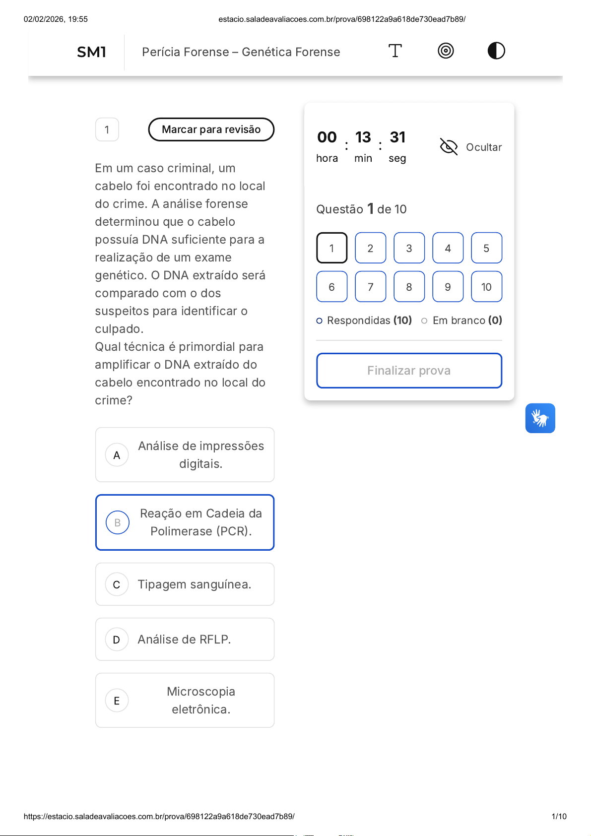 A B C D E 1 Marcar para revisão Em um caso criminal, um cabelo foi encontrado no local do crime. A análise forense determinou que o cabelo possuía DNA suficiente para a realização de um exame genético. O DNA extraído será comparado com o dos suspeitos para identificar o culpado. Qual técnica é primordial para amplificar o DNA extraído do cabelo encontrado no local do crime? Análise de impressões digitais. Reação em Cadeia da Polimerase (PCR). Tipagem sanguínea. Análise de RFLP. Microscopia eletrônica. 00 hora : 13 min : 31 seg Ocultar Questão 1 de 10 Respondidas (10) Em branco (0) Finalizar prova 1 2 3 4 5 6 7 8 9 10 SM1 Perícia Forense – Genética Forense 02/02/2026, 19:55 estacio.saladeavaliacoes.com.br/prova/698122a9a618de730ead7b89/ https://estacio.saladeavaliacoes.com.br/prova/698122a9a618de730ead7b89/ 1/10 A B C D E 2 Marcar para revisão Em um teste de paternidade, o DNA do filho é comparado com o do suposto pai. A genética forense utiliza marcadores específicos que revelam a herança genética, permitindo a confirmação ou exclusão da paternidade. Quais marcadores são comumente utilizados em testes de paternidade para comparar perfis genéticos? Impressões digitais. Microssatélites ou STRs. Tipo sanguíneo. Mitocôndrias. Cromossomos sexuais. 3 Marcar para revisão Uma investigação forense envolveu a análise de DNA de amostras de sangue. Para estabelecer um vínculo entre a cena do crime e o suspeito, 02/02/2026, 19:55 estacio.saladeavaliacoes.com.br/prova/698122a9a618de730ead7b89/ https://estacio.saladeavaliacoes.com.br/prova/698122a9a618de730ead7b89/ 2/10 A B C D E técnicos utilizaram métodos específicos para extrair e analisar o DNA dessas amostras. Qual etapa é fundamental antes da tipagem genética nas análises de DNA em amostras de sangue? Impressão digital. Extração de DNA. Análise de fibras. Teste de drogas. Estudo de insetos. 4 Marcar para revisão As "bandas fantasmas" são anomalias que podem ocorrer durante análises de DNA e representam um desafio significativo na interpretação dos resultados. O que são "bandas fantasmas" em análises de DNA, e por que representam um desafio na interpretação dos resultados? 02/02/2026, 19:55 estacio.saladeavaliacoes.com.br/prova/698122a9a618de730ead7b89/ https://estacio.saladeavaliacoes.com.br/prova/698122a9a618de730ead7b89/ 3/10 A B C D E Bandas fantasmas são resultados positivos que indicam a presença de DNA em todas as amostras analisadas. Bandas fantasmas são resultados negativos que sugerem a ausência de DNA nas amostras biológicas. Bandas fantasmas são resultados que ocorrem quando há amplificação de um alelo em detrimento do outro, gerando confusão na interpretação. Bandas fantasmas são resultados que ocorrem devido à exposição das amostras biológicas à luz solar. Bandas fantasmas são resultados que ocorrem devido à presença de microrganismos nas amostras biológicas. 02/02/2026, 19:55 estacio.saladeavaliacoes.com.br/prova/698122a9a618de730ead7b89/ https://estacio.saladeavaliacoes.com.br/prova/698122a9a618de730ead7b89/ 4/10 A B C 5 Marcar para revisão O procedimento adequado para coletar e preservar amostras de sangue líquido em investigações forenses é de extrema importância para garantir a integridade das evidências e a confiabilidade dos resultados. Qual é o procedimento adequado para coletar e preservar amostras de sangue líquido em investigações forenses? O sangue deve ser coletado com uma seringa não estéril e transferido para um tubo de laboratório também não estéril. O sangue deve ser coletado por qualquer pessoa sem a necessidade de esterilização de instrumentos. O sangue deve ser coletado por pessoal médico qualificado com o uso de seringa estéril e transferido para um tubo de laboratório também estéril. 02/02/2026, 19:55 estacio.saladeavaliacoes.com.br/prova/698122a9a618de730ead7b89/ https://estacio.saladeavaliacoes.com.br/prova/698122a9a618de730ead7b89/ 5/10 D E A B C O sangue deve ser congelado imediatamente após a coleta para preservação. O sangue deve ser exposto à luz solar direta após a coleta. 6 Marcar para revisão Um novo estudo foca no uso de marcadores genéticos complementares para a análise de linhagens paternas. Os pesquisadores exploram o DNA do cromossomo Y, que é transmitido de pai para filho, para traçar a herança genética masculina. O DNA do cromossomo Y é utilizado para estudar a herança em qual linha genealógica? Materna. Paterna. Bilineal. 02/02/2026, 19:55 estacio.saladeavaliacoes.com.br/prova/698122a9a618de730ead7b89/ https://estacio.saladeavaliacoes.com.br/prova/698122a9a618de730ead7b89/ 6/10 D E A B C D E Mitocôndrial. Fraterna. 7 Marcar para revisão Em um estudo sobre a estrutura do genoma humano, pesquisadores analisam a relação entre a cromatina e a herança genética. Eles buscam compreender como as variações no DNA afetam características hereditárias, utilizando marcadores genéticos para mapear estas diferenças. Qual é o principal componente da cromatina que interage diretamente com a herança genética? Ribossomos. RNA mensageiro. Histonas. Proteínas motoras. Lipídios. 02/02/2026, 19:55 estacio.saladeavaliacoes.com.br/prova/698122a9a618de730ead7b89/ https://estacio.saladeavaliacoes.com.br/prova/698122a9a618de730ead7b89/ 7/10 A B C D E 8 Marcar para revisão Em determinadas situações, a análise do DNA nuclear não pode ser aplicada (como em casos onde o DNA está degradado ou em que o material biológico não apresenta o DNA nuclear). Nestes casos, o perito pode analisar: X-STR Y-STR Mini-STR Amelogenina mtDNA 9 Marcar para revisão O mais adequado marcador genético para identificação post mortem é: 02/02/2026, 19:55 estacio.saladeavaliacoes.com.br/prova/698122a9a618de730ead7b89/ https://estacio.saladeavaliacoes.com.br/prova/698122a9a618de730ead7b89/ 8/10 A B C D E A B VNTR SNP CNP STR HLA 10 Marcar para revisão O sistema ABO é um exemplo clássico de herança 