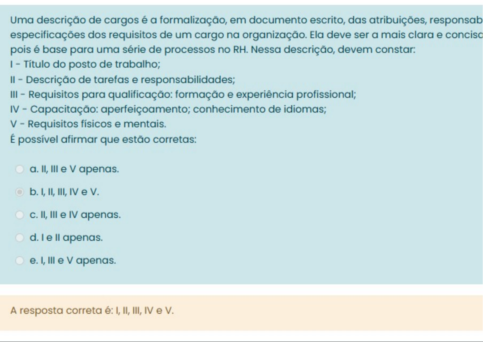 Uma descrição de cargos é a formalização, em documento escrito, das atribuições, responsab especificações dos requisitos de um cargo na organização. Ela deve ser a mais clara e conciso pois é base para uma série de processos no RH. Nessa descrição, devem constar: I Título do posto de trabalho; II - Descrição de tarefas e responsabilidades; III - Requisitos para qualificação: formação e experiência profissional; IV - Capacitação: aperfeiçoamento; conhecimento de idiomas; V - Requisitos físicos e mentais. É possível afirmar que estão corretas: a. II, III e V apenas. C. II, III e IV apenas. d. I e apenas. e.l, III e V apenas. A resposta correta é: I, II, III,