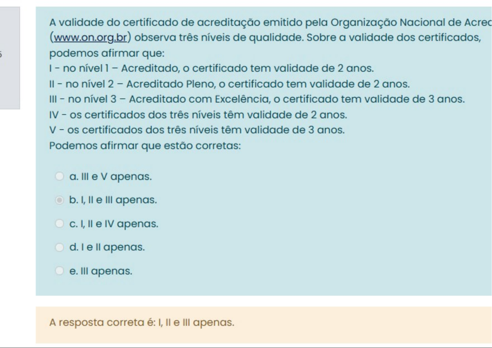 A validade do certificado de acreditação emitido pela Organização Nacional de (www.on.org.br) observa três níveis de qualidade. Sobre a validade dos certificados, podemos afirmar que: no nível 1 - Acreditado, certificado tem validade de 2 anos. - no nível 2 - Acreditado Pleno, certificado tem validade de 2 anos. III - no nível 3 - Acreditado com Excelência, certificado tem validade de 3 anos. IV - certificados dos três níveis têm validade de 2 anos. V - certificados dos três níveis têm validade de 3 anos. Podemos afirmar que estão corretas: a. III e V apenas. e III apenas. e IV apenas. d. I e II apenas. e. III apenas. A resposta correta é: I, II e III apenas.