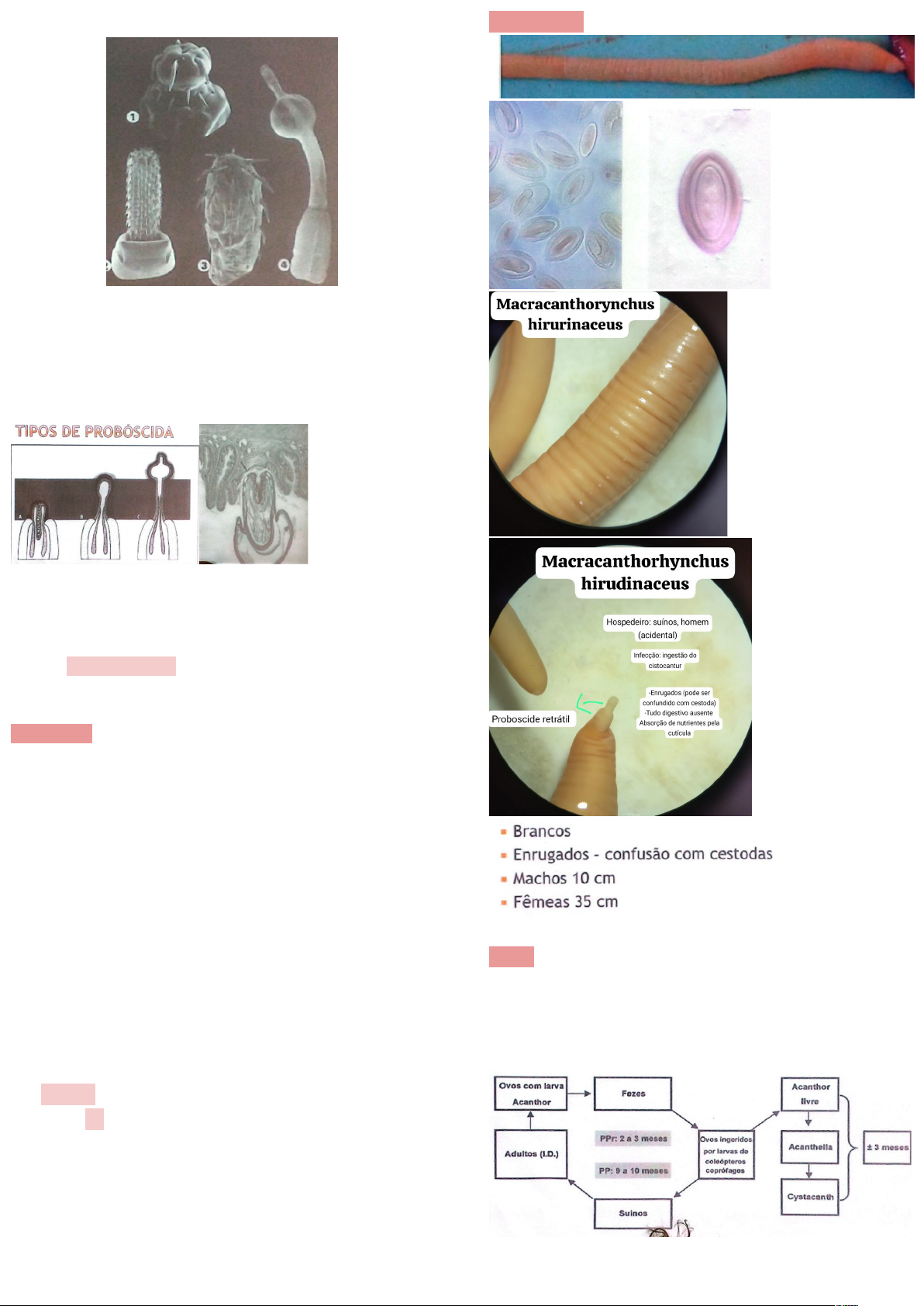 FILO ACANTOCEPHALA akantha = espinho, kephale = cabeça Vermes com cabeça espinhosa (cabeça armada com ganchos) Probóscida retrátil com espinhos → lesão · utilizada para fixação na parede do intestino Não existe canal alimentar Dióicos · macho com pênis muscular Ciclo indireto/heteroxeno · HI = artrópode Patogenia · A fixação da probóscide (tromba) na parede intestinal pode causar lesões mecânicas e inflamação. · Em casos mais raros, pode causar peritonite por extravasamento de conteúdo luminal, caso a probóscida atravesse a parede Macracanthorynchus hirudinaceus Verme branco com aspecto fragmentado (parece cestoda) no ID de suíno · não confundir com T. solium que é menor e não é branca H: suínos Habitat: ID HI: larvas de Besouros coleópteros coprófagos Morfologia Ciclo Acantor: ovo larvado nas fezes · anel anterior de ganchos e espinhos Cistocanto: · larva infectante encistada no HI ovos com larva (acantor) → ingestão por larvas de besouros coleópteros coprófagos → desenvolvimento larval ( acantor livre → acanhella → cystocanto) → ingestão do HI pelo suíno → cistacanto é liberado no intestino delgado → forma adulta no ID do suíno Importância Mucosa intestinal com saliências Ulcerações Contaminação secundária (bactéria) causando enterites: As úlceras na parede intestinal funcionam como portas de entrada. As bactérias presentes no lúmen intestinal (flora normal) podem invadir os tecidos subjacentes através dessas lesões, causando uma enterite (inflamação do intestino) de origem bacteriana, que é uma complicação secundária da infecção parasitária primária. Perfuração intestinal (peritonite) image5.png image1.jpg image2.jpg image4.png image6.png image7.png image8.png image9.png image3.png
