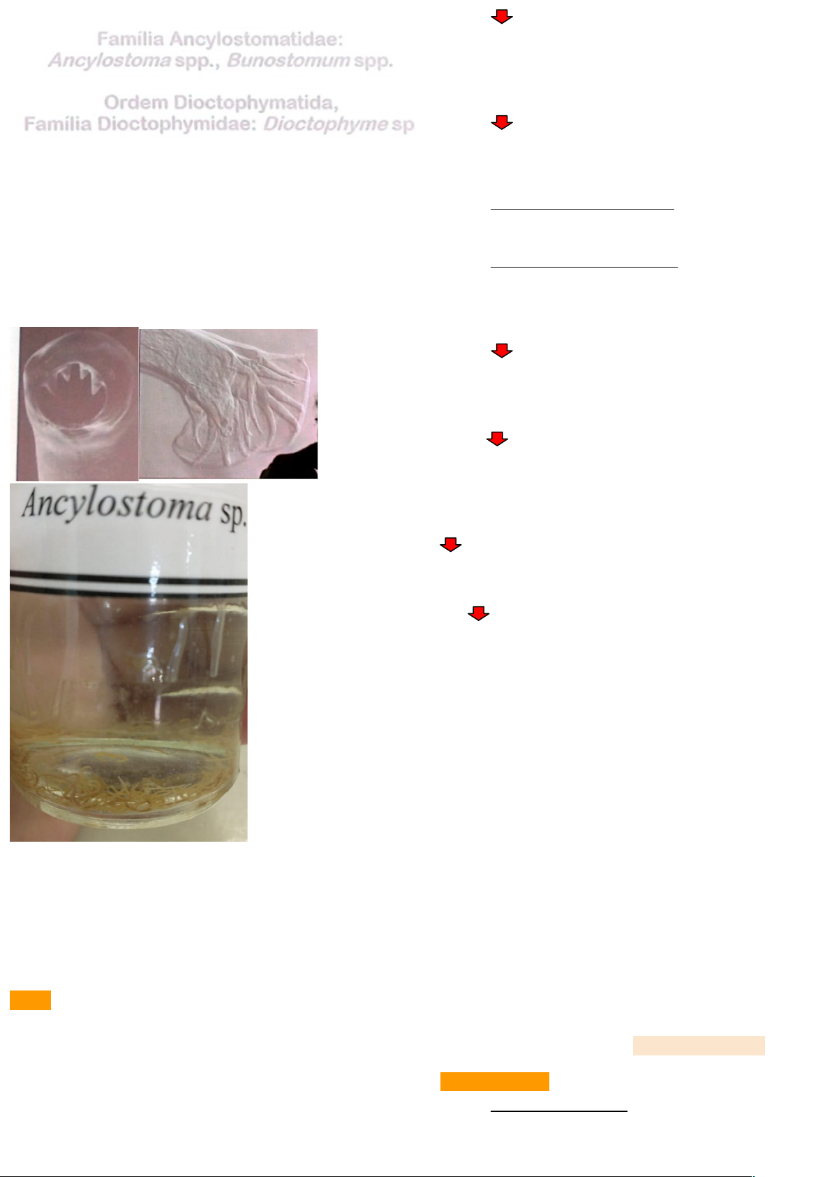 FAMÍLIA ANCYLOSTOMATIDAE Ancylos: gancho Stoma: boca Ciclo hepatopulmonar Hematófago Ancylostoma sp. H: cão, gato e humanos Extremidade anterior voltada ventralmente Boca curva e com dentes · 1 a 3 pares de dentes ventrais e 2 dorsais Ciclo PPP: 2 semanas Verme Adulto fixados à parede do intestino delgado do hospedeiro (humano, cão ou gato). Ovos (não embrionados) → eclosão e liberação da L1 (rabditóide) → L2 (rabditóide)→ L3/infectante (filarióide) no ambiente penetração ativa de de L3 na pele · Ingestão (A. duodenale): Alternativamente, pode ser ingerida (via oral) através de água ou alimentos contaminados. · Outras Vias (A. caninum): Também pode ocorrer por via transmamária e, em menor grau, transplacentária (principalmente em cães). L3 entra na circulação sanguínea ou linfática → Coração → pulmões rompe os capilares pulmonares → migra para os alvéolos → subindo pela árvore brônquica até a traqueia e a faringe. Deglutição → intestino delgado fixa à mucosa intestinal e passa por mais duas mudas → verme adulto · Hematofagia: O verme adulto se alimenta de sangue do hospedeiro. · Reinício do Ciclo: Após o acasalamento, as fêmeas começam a produzir ovos, que são eliminados nas fezes, reiniciando o ciclo ⚠️ Diferença Crucial (Larva Migrans Cutânea): Se a larva L3 for de uma espécie que parasita animais (como A. braziliense ou A. caninum), o ciclo não se completa no ser humano. A larva penetra a pele mas é impedida de migrar profundamente . Ela fica "presa" na pele, causando o bicho geográfico. Transmissão: · Penetração de L3: · penetra na pele → corrente sanguínea ou sistema linfático → coração → pulmões → rompe capilares e migra para os alvéolos → Sobe pela traqueia → deglutição → intestino delgado → amadurece · Ingestão de larvas infectantes (L3): · deglutição → estômago→ intestino delgado. · A larva não realiza a migração pulmonar. Ela se "desencista" e amadurece in situ (no local) no intestino. · Transmissão transplacentária: · L3 em hipobiose nos tecidos da cadela (músculo, gordura) → reativados durante a gestação → larvas migram e conseguem atravessar a barreira placentária, alcançando a circulação e os tecidos do feto em desenvolvimento. · Trasmissão transmária · larva L3 em estado hipobiótico nos tecidos da mãe → durante o final da gestação e lactação, as alterações hormonais reativam e mobilizam essas larvas → larvas migram para as glândulas mamárias e são secretadas no leite→ larvas se desenvolvem no intestino dos filhote Espécies: Ancylostoma braziliense: · H: caẽs e gatos · Principal agente etiológico da Larva Migrans Cutânea (LMC).Suas larvas penetram a pele humana, mas não conseguem completar o ciclo migratório, ficando presas sob a epiderme e causando as lesões características. · Machos (M): 8 a 11 mm · Fêmeas (F): 10 a 18 mm → sempre com extremidade afilada · Morfologia: · um par de dentes grandes e um par de dentes pequenos na borda ventral.. · bolsa copuladora Ancylostoma caninum: afeta cães · afeta cães · zoonose: pois suas larvas podem penetrar a pele humana, causando a Larva Migrans Cutânea, popularmente conhecida como "bicho geográfico". · pois o ser humano é o hospedeiro acidental, é impedida de migrar profundamente · no cão faz a migração (o ciclo pelos pulmões) · Machos (M): 11 a 13 mm · Fêmeas (F): 10 a 18 mm · Morfologia: · três pares de dentes grandes e pontiagudos na margem ventral → são a exceção dos Ancylostomas por terem 3 dentes · bolsa copuladora · Sintomas: · Irritação na pele no local de entrada da larva · Os nematoides são hematófagos → Anemia microcítica e hipocrômica · Microcítica: As hemácias (glóbulos vermelhos) ficam pequenas. · Hipocrômica: As hemácias ficam pálidas devido à baixa concentração de hemoglobina. · Esta anemia é causada pela perda crônica de ferro devido ao sangramento intestinal (anemia ferropriva), sendo o sintoma mais grave da ancilostomíase. · Pode haver pequenas lesões pulmonares – geralmente desapercebidas · Emagrecimente ( má absorção ) · Perda de apetite · Diarréia, enterite hemorrágica · Forma hiperaguda: infecção rápida, maciça e súbita de filhotes através da transmissão de larvas pela lactação → infecção fatal · Forma Aguda: infecção maciça, mas geralmente ocorre após a exposição ambiental. · Ingestão ou penetração maciça de L3 do ambiente por filhotes · Forma Crônica Compensada: Infecção mais leve ou de longa duração em cães adultos ou que sobreviveram à fase aguda. · Geralmente é assintomática (compensam a perda de sangue) · Forma crônica descompensada: progressão da doença em cães que não conseguem mais compensar a perda sanguínea causada pelos vermes. · Geralmente acomete cães mais velhos: que tiveram forma Crônica Compensada (assintomática) por muito tempo, mas a descompensação ocorre quando a carga parasitária aumenta ou a saúde geral do animal piora · Anemia profunda é o sintoma central da descompensação, pode levar a morte . Larva migrans cutânea · Lesões de pele · Dermatite linear serpiginosa: rastro inflamado, vermelho e em formato de serpente ou linha · Larvas migram entre a epiderme e a derme · Causam eritema e prurido · Conhecido como "bicho geográfico" obs: ovo é ovalado, de parede fina e lisa, e contém células em divisão. obs: larva migrans cutânea Ancylostoma tubaeformae · afeta: Gatos · Machos (M): 9,5 a $11 mm. · Fêmeas (F): 12 a 15 mm · Assim como o A. caninum, também pode causar a Larva Migrans Cutânea em humano, porém é menos comum Ancylostoma duodenale: · É um dos dois principais agentes da Ancilostomíase Humana (Amarelão), causando doença intestinal, junto com Necator americanus. · H: homem · Patogenia: anemia ferropriva grave, devido ao intenso hematofagismo (consumo de sangue) do parasi