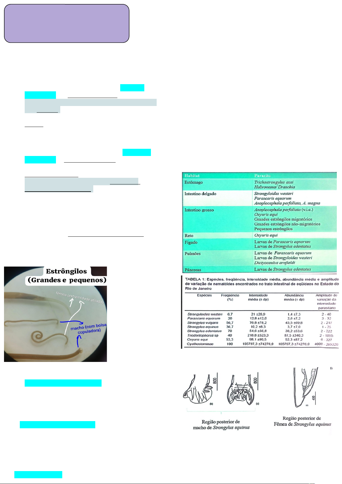 ESTRONGILÍDEOS ORDEM STRONGYLIDA · estrongilídeos: Este é o nome comum em português para os membros da ordem Strongylida. · Família Strongylidae: agrupa os Grandes Estrôngilos → verminose equina · Subfamília: Strongylinae (Grandes Estrôngilos dos cavalos) · Subfamília: Globocephalinae (Parasitas de suínos) · Família Cyathostomidae: agrupa Pequenos Estrôngilos → verminose equina · Subfamília: Oesophagostominae (Parasitas de ruminantes/suínos) · Subfamília: Cyathostominae (Pequenos Estrôngilos dos cavalos) · Família Trichostrongylidae → Haemonchus place ( bovinos) i e H. contortus (pequenos ruminantes) → verminoses de ruminantes —> Vamos dar um geral em Pequenos e Grandes estrongilídeos - verminose equina · parasitas internos mais significativos dos cavalos, · Pequenos estrongilídeos = chamados de Ciatostomíneos · podemos dizer que 100% dos equinos tem, porém é assintomático · Grandes estrongilídeos · Migratórios: S. vulgaris, S. equinus, S. edentatus · Não migratórios: Triodontophorus sp. · Importância: 1. Pequeno desconforto abdominal e Redução no desempenho 2. Episódios fulminantes de cólicas, seguidos de morte: · sinal clínico mais grave associado aos estrongilídeos, especialmente aos grandes estrongilídeos · causada principalmente pelo Strongylus vulgaris → vai ter explicado a diante 3. Resistência do hospedeiro aos parasitos: · Os cavalos desenvolvem alguma imunidade contra os parasitas ao longo da vida, principalmente através da exposição. · Animais jovens (potros) e idosos, ou aqueles com o sistema imunológico comprometido, são muito mais suscetíveis a desenvolver doenças graves. 4. Resistência dos parasitos às drogas · Principais espécies · Morfologia · Macho: presença de bursa copulatória ( macho usa para se prender à fêmea durante a cópula) e espículas (usadas para transferir esperma) · Fêmea: vulva —> Vamos focar em Grandes Estrongilídeos obs: grandes estrôngilos não migratórios o principal é o Triodontophorus · Hospedeiro: equídeos · Habitat: IG · Família Strongylidae e Subfamília: Strongylinae —> Grandes estrôngilos migratórios · Importância: · Cólica trombo-embólica (S. vulgari): · ponto mais crítico e perigoso. · Strongylus vulgaris, uma das espécies mais conhecidas, tem um ciclo de vida que envolve a migração das larvas pelas artérias do intestino, especialmente a artéria mesentérica cranial. Essa migração pode causar inflamação e a formação de coágulos (trombos). Se esses coágulos se desprendem e viajam pela corrente sanguínea, eles podem bloquear o fluxo de sangue em outras partes do intestino, causando a cólica tromboembólica. Esta condição é extremamente dolorosa e frequentemente fatal para o animal se não for tratada rapidamente. · Ingestão de grandes tampões de mucosa: · hábito alimentar dos vermes adultos · Perda de sangue e de proteínas: A ingestão da mucosa e o dano vascular resultam na perda de sangue e de proteínas para o trato gastrointestinal. Com o tempo, essa perda contínua pode levar a quadros de anemia e desnutrição no animal. · Claudicação intermitente: · embolia em vasos inferiores/caudais ocasionada principalmente por S. vulgari · Ciclo Biológico Geral aos Grande estrôngilos → fase de vida livre/ no ambiente ovos não larvados nas fezes (mórula de ovos) - ovípara desenvolvimento da larva L1 e eclosão da larva L1 L1 ( 1º estádio) →muda → L2 →muda→ L3 [com bainha (cutícula do estádio 2), não se alimenta e é infectante] abandono do bolo fecal capim → ingestão pelo H · L1 → L2: perda da cutícula e forma outra (fase mais delicada do ciclo) → larva sensível e por isso fica dentro do bolo fecal - esse protege contra o sol , tem umidade e alimento (matéria orgânica) · L3: pode ficar embaixo da terra, não se alimenta e não bebe água, ela tem uma reserva de energia e quando acaba morre → isso é devido a sua cutícula grossa. · Bainha: Vantagem - não perde água Desvantagem - não entra água, não se alimenta (depende da reserva de energia) Strongylus vulgaris · Morfologia · menor entre os grandes estrôngilos · Machos: 1,1 a 1,6 cm, Fêmeas: 2 a 2,5 cm · Cápsula bucal · bem desenvolvida e com 2 dentes em forma de orelha · goteira dorsal que alcança a margem anterior · PPP: 6 a 7 meses · Habitat dos adultos: ceco · pode matar · Ciclo biológico / fase parasitária: ingestão de L3 junto com o pasto → L3 perde bainha adesão e penetração na parede do IG ( ceco) sofre muda na submucosa do intestino ( L3 →L4) (L4 programada para entrar em vasos) L4 → migração pela parede de artéria ou arteríolas intestinais ( fase mais crítica) por meses e não pela luz → até chegar a artéria mesentérica cranial (na intersecção da aorta com a mesentérica cranial) durante essa viagem causam arterite e formação de aneurismas, principalmente no entroncamento da a. mesentérica cranial com a aorta ( várias larvas L4 dentro do aneurisma) · Aneurisma é a dilatação anormal e permanente de uma artéria, causada pelo enfraquecimento de sua parede: pode causar rompimento dessa artéria e hemorragia interna sofre muda dentro do aneurisma L4--> L5 dentro do aneurisma - dentro da parede do vaso ( ver adiante o que é aneurisma) larvas L5 rompe a parede do vaso vai para a luz vascular → para ir para o cego e intestino grosso · quando L5 rompe a parede do vaso se forma trombos que podem se desprender e cair na corrente sanguínea · embolia → bloqueio de vasos sanguíneos menores que irrigam o intestino · isquemia e morte de tecidos ( infarto de órgãos) → cólica trombo-embólica L5 amadurecem para a forma adulta (diferenciação sexual) → fixam na parede do ceco e do cólon → produção de ovos, que serão liberados nas fezes obs: Aneurisma: · dilatação localizada e permanente de uma artéria, causada pelo enfraquecimento da parede do vaso sanguíneo.