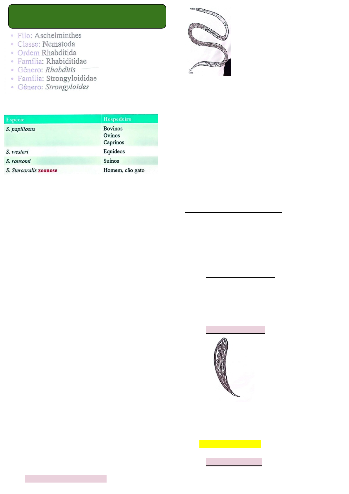 Nematelminto - Strongyloides sp. · Hospedeiros: aves, répteis e anfíbios e mamíferos. · Strongyloides stercoralis · um dos menores nematóides medindo de 2 a 3 mm · parasita intestinal que afeta uma grande parte da população humana, sendo mais prevalente em latitudes tropicais e subtropicais. · Em infecção limitada ao trato gastrointestinal: geralmente é assintomática · Ocasionalmente em invasão sistêmica maciça em estado de larva ( auto-infecção endógena) : pode levar a óbito · Morfologia e Características Gerais sobre os Strongyloides sp · Dióicos · vive no solo · Pode infectar bovinos ( ex: vaca gir, que tem orelha grande, que quando pasteja arrasta a orelha no chão e pode haver infecção pelo parasita) · causa otite parasitária → rhabditis e ácaro · Causa diarreia e morte em humanos imunossuprimidos ( HIV) · a diarreia é a própria reação do corpo para tentar expulsar o parasita · Zoonose → Strongyloides stercoralis · em ovinos filhotes é comum e em cães a prevalência é menor · Fêmea Partenogenética: · É um indivíduo do sexo feminino, capaz de produzir descendentes a partir de óvulos não fecundados. · Não precisa do macho para reprodução (reprodução por partenogênese) - reprodução assexuada · Somente ela é parasita, o macho é de vida livre (no intestino do hospedeiro só tema fêmea) · Fêmea adulta no intestino · Esôfago filariforme ( longo), que ocupa ⅓ do comprimento do corpo → ocupa toda a porção anterior do corpo · 2,2 mm Diferença com hermafrodita: · É um indivíduo que possui aparelho reprodutor masculino e feminino ao mesmo tempo. · Pode: Autofecundar-se (usa os dois sexos em si mesmo). Cruzamento cruzado (dois hermafroditas trocam gametas). · Corpo dividido: terço anterior, médio e posterior · Larva Rabditoide: · Larva que eclode do ovo larvado · Tem esôfago rabditóide: dilatação nas extremidades e constrições na porção mediana · Não é infectante: fase de alimentação · Larva Filarióide : · Infectante · Modificação da rabditóide · Esôfago filariforme, ocupando ⅓ do comprimento do corpo · não se alimenta, faz migração e é a forma infectiva que penetra pele · após a penetração vai para vasos linfáticos e vasos sanguíneos e venosos · Forma Adulta: · Infecção assintomática · Localização: intestino delgado → somente a fêmea é encontrada · Nutrição: células da mucosa intestinal e líquidos intersticiais · Ciclo 🔹 1) Fase parasitária / homogonia / Ciclo Partenogenético – pode ocorrer autoinfecção 👉 Aqui só participam as fêmeas partenogenéticas que vivem no intestino do hospedeiro definitivo (HD). 1. No intestino delgado do HD (homem, cão, etc.): · Fêmeas partenogenéticas vivem no epitélio intestinal (mucosa) · Produzem ovos já embrionados (ovovivípara - ovo larvado com larvas rabditóide), que podem: · Eclodir ainda dentro da mucosa (onde a fêmea está localizada) ou na luz intestinal, liberando larvas rabditoides 1 → geralmente ocorre assim · E essas larvas rabditoides ainda podem se diferenciar para filarioides ainda no intestino, causando a auto-infecção endógena · ou liberar ovos larvados nas fezes 2. No ambiente: · Ovos → eclosão → larvas rabditóides 1 · larvas rabditoides 1 no ambiente No ambiente, essas larvas rabditoides 1 têm dois caminhos: 1) Se transformam em larvas filarióide – para infectar um novo hospedeiro (reiniciando o ciclo parasitário): Sofrem mudas (ecdise) → rabditoides 2 → ecdise → larvas filarioides 2) Ou dão início ao ciclo ambiental, de vida livre. Rabditóide 1 → rabditóide 2 → adultos → ovos 3. Nova infecção: · As filarioides penetram ativamente pela pele do hospedeiro · Migram pela circulação (linfática ou sanguínea)→ coração direito → pulmões → rompem os capilares, invadem os alvéolos pulmonares e sobem pela árvore brônquica até a faringe →traqueia → deglutidas → chegam ao intestino delgado → mucosa intestinal 4. No intestino novamente: · Diferenciam-se em fêmeas partenogenéticas → recomeçam a postura → fechando o ciclo direto. 🔹 2) Fase ambiental (de vida livre no ambiente)/ Heterogonia Este ciclo ocorre quando as larvas rabditoides excretadas nas fezes encontram condições ambientais ideais (solo úmido e quente) para se desenvolverem. 👉 Aqui aparecem machos e fêmeas de vida livre no solo. 1. No intestino do HD: · Mesmo começo: fêmeas partenogenéticas produzem ovos → larvas rabditoides (L1) → eliminadas nas fezes ou ovos eliminados nas fezes 2. No ambiente (diferente do ciclo direto): · Essas larvas rabditoides não viram filarioides imediatamente. · Em vez disso, se desenvolvem em adultos machos e fêmeas livres no solo. 3. Reprodução sexuada no ambiente: · Machos + fêmeas de vida livre copulam. · Produzem novos ovos, que eclodem em novas larvas rabditoides. 4. Transformação: · As novas rabditoides 1→ sofrem mudas → larvas rabditóides 2 → aqui a rabditoide 2 pode seguir dois caminho: diferenciar em macho ou fêmea e completar mais gerações de fase de vida livre, ou diferenciar em filarioide, que deverá penetrar na pele de algum hospedeiro A transformação em larvas filariformes é o elo entre o ciclo de vida livre e a infecção de um novo hospedeiro. 🔹 3) Autoinfecção · Além do ciclo direto e indireto, Strongyloides tem a capacidade de reiniciar o ciclo dentro do mesmo hospedeiro: · Algumas larvas rabditoides (L1) já se transformam em filarioides dentro do intestino ou região perianal. 1) Filarióides penetram a parede do intestino → retornam à circulação → reiniciam o ciclo sem sair para o ambiente (autoinfecção endógena/interna) · comum acontecer em caso de constipação intestinal do hospedeiro · ovos larvados no intestino → rabiditóides → larva filarióide → penetra na mucosa intestinal · Hiper infecção: queda da imunidade e maior número de lar