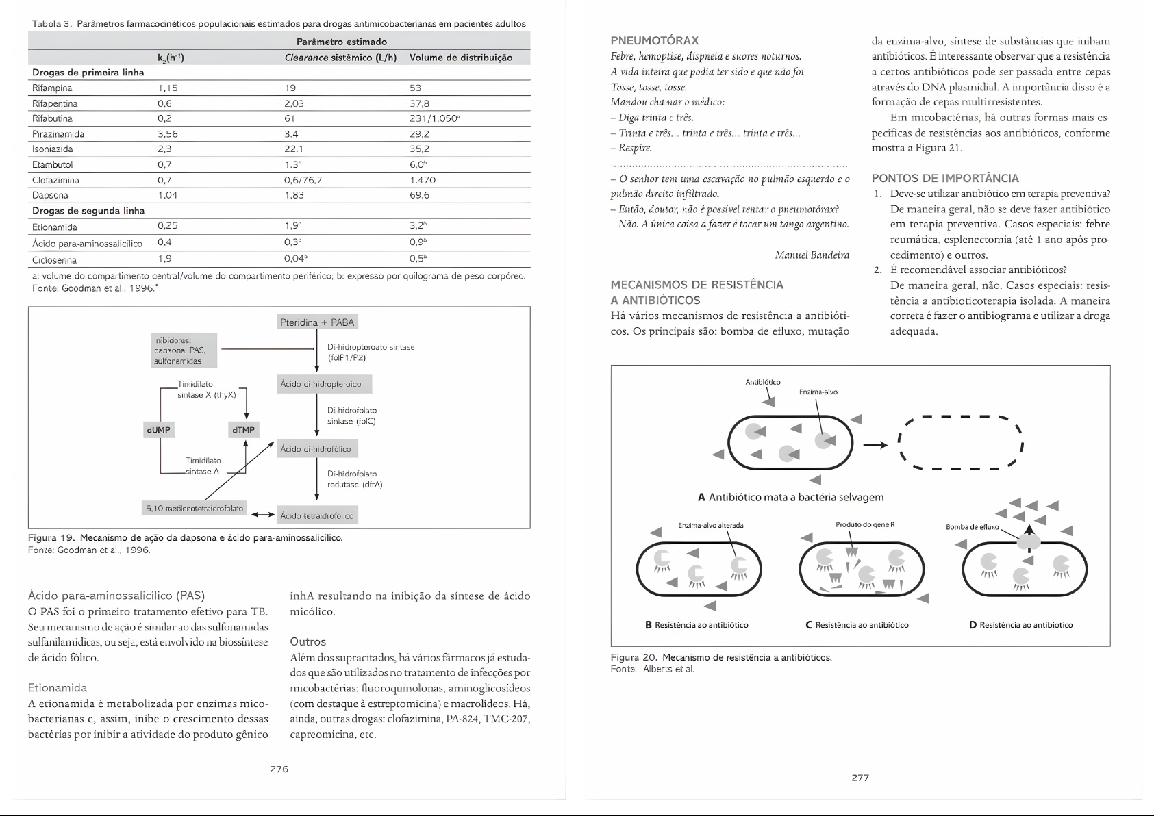 Tabola 3. Parâmetros farmacocinéticos populacionais estimados para drogas em pacientes adultos Parâmetro estimado PNEUMOTÓRAX da enzima-alvo, síntese de substâncias que inibam Clearance sistêmico (L/h) Volume de distribuição Febre, hemoptise, dispneia e suores noturnos. antibióticos. É interessante observar que a resistência Drogas de linha A vida inteira que podia ter sido e que não foi a certos antibióticos pode ser passada entre cepas Rifampina 1,15 19 53 Tosse, tosse, tosse. através do DNA plasmidial. A importância disso é a Rifapentina 0,6 2,03 37,8 Mandou chamar médico: formação de cepas multirresistentes. Rifabutina 0,2 61 231/1.050 Diga trinta e três. Em micobactérias, há outras formas mais es- Pirazinamida 3,56 3.4 29,2 Trinta e três... trinta e três... trinta e três... pecíficas de resistências aos antibióticos, conforme Isoniazida 2,3 22.1 35,2 - Respire. mostra a Figura 21. Etambutol 0,7 Clofazimina 0,7 0,6/76,7 1.470 senhor tem uma escavação pulmão esquerdo e PONTOS DE IMPORTÂNCIA Dapsona 1,04 1,83 69,6 pulmão direito infiltrado. 1. Deve-se utilizar antibiótico em terapia preventiva? Drogas de segunda linha Então, doutor, não é possível tentar pneumotórax? De maneira geral, não se deve fazer antibiótico Etionamida 0,25 Não. A única coisa a fazer é tocar um tango argentino. em terapia preventiva. Casos especiais: febre Ácido para-aminossalicílico 0,4 reumática, esplenectomia (até 1 ano após pro- Manuel Bandeira Cicloserina 1,9 cedimento) e outros. 2. É recomendável associar antibióticos? a: volume do compartimento central/volume do compartimento periférico; b: expresso por quilograma de peso corpóreo. Fonte: Goodman et al., MECANISMOS DE RESISTÊNCIA De maneira geral, não. Casos especiais: resis- A ANTIBIÓTICOS tência a antibioticoterapia isolada. A maneira Há vários mecanismos de resistência a antibióti- correta é fazer antibiograma e utilizar a droga Pteridina + PABA Os principais são: bomba de efluxo, mutação adequada. Inibidores: dapsona, PAS, Di-hidropteroato sintase sulfonamidas (folP1/P2) Timidilato Ácido di-hidropteroico sintase X (thyX) Enzima-alvo Di-hidrofolato sintase (folC) dUMP dTMP Ácido di-hidrofólico Timidilato sintase A Di-hidrofolato redutase (dfrA) A Antibiótico mata a bactéria selvagem Ácido tetraidrofólico Enzima-alvo alterada Produto do gene R Bomba de efluxo Figura 19. Mecanismo de ação da dapsona e ácido para-aminossalicilico. Fonte: Goodman et al., 1996. Ácido para-aminossalicílico (PAS) inhA resultando na inibição da síntese de ácido O PAS foi primeiro tratamento efetivo para TB. micólico. Seu mecanismo de ação é similar ao das sulfonamidas Resistência ao antibiótico Resistência ao antibiótico D Resistência ao antibiótico sulfanilamídicas, ou seja, está envolvido na biossíntese Outros de ácido fólico. Além dos supracitados, há vários fármacos já estuda- Figura 20. Mecanismo de resistência a antibióticos. dos que são utilizados no tratamento de infecções por Fonte: Alberts et al. Etionamida micobactérias: fluoroquinolonas, aminoglicosídeos A etionamida é metabolizada por enzimas mico- (com destaque à estreptomicina) e macrolídeos. Há, bacterianas e, assim, inibe 0 crescimento dessas ainda, outras drogas: clofazimina, PA-824, TMC-207, bactérias por inibir a atividade do produto gênico capreomicina, etc. 276 277Tabela 4. Resumo do espectro antibacteriano das drogas antimicrobianas mais frequentemente utilizadas (continuação) Droga incapaz de Classe ou Grupo Droga Espectro antibacteriano Condições resultam em estado Alteração da enzima previne penetrar a parede celular quiescente/não replicativo; drogas que bloquelam conversão da pró-droga para a Macrolídeos Eritromicina, roxitromicina, Estreptococos, Mycoplasma pneumoniae, Chlamidophila processos metabólicos não apresentam efelso forma (pirezinamida, durante O estado de quiescência (exceção: isonlazida) claritromicina pneumoniae, Chlamydia trachomatis, Legionella spp rifamicina, fluoroquinolonas) Azitromicina Semelhante aos outros macrolídeos acrescido de Haemophilus influenzae Quinolonas nalidíxico Escherichia coli (apenas cistite) Norfloxacina Escherichia coli (apenas cistite) H+ Pró-droga H+ Ciprofloxacina Enterobactérias, Pseudomonas aeruginosa, estafilococos H+ H+ H+ H+ Quinolonas respiratórias Enterobactérias, estreptococos, estafilococos H+ H+ H+ H+ H+ Drogas com ação Clindamicina Anaeróbios, estreptococos, estafilococos Mutações no DNA RNA polimerase antianaeróbia Metronidazol Anaeróbios em genes de reparo Baixo pH promove geram resistência a inativação da droga Cloranfenicol Anaeróbios, estreptococos, Escherichia coli e algumas outras (estreptomicina) múltiplas drogas DNA enterobactérias Droga jogada para fora da Glicopeptídeos Vancomicina, teicoplanina Estafilococos resistentes a beta-lactâmicos célula antes de atingir seu alvo (estreptomicina, Alterações estruturais de proteínas-alvo Sulfas Estafilococos, Escherichia coli e algumas outras enterobactérias isoniazida, etambutol) previnem reconhecimento pela droga (rifamicina, etambutol, estreptomicina, Daptomicina Estreptococos, estafilococos, enterococos fluoroquinolonas, macrolídeos) Oxazolidinona Linezolida Estreptococos, estafilococos, enterococos Figura 21. Mecanismo de resistência a antibióticos por micobactérias. Polimixinas Polimixina B, colistina Enterobactérias, Pseudomonas aeruginosa, Acinetobacter spp Fonte: Goodman et al., 1996. (utiliza-se principalmente contra bactérias multirresistentes) Fonte: Lewin et al., 2014. Tabola 4. Resumo do espectro antibacteriano das drogas antimicrobianas mais frequentemente utilizadas Classe ou Grupo Droga antibacteriano Penicilinas Ampicilina, amoxicilina Estreptococos BIBLIOGRAFIA 6. Harvey RA. Pharmacology. Philadelphia: Lippincott's Oxacilina Estafilococos, estreptococos 1. Alberts B, Joshnson A, Lewis J, Raff M, Roberts K, Walter illu