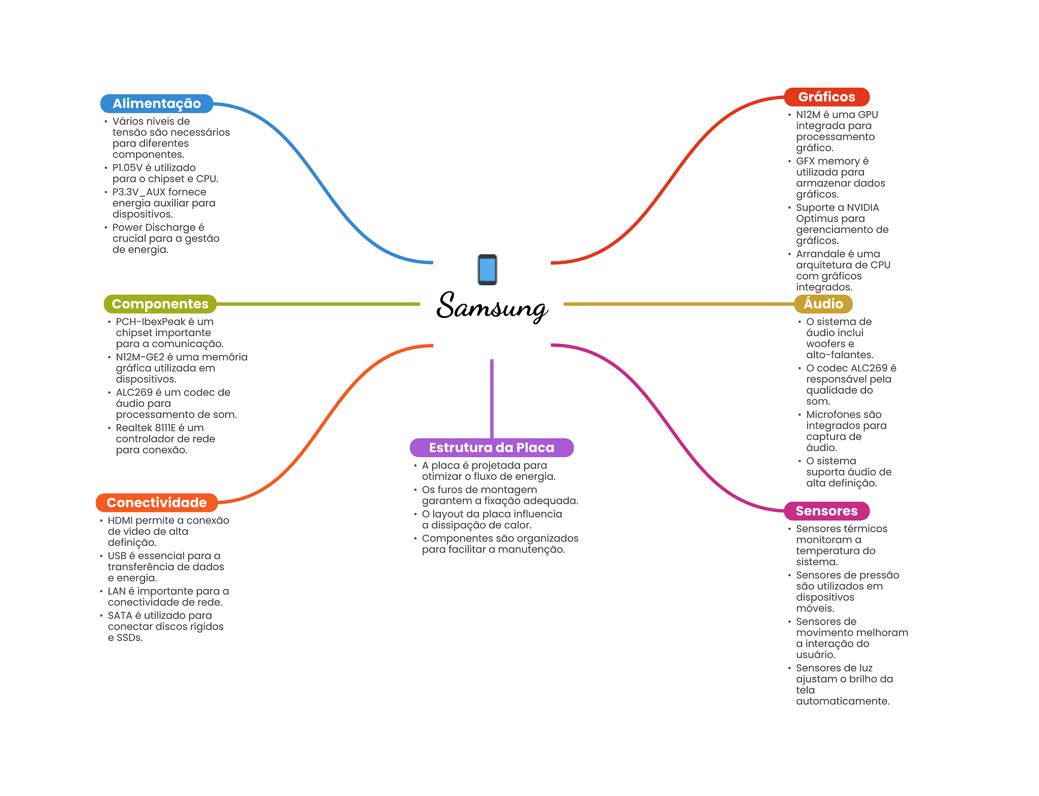 Gráficos Alimentação N12M é uma GPU Vários níveis de integrada para tensão são necessários processamento para diferentes gráfico. componentes. GFX memory é P1.05V é utilizado utilizada para para chipset e CPU. armazenar dados P3.3V_AUX fornece gráficos. energia auxiliar para Suporte a NVIDIA dispositivos. Optimus para Power Discharge é gerenciamento de crucial para a gestão gráficos. de energia. Arrandale é uma arquitetura de CPU com gráficos integrados. Componentes Samsung Áudio PCH-IbexPeak é um sistema de chipset importante áudio inclui para a comunicação. woofers e N12M-GE2 é uma memória alto-falantes. gráfica utilizada em codec ALC269 é dispositivos. responsável pela ALC269 é um codec de qualidade do áudio para som. processamento de som. Microfones são Realtek 8111E é um integrados para controlador de rede captura de para conexão. Estrutura da Placa áudio. A placa é projetada para sistema otimizar fluxo de energia. suporta áudio de alta definição. Os furos de montagem Conectividade garantem a fixação adequada. layout da placa influencia Sensores HDMI permite a conexão de vídeo de alta a dissipação de calor. Sensores térmicos definição. Componentes são organizados monitoram a para facilitar a manutenção. USB é essencial para a temperatura do sistema. transferência de dados e energia. Sensores de pressão são utilizados em LAN é importante para a conectividade de rede. dispositivos móveis. SATA é utilizado para Sensores de conectar discos rígidos movimento melhoram e SSDs. a interação do usuário. Sensores de luz ajustam brilho da tela automaticamente.