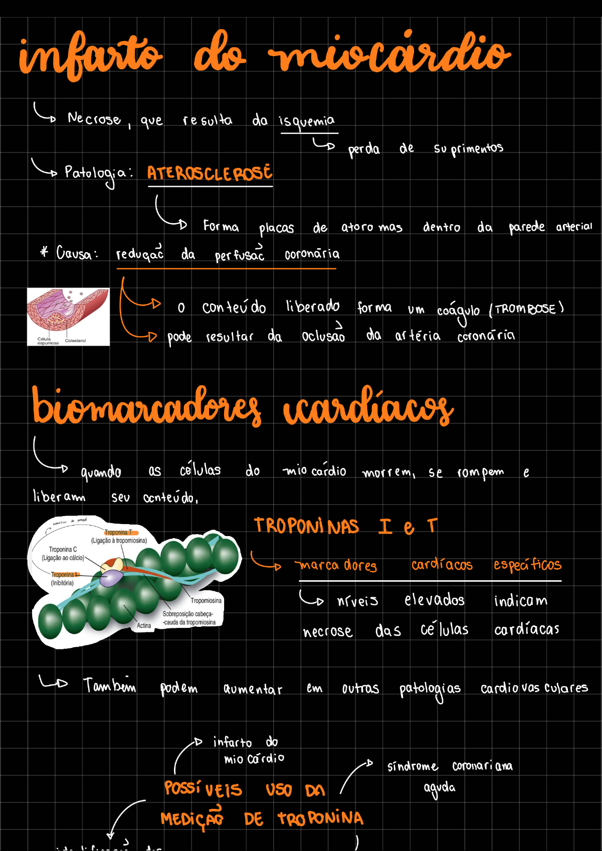 infarto do miocardio Necrose, que resulta da isquemia perda de suprimentos Patologia: Forma placas de dentro da parede arterial * Causa: da perfusac coronaria conteúdo liberado forma um coágulo (TROMBOSE) Célula Colesterol espumosa pode resultar da oclusao da artéria biomarcadores cardíacos quando as células do mio morrem, se rompem e liberam sev conteúdo, do Troponina (Ligação à tropomiosina) Troponina (Ligação ao cálcio) marca dores cardíacos específicos Troponina + (Inibitória) Tropomiosina níveis elevados indicam Sobreposição cabeça- Actina -cauda da tropomiosina necrose das celulas cardíacas podem aumentar em outras patologias cardiovas culares infarto do mio síndrome coronariana USO DA aguda DEpacientes que monitoramento de terapia as inter trombolitico diagnóstico Feito pelas eletro cardio gráficas ECG e pelu dos de lesac do miocárdio SÍNDROME AGUDA há suspeita de isquemia miocárdica. Pode ocorrer 1. infarto do ccm do seg mento ST 2. infarto do sem do segmento ST 3. anginina instavel Pode estar associado a ruptura de uma placa de ateroma .e a parcial de uma artéria INFARTO DO Ondas Q significam que a area da necrose miocardica Se estende por toda a espessura da parede sua indica I.M transmural cardíacas I e Sensíveis e Específicos A da creatina quinase indica do musculoi nac é ocnsistente para I.M MB proteína é mensurada como antigeno, sem depender de suas propriedades enzimaticas 0 exame de CW-MB massa, não é do miocardio CK-MB massa e CK total : relativo OU % relativa Indice Relativo SUGESTIVO DE LESAO CARDÍACA DEVE LiMiTE DE Sugestivo de I.M DA QUANTIDADE ABSOLUTA E DO I.R mioglobina proteína trans portadora de = HEME + elevados 2 a 3 horas OS inicios dos sintomas artinge 0 pico cerca de 6 infarto idade NÍVEiS da taxa de filtragao glomerular especificidade quando descartado renal lesac de musculo esquelético OUTROS MARCADORES IIImarcador negativo do musculo esqueletico) é liberada quando um é lesado enzima catalisa a primeila etapa da glico genolise dividida em: GPLL FÍGADO GP MM MUSCULO GP BB CERÉBRO CORAGAO liberada mais cedo que outros marcadores pode liberado em isquemias reversíveis Iet para I.M também aumentar em outras patologias ELEVAGAC DA indica quebra do