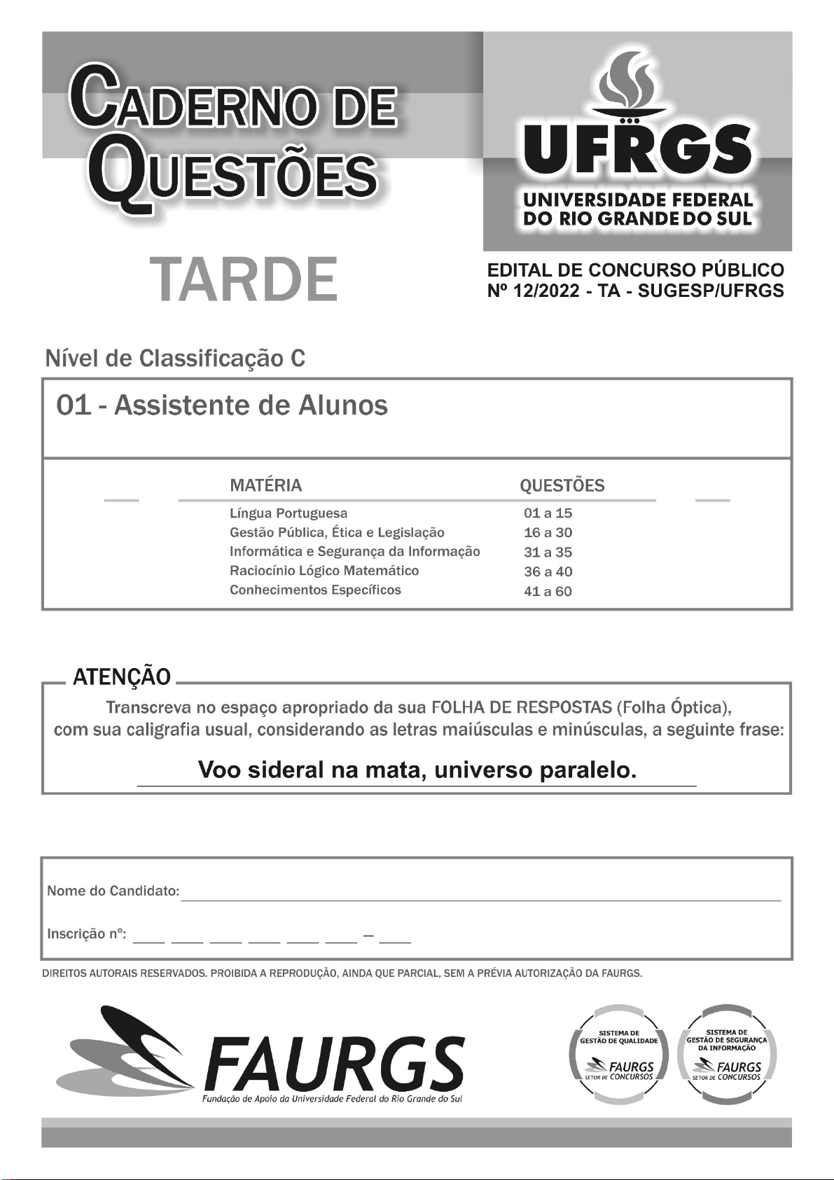 pcimarkpci MjgwNDo2ZmU4OjAxYzI6NGEwMDphNTA2OjNjOTg6YzI5OTphZWI5:VHVlLCAwMyBGZWIgMjAyNiAxMzo1NTowMyAtMDMwMA== www.pciconcursos.com.br FAURGS – SUGESP/UFRGS – Edital 12/2022 01 – Assistente de Alunos Pág. 1 pcimarkpci MjgwNDo2ZmU4OjAxYzI6NGEwMDphNTA2OjNjOTg6YzI5OTphZWI5:VHVlLCAwMyBGZWIgMjAyNiAxMzo1NTowMyAtMDMwMA== www.pciconcursos.com.br FAURGS – SUGESP/UFRGS – Edital 12/2022 01 – Assistente de Alunos Pág. 2 pcimarkpci MjgwNDo2ZmU4OjAxYzI6NGEwMDphNTA2OjNjOTg6YzI5OTphZWI5:VHVlLCAwMyBGZWIgMjAyNiAxMzo1NTowMyAtMDMwMA== www.pciconcursos.com.br FAURGS – SUGESP/UFRGS – Edital 12/2022 01 – Assistente de Alunos Pág. 3 Instrução: As questões 01 a 09 referem-se ao texto abaixo. Toda pessoa que fala uma determinada língua percebe diferenças em como os indivíduos pronunciam as palavras que _____ as frases e as palavras dessa língua. As características sonoras da fala são salientes e, por isso, identificamos logo se quem fala é do mesmo dialeto regional que o nosso ou não, se tem o mesmo status socioeconômico, se fala a mesma língua ou outra, entre outros aspectos. A maneira como os sons da fala são produzidos é rotulada como sotaque ou pronúncia. É comum ser feita referência a determi- nadas características sonoras da fala de algumas pessoas como “sotaque carregado” ou até mesmo que a pessoa fala “sem sotaque”. Normalmente, essas caracterizações da fala do outro se referem a como uma pessoa de uma determinada região fala. Podem também se referir __ como uma pessoa fala uma língua diferente da sua, se fala como os falantes nativos daquela língua ou trazendo características de sua própria língua nativa. Existe, de fato, a possibilidade de algum indivíduo falar “sem sotaque” sua própria língua ou uma língua estrangeira? Existem características sonoras das diferentes variedades de uma mesma língua ou entre diferentes línguas que são mais “suaves”, ao passo que outras seriam mais “carregadas” ou “fortes”? Para responder a essas indagações é preciso situar o que é sotaque do ponto de vista da ciência linguística. Sotaque diz respeito __ características sonoras da fala de qualquer indivíduo falante de qualquer língua. Essas características podem ser individuais, como a voz de quem fala, ou podem ser coletivas, tais como as diferenças percebidas entre falantes de diferentes faixas etárias, sexo ou gênero, status socioeconômico, etc. Podem corresponder também às diferenças entre variedades regionais ou dialetos de uma mesma língua, como as observadas entre indivíduos das diferentes regiões do Brasil. Por exemplo, cariocas e paulistanos diferem na maneira como produzem o som que corres- ponde à letra “s” na palavra festa, ou ainda o que corresponde à letra “r” na palavra porta. Essas diferenças podem ser caracterizadas como diferentes sotaques. São também consideradas sotaque as dife- renças sonoras mais gerais entre línguas com uma mesma origem, como as diferenças entre o português brasileiro e o português europeu, ou entre o inglês americano e o inglês britânico, ou mesmo aquelas que caracterizam o grau de proximidade ou distância com que uma pessoa fala uma língua estrangeira em relação a como os falantes nativos falam essa língua. A diversidade de sons presentes nas línguas pode ser observada se comparamos línguas diferentes entre si e também variedades da mesma língua. Portanto, toda língua, não importa o tamanho do país e nem a quantidade de pessoas que a falam, apresenta diversi- dade sonora, caracterizando diferenças regionais, etárias, de classe social, de gênero ou sexo, ou até mesmo dife- renças étnicas, a depender da organização sócio-histórica do povo que fala uma determinada língua. Adaptado de: GOMES, C. A. “O que é sotaque?”. In: OTHERO, G. A.; FLORES, V. N. O que sabemos sobre a linguagem. São Paulo: Parábola Editorial, 2022. 01. Assinale a alternativa que preenche corretamente as lacunas das linhas 03, 16 e 28. (A) compõe – a – às (B) compõem – a – as (C) compõe – à – às (D) compõem – a – às (E) compõem – à – a 02. Considere as seguintes afirmações acerca do texto. I - No primeiro parágrafo, a autora introduz o assunto e define o que é sotaque. II - No terceiro parágrafo, a autora fala sobre caracte- rísticas relativas ao sotaque e apresenta exemplos concretos ao leitor. III - No quarto parágrafo, a autora responde à segunda pergunta elencada por ela no segundo parágrafo. Quais estão corretas? (A) Apenas I. (B) Apenas II. (C) Apenas I e II. (D) Apenas II e III. (E) I, II e III. 03. É correto afirmar que o texto é predominantemente (A) narrativo. (B) informativo. (C) injuntivo. (D) descritivo. (E) dissertativo. 04. Assinale V (verdadeiro) ou F (falso) nas afirmações a seguir. ( ) Poderíamos inserir vírgulas antes de que (l. 01) e percebe (l. 02) sem incorrer em erro gramatical ou alterar o sentido original da frase. ( ) Poderíamos substituir a vírgula antes de por isso (l. 05) por um ponto e vírgula, sem incorrer em erro gramatical ou alterar o sentido original da frase. ( ) Poderíamos inserir uma vírgula antes do primeiro que da linha 24 sem incorrer em erro gramatical ou alterar o sentido original da frase. A sequência correta de preenchimento dos parênteses, de cima para baixo, é (A) V – F – F. (B) V – F – V. (C) F – V – V. (D) V – V – F. (E) F – F – F. 01. 02. 03. 04. 05. 06. 07. 08. 09. 10. 11. 12. 13. 14. 15. 16. 17. 18. 19. 20. 21. 22. 23. 24. 25. 26. 27. 28. 29. 30. 31. 32. 33. 34. 35. 36. 37. 38. 39. 40. 41. 42. 43. 44. 45. 46. 47. 48. 49. 50. 51. 52. 53. 54. 55. 56. 57. 58. pcimarkpci MjgwNDo2ZmU4OjAxYzI6NGEwMDphNTA2OjNjOTg6YzI5OTphZWI5:VHVlLCAwMyBGZWIgMjAyNiAxMzo1NTowMyAtMDMwMA== www.pciconcursos.com.br FAURGS – SUGESP/UFRGS – Edital 12/2022 01 – Assistente de Alunos Pág. 4 05. Relacione os números da primeira sequência aos parênteses da sequência de 