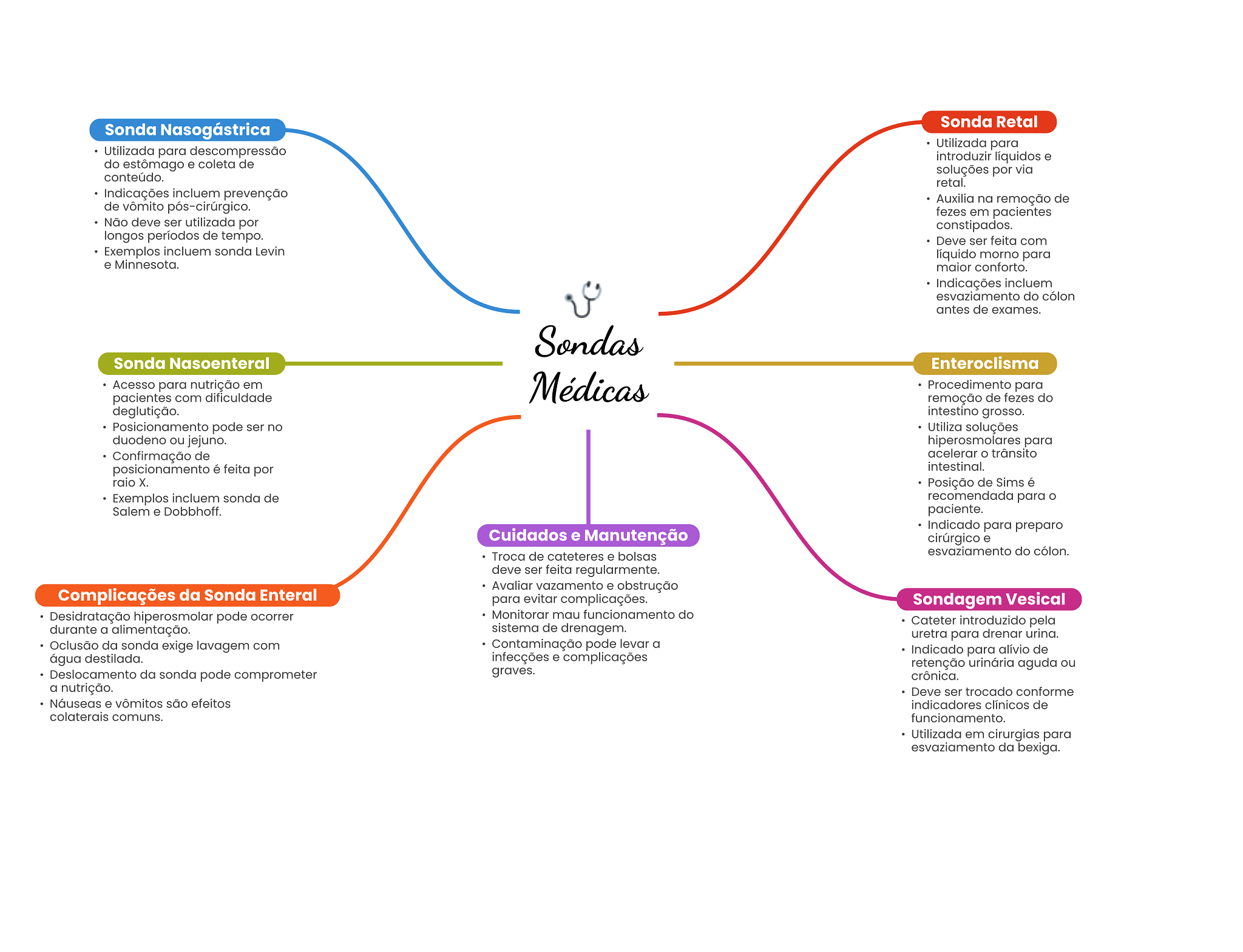 Sonda Retal Sonda Nasogástrica Utilizada para Utilizada para descompressão introduzir líquidos e do estômago e coleta de soluções por via conteúdo. retal. Indicações incluem prevenção Auxilia na remoção de de vômito pós-cirúrgico. fezes em pacientes Não deve ser utilizada por constipados. longos períodos de tempo. Deve ser feita com Exemplos incluem sonda Levin líquido morno para e Minnesota. maior conforto. Indicações incluem esvaziamento do cólon antes de exames. Sondas Sonda Nasoenteral Enteroclisma Acesso para nutrição em Médicas Procedimento para pacientes com dificuldade remoção de fezes do deglutição. intestino grosso. Posicionamento pode ser no Utiliza soluções duodeno ou jejuno. hiperosmolares para Confirmação de acelerar trânsito posicionamento é feita por intestinal. raio X. Posição de Sims é Exemplos incluem sonda de recomendada para O Salem e Dobbhoff. paciente. Indicado para preparo Cuidados e Manutenção cirúrgico e Troca de cateteres e bolsas esvaziamento do cólon. deve ser feita regularmente. Avaliar vazamento e obstrução Complicações da Sonda Enteral para evitar complicações. Sondagem Vesical Desidratação hiperosmolar pode ocorrer Monitorar mau funcionamento do Cateter introduzido pela durante a alimentação. sistema de drenagem. uretra para drenar urina. Oclusão da sonda exige lavagem com Contaminação pode levar a Indicado para alívio de água destilada. infecções e complicações retenção urinária ou Deslocamento da sonda pode comprometer graves. crônica. a nutrição. Deve ser trocado conforme Náuseas e vômitos são efeitos indicadores clínicos de colaterais comuns. funcionamento. Utilizada em cirurgias para esvaziamento da bexiga.
