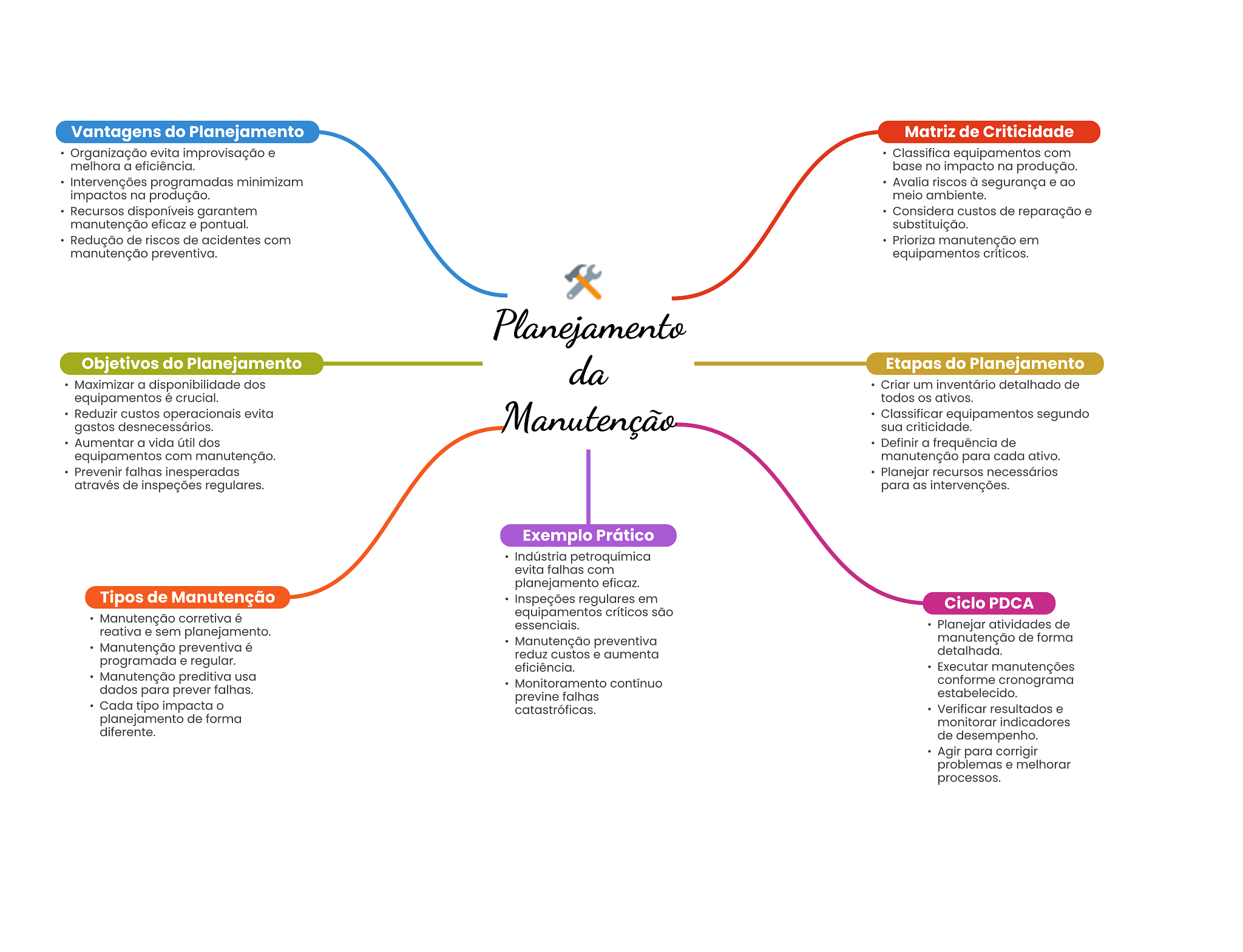 Vantagens do Planejamento Matriz de Criticidade Organização evita improvisação e Classifica equipamentos com melhora a eficiência. base no impacto na produção. Intervenções programadas minimizam Avalia riscos à segurança e ao impactos na produção. meio ambiente. Recursos disponíveis garantem Considera custos de reparação e manutenção eficaz e pontual. substituição. Redução de riscos de acidentes com Prioriza manutenção em manutenção preventiva. equipamentos críticos. Planejamento Objetivos do Planejamento da Etapas do Planejamento Maximizar a disponibilidade dos Criar um inventário detalhado de equipamentos é crucial. todos ativos. Reduzir custos operacionais evita gastos desnecessários. Manutenção Classificar equipamentos segundo sua criticidade. Aumentar a vida útil dos Definir a frequência de equipamentos com manutenção. manutenção para cada ativo. Prevenir falhas inesperadas Planejar recursos necessários através de inspeções regulares. para as intervenções. Exemplo Prático Indústria petroquímica evita falhas com planejamento eficaz. Tipos de Manutenção Inspeções regulares em Ciclo PDCA Manutenção corretiva é equipamentos críticos são essenciais. Planejar atividades de reativa e sem planejamento. Manutenção preventiva é Manutenção preventiva manutenção de forma reduz custos e aumenta detalhada. programada e regular. eficiência. Executar manutenções Manutenção preditiva usa Monitoramento contínuo conforme cronograma dados para prever falhas. previne falhas estabelecido. Cada tipo impacta catastróficas. Verificar resultados e planejamento de forma monitorar indicadores diferente. de desempenho. Agir para corrigir problemas e melhorar processos.