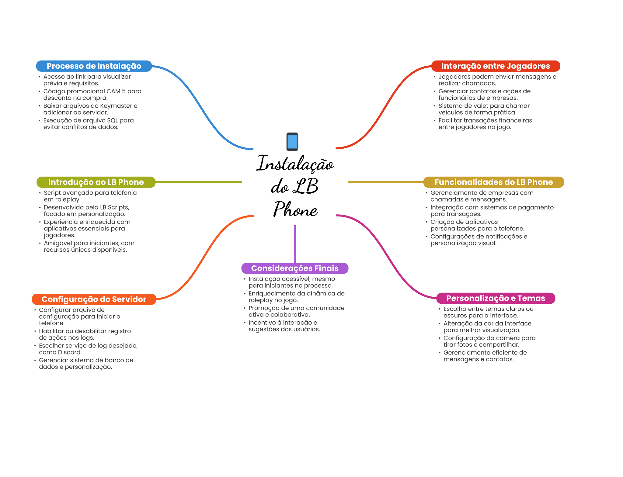 Processo de Instalação Interação entre Jogadores Acesso ao link para visualizar Jogadores podem enviar mensagens e prévia e requisitos. realizar chamadas. Código promocional CAM 5 para Gerenciar contatos e ações de desconto na compra. funcionários de empresas. Baixar arquivos do Keymaster e Sistema de valet para chamar adicionar ao servidor. veículos de forma prática. Execução de arquivo SQL para Facilitar transações financeiras evitar conflitos de dados. entre jogadores no jogo. Instalação Introdução ao LB Phone do LB Funcionalidades do LB Phone Script avançado para telefonia Gerenciamento de empresas com em roleplay. chamadas e mensagens. Desenvolvido pela LB Scripts, Phone Integração com sistemas de pagamento focado em personalização. para transações. Experiência enriquecida com Criação de aplicativos aplicativos essenciais para personalizados para telefone. jogadores. Configurações de notificações e Amigável para iniciantes, com personalização visual. recursos únicos disponíveis. Considerações Finais Instalação acessível, mesmo para iniciantes no processo. Enriquecimento da dinâmica de Configuração do Servidor roleplay no jogo. Personalização e Temas Configurar arquivo de Promoção de uma comunidade Escolha entre temas claros ou configuração para iniciar ativa e colaborativa. escuros para a interface. telefone. Incentivo à interação e Alteração da cor da interface Habilitar ou desabilitar registro sugestões dos usuários. para melhor visualização. de ações nos logs. Configuração da câmera para Escolher serviço de log desejado, tirar fotos e compartilhar. como Discord. Gerenciamento eficiente de Gerenciar sistema de banco de mensagens e contatos. dados e personalização.