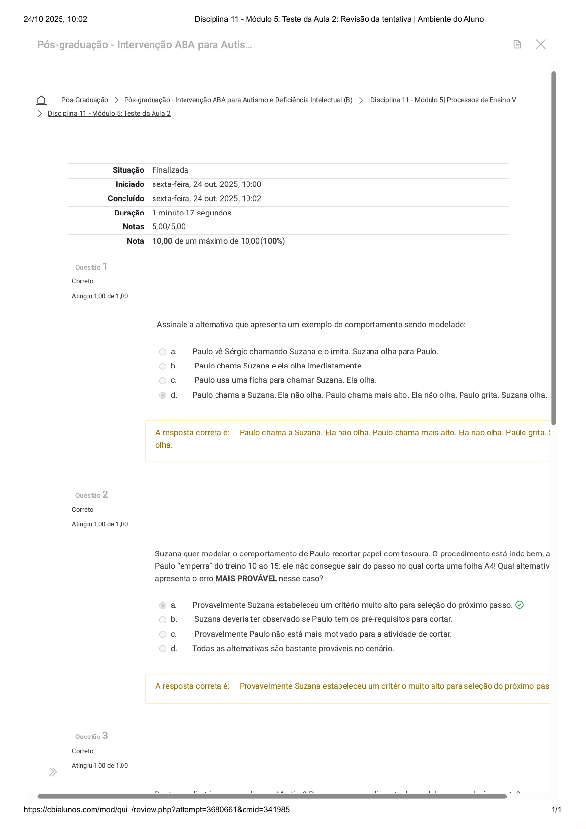 Pós-Graduação Pós-graduação - Intervenção ABA para Autismo e Deficiência Intelectual (B) [Disciplina 11 - Módulo 5] Processos de Ensino V Disciplina 11 - Módulo 5: Teste da Aula 2 Questão 1 Correto Atingiu 1,00 de 1,00 Questão 2 Correto Atingiu 1,00 de 1,00 Questão 3 Correto Atingiu 1,00 de 1,00 Assinale a alternativa que apresenta um exemplo de comportamento sendo modelado: a. Paulo vê Sérgio chamando Suzana e o imita. Suzana olha para Paulo. b. Paulo chama Suzana e ela olha imediatamente. c. Paulo usa uma ficha para chamar Suzana. Ela olha. d. Paulo chama a Suzana. Ela não olha. Paulo chama mais alto. Ela não olha. Paulo grita. Suzana olha. A resposta correta é: Paulo chama a Suzana. Ela não olha. Paulo chama mais alto. Ela não olha. Paulo grita. S olha. Suzana quer modelar o comportamento de Paulo recortar papel com tesoura. O procedimento está indo bem, a Paulo “emperra” do treino 10 ao 15: ele não consegue sair do passo no qual corta uma folha A4! Qual alternativ apresenta o erro MAIS PROVÁVEL nesse caso? a. Provavelmente Suzana estabeleceu um critério muito alto para seleção do próximo passo. b. Suzana deveria ter observado se Paulo tem os pré-requisitos para cortar. c. Provavelmente Paulo não está mais motivado para a atividade de cortar. d. Todas as alternativas são bastante prováveis no cenário. A resposta correta é: Provavelmente Suzana estabeleceu um critério muito alto para seleção do próximo pas D t di t i id M ti & P di t d d l l i t ? Situação Finalizada Iniciado sexta-feira, 24 out. 2025, 10:00 Concluído sexta-feira, 24 out. 2025, 10:02 Duração 1 minuto 17 segundos Notas 5,00/5,00 Nota 10,00 de um máximo de 10,00(100%) Pós-graduação - Intervenção ABA para Autis… 24/10/2025, 10:02 Disciplina 11 - Módulo 5: Teste da Aula 2: Revisão da tentativa | Ambiente do Aluno https://cbialunos.com/mod/quiz/review.php?attempt=3680661&cmid=341985 1/1 https://cbialunos.com/course/index.php?categoryid=7 https://cbialunos.com/course/view.php?id=488 https://cbialunos.com/course/section.php?id=15269 https://cbialunos.com/mod/quiz/view.php?id=341985 https://cbialunos.com/my/courses.php https://cbialunos.com/course/view.php?id=488 https://cbialunos.com/course/view.php?id=488&mb2sct=43