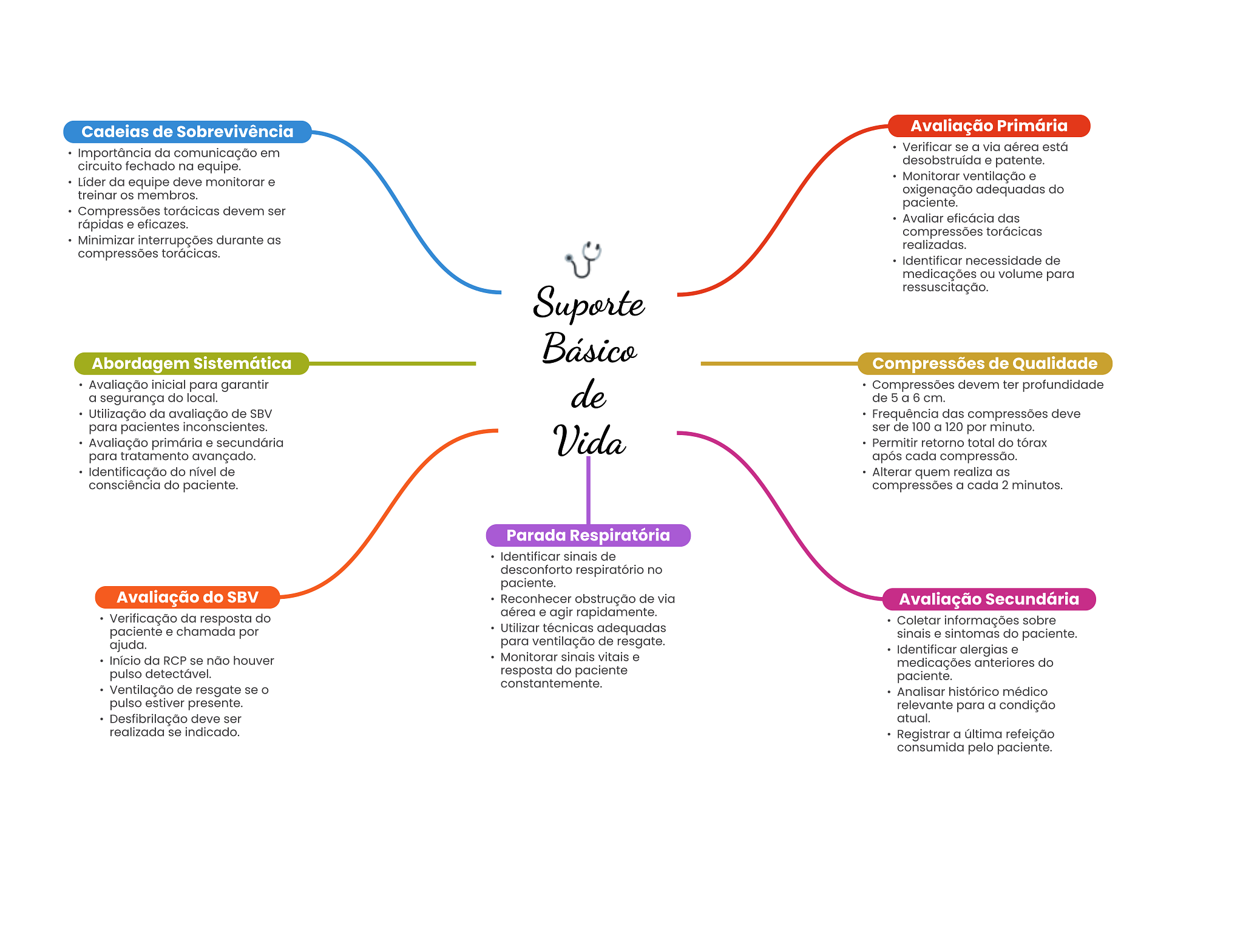 Cadeias de Sobrevivência Avaliação Primária Verificar se a via aérea está Importância da comunicação em circuito fechado na equipe. desobstruída e patente. Líder da equipe deve monitorar e Monitorar ventilação e treinar membros. oxigenação adequadas do paciente. Compressões torácicas devem ser Avaliar eficácia das rápidas e eficazes. compressões torácicas Minimizar interrupções durante as realizadas. compressões torácicas. Identificar necessidade de medicações ou volume para ressuscitação. Suporte Básico Abordagem Sistemática Compressões de Qualidade Avaliação inicial para garantir de Compressões devem ter profundidade a segurança do local. de 5 a 6 cm. Utilização da avaliação de SBV Frequência das compressões deve para pacientes inconscientes. Avaliação primária e secundária Vida ser de 100 a 120 por minuto. Permitir retorno total do tórax para tratamento avançado. após cada compressão. Identificação do nível de Alterar quem realiza as consciência do paciente. compressões a cada 2 minutos. Parada Respiratória Identificar sinais de desconforto respiratório no paciente. Avaliação do SBV Reconhecer obstrução de via Avaliação Secundária Verificação da resposta do aérea e agir rapidamente. Coletar informações sobre paciente e chamada por Utilizar técnicas adequadas sinais e sintomas do paciente. ajuda. para ventilação de resgate. Início da RCP se não houver Monitorar sinais vitais e Identificar alergias e medicações anteriores do pulso detectável. resposta do paciente paciente. constantemente Ventilação de resgate se Analisar histórico médico pulso estiver presente. relevante para a condição Desfibrilação deve ser atual. realizada se indicado. Registrar a última refeição consumida pelo paciente.