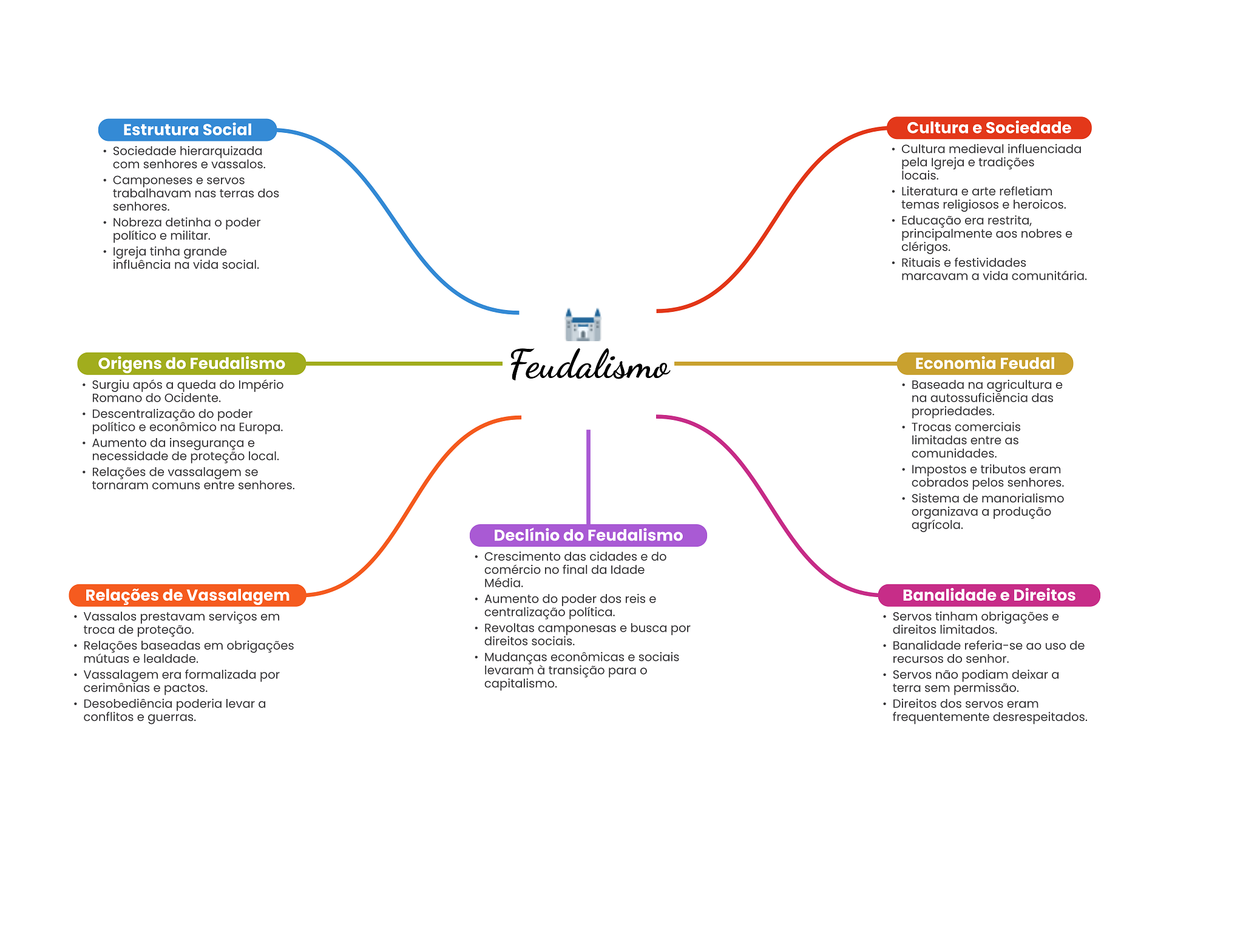 Estrutura Social Cultura e Sociedade Sociedade hierarquizada Cultura medieval influenciada com senhores e vassalos. pela Igreja e tradições Camponeses e servos locais. trabalhavam nas terras dos Literatura e arte refletiam senhores. temas religiosos e heroicos. Nobreza detinha poder Educação era restrita, político e militar. aos nobres e Igreja tinha grande clérigos. influência na vida social. Rituais e festividades marcavam a vida comunitária. Origens do Feudalismo Feudalismo Economia Feudal Surgiu após a queda do Império Baseada na agricultura e Romano do Ocidente. na autossuficiência das Descentralização do poder propriedades. político e econômico na Europa. Trocas comerciais Aumento da insegurança e limitadas entre as necessidade de proteção local. comunidades. Relações de vassalagem se Impostos e tributos eram tornaram comuns entre senhores. cobrados pelos senhores. Sistema de manorialismo organizava a produção agrícola. Declínio do Feudalismo Crescimento das cidades e do comércio no final da Idade Média. Relações de Vassalagem Aumento do poder dos reis e Banalidade e Direitos Vassalos prestavam serviços em centralização política. Servos tinham obrigações e troca de proteção. Revoltas camponesas e busca por direitos limitados. Relações baseadas em obrigações direitos sociais. Banalidade referia-se ao uso de mútuas e lealdade. Mudanças econômicas e sociais recursos do senhor. Vassalagem era formalizada por levaram à transição para O Servos não podiam deixar a cerimônias e pactos. capitalismo. terra sem permissão. Desobediência poderia levar a Direitos dos servos eram conflitos e guerras. frequentemente desrespeitados.