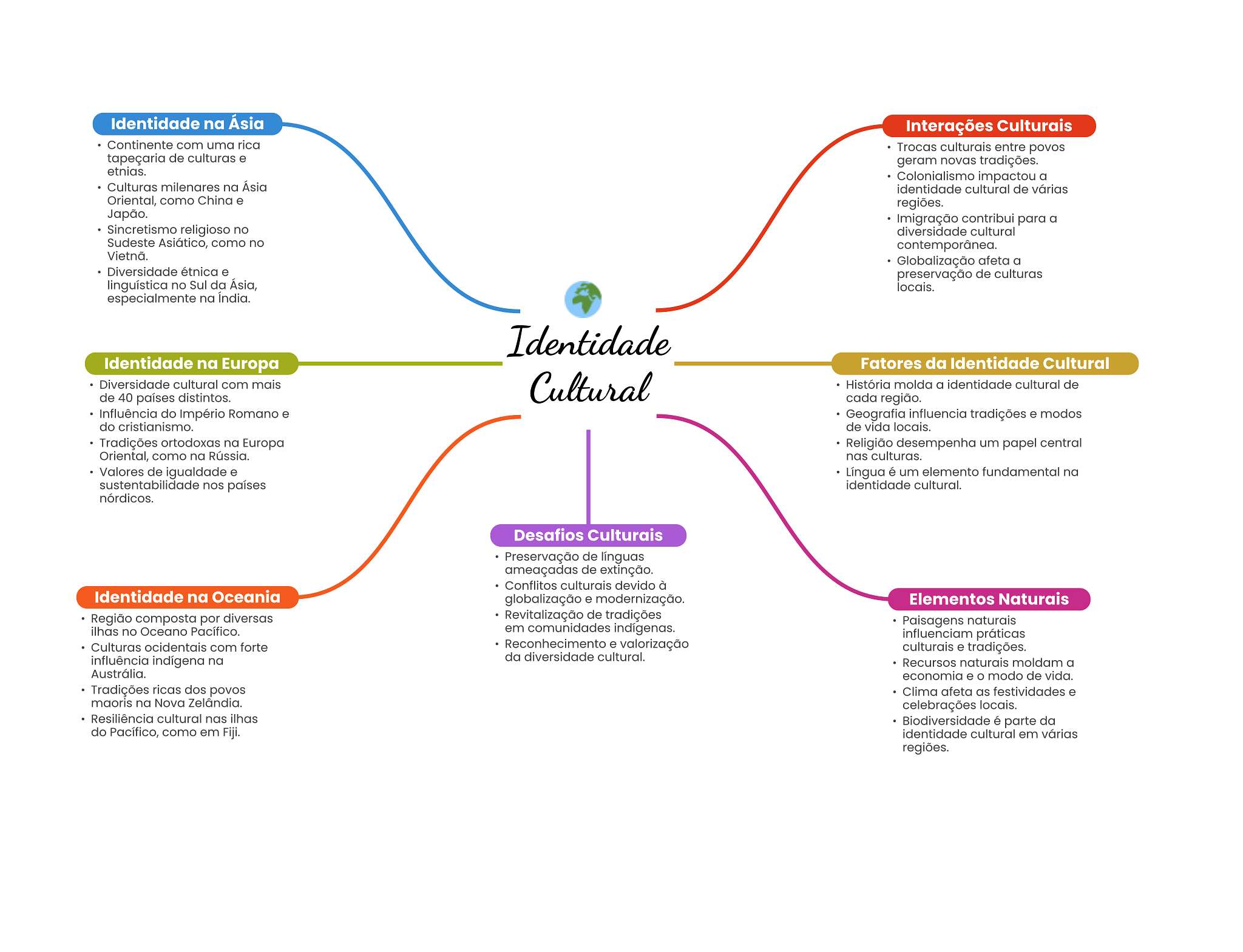 Identidade na Ásia Interações Culturais Continente com uma rica Trocas culturais entre povos tapeçaria de culturas e geram novas tradições. etnias. Colonialismo impactou a Culturas milenares na Ásia identidade cultural de várias Oriental, como China e regiões. Japão. Imigração contribui para a Sincretismo religioso no diversidade cultural Sudeste Asiático, como no contemporânea. Vietnã. Globalização afeta a Diversidade étnica e preservação de culturas linguística no Sul da Ásia, locais. especialmente na India. Identidade Identidade na Europa Fatores da Identidade Cultural Diversidade cultural com mais de 40 países distintos. Cultural História molda a identidade cultural de cada região. Influência do Império Romano e Geografia influencia tradições e modos do cristianismo. de vida locais. Tradições ortodoxas na Europa Religião desempenha um papel central Oriental, como na Rússia. nas culturas. Valores de igualdade e Língua é um elemento fundamental na sustentabilidade nos países identidade cultural. nórdicos. Desafios Culturais Preservação de línguas ameaçadas de extinção. Conflitos culturais devido à Identidade na Oceania globalização e modernização. Elementos Naturais Região composta por diversas Revitalização de tradições Paisagens naturais ilhas no Oceano Pacífico. em comunidades indígenas. influenciam práticas Culturas ocidentais com forte Reconhecimento e valorização culturais e tradições. influência indígena na da diversidade cultural. Recursos naturais moldam a Austrália. economia e O modo de vida. Tradições ricas dos povos Clima afeta as festividades e maoris na Nova Zelândia. celebrações locais. Resiliência cultural nas ilhas Biodiversidade é parte da do Pacífico, como em Fiji. identidade cultural em várias regiões.