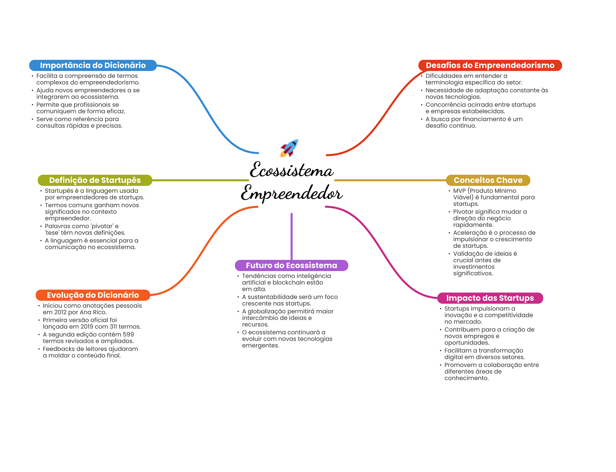 Importância do Dicionário Desafios do Empreendedorismo Facilita a compreensão de termos Dificuldades em entender a complexos do terminologia específica do setor. Ajuda novos empreendedores a se Necessidade de adaptação constante às integrarem ao ecossistema. novas tecnologias. Permite que profissionais se Concorrência acirrada entre startups comuniquem de forma eficaz. e empresas estabelecidas. Serve como referência para A busca por financiamento é um consultas rápidas e precisas. desafio contínuo. Ecossistema Definição de Startupês Conceitos Chave Startupês é a linguagem usada por empreendedores de startups. Empreendedor MVP (Produto Mínimo Viável) é fundamental para Termos comuns ganham novos startups. significados no contexto Pivotar significa mudar a empreendedor. direção do negócio Palavras como 'pivotar' e rapidamente. 'tese' têm novas definições. Aceleração é processo de A linguagem é essencial para a impulsionar O crescimento comunicação no ecossistema. de startups. Validação de ideias é crucial antes de Futuro do Ecossistema investimentos Tendências como inteligência significativos. artificial e blockchain estão em alta. Evolução do Dicionário A sustentabilidade será um foco Impacto das Startups Iniciou como anotações pessoais crescente nas startups. em 2012 por Ana Rico. A globalização permitirá maior Startups impulsionam a Primeira versão oficial foi intercâmbio de ideias e inovação e a competitividade no mercado. lançada em 2019 com 311 termos. recursos. ecossistema continuará a Contribuem para a criação de A segunda edição contém 599 evoluir com novas tecnologias novos empregos e termos revisados e ampliados. Feedbacks de leitores ajudaram emergentes. oportunidades. Facilitam a transformação a moldar conteúdo final. digital em diversos setores. Promovem a colaboração entre diferentes áreas de conhecimento.