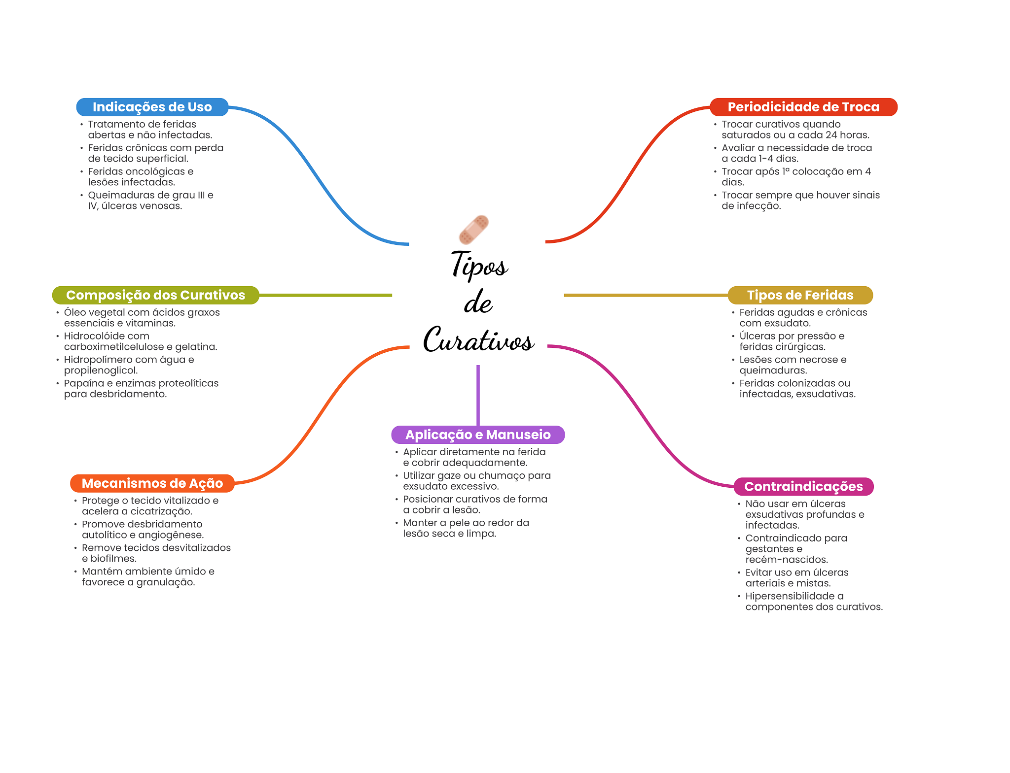 Indicações de Uso Periodicidade de Troca Tratamento de feridas Trocar curativos quando abertas e não infectadas. saturados ou a cada 24 horas. Feridas crônicas com perda Avaliar a necessidade de troca de tecido superficial. a cada 1-4 dias. Feridas oncológicas e Trocar após colocação em 4 lesões infectadas. dias. Queimaduras de grau III e Trocar sempre que houver sinais IV, úlceras venosas. de infecção. Tipos Composição dos Curativos de Tipos de Feridas Óleo vegetal com ácidos graxos Feridas agudas e crônicas essenciais e vitaminas. com exsudato. Hidrocolóide com carboximetilcelulose e gelatina. Curativos Úlceras por pressão e feridas cirúrgicas. Hidropolímero com água e Lesões com necrose e propilenoglicol. queimaduras. Papaína e enzimas proteolíticas Feridas colonizadas ou para desbridamento. infectadas, exsudativas. Aplicação e Manuseio Aplicar diretamente na ferida e cobrir adequadamente. Utilizar gaze ou chumaço para Mecanismos de Ação exsudato excessivo. Contraindicações Protege tecido vitalizado e Posicionar curativos de forma Não usar em úlceras acelera a cicatrização. a cobrir a lesão. exsudativas profundas e Promove desbridamento Manter a pele ao redor da infectadas. autolítico e angiogênese. lesão seca e limpa. Contraindicado para Remove tecidos desvitalizados gestantes e e biofilmes. recém-nascidos. Mantém ambiente úmido e Evitar uso em úlceras favorece a granulação. arteriais e mistas. Hipersensibilidade a componentes dos curativos.
