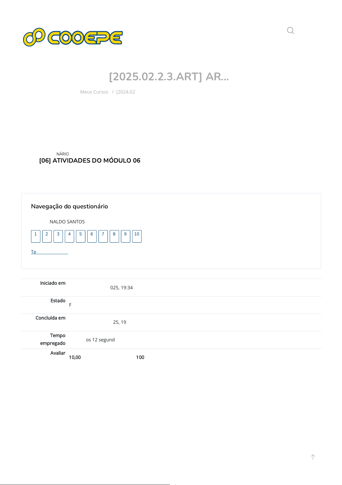 [2025.02.2.3.ART] AR… Meus Cursos / [2024.02.2.3.ART] / Atividades / [06] ATIVIDADES DO MÓDULO 06 Iniciado em terça-feira, 7 out. 2025, 19:34 Estado Finalizada Concluída em terça-feira, 7 out. 2025, 19:38 Tempo empregado 3 minutos 12 segundos Avaliar 10,00 de um máximo de 10,00(100%) Navegação do questionário RS RONALDO SANTOS Terminar revisão 1 2 3 4 5 6 7 8 9 10 QUESTIONÁRIO [06] ATIVIDADES DO MÓDULO 06 https://eadcooepe.com.br/my/courses.php https://eadcooepe.com.br/course/view.php?id=3767 https://eadcooepe.com.br/course/view.php?id=3767#section-1 https://eadcooepe.com.br/mod/quiz/view.php?id=57088 https://eadcooepe.com.br/user/view.php?id=67114&course=3767 https://eadcooepe.com.br/mod/quiz/view.php?id=57088 https://eadcooepe.com.br/ QUESTÃO Correto Atingiu 1,00 de 1,00 QUESTÃO Correto Atingiu 1,00 de 1,00 1 Conhecido internacionalmente, e com a ajuda de sua principal interprete, Carmem Miranda. Compôs músicas, como "Aquarela do Brasil” e " No Tabuleiro da Baiana”. Também foi um dos destaques da M.P.B. ( 1902-1964). Este músico é: Escolha uma opção: a. Pixinguinha b. Noel Rosa c. Heitor Villa-Lobos d. Ary Barroso A resposta correta é: Ary Barroso Correto Notas para este envio: 1,00/1,00. 2 O que os índios chamam de Natapu? Escolha uma opção: a. Machadinha para cortar troncos. b. Instrumento feito de tronco de árvore. c. Flauta feita de osso para atrair peixes. d. O Deus dos índios. Sua resposta está correta. A resposta correta é: Flauta feita de osso para atrair peixes. Correto Notas para este envio: 1,00/1,00. QUESTÃO Correto Atingiu 1,00 de 1,00 QUESTÃO Correto Atingiu 1,00 de 1,00 3 Os engenhos de farinha surgiram em Santa Catarina com a ______. Escolha uma opção: a. colonização açoriana. b. colonização inglesa. c. colonização japonesa. d. colonização francesa. Sua resposta está correta. A resposta correta é: colonização açoriana. Correto Notas para este envio: 1,00/1,00. 4 A proposta da "...................”era introduzir inovações na melodia com harmonia menos tradicional e interpretação mais descontraída. Essa proposta era de quem? Escolha uma opção: a. Bossa Nova b. Nova Geração c. Da Semana da Arte Moderna d. Musica Popular Brasileira A resposta correta é: Bossa Nova Correto Notas para este envio: 1,00/1,00. QUESTÃO Correto Atingiu 1,00 de 1,00 QUESTÃO Correto Atingiu 1,00 de 1,00 5 Quais as raças que influenciaram a música brasileira, nos seus primórdios? Escolha uma opção: a. Americanos. b. Índios, negros e europeus. c. Europeus. d. Americanos e europeus. Sua resposta está correta. A resposta correta é: Índios, negros e europeus. Correto Notas para este envio: 1,00/1,00. 6 Música..........................é a música feita pelo povo, sem autor conhecido. Sua transmissão é oral.: Escolha uma opção: a. folclórica b. Jovem Guarda c. folclórica brasileira d. Nova Geração A resposta correta é: folclórica Correto Notas para este envio: 1,00/1,00. QUESTÃO Correto Atingiu 1,00 de 1,00 QUESTÃO Correto Atingiu 1,00 de 1,00 7 Autor da ópera "O Guarani” Escolha uma opção: a. Ary Barroso b. Heitor Vila Lobos c. Antônio Carlos Gomes d. Francisco Manoel da Silva A resposta correta é: Antônio Carlos Gomes Correto Notas para este envio: 1,00/1,00. 8 A ópera "O Guarani” é de ____. Escolha uma opção: a. Roberto Carlos. b. Antônio Carlos Gomes. c. Os Incríveis. d. Gilberto Gil. Sua resposta está correta. A resposta correta é: Antônio Carlos Gomes. Correto Notas para este envio: 1,00/1,00. QUESTÃO Correto Atingiu 1,00 de 1,00 QUESTÃO Correto Atingiu 1,00 de 1,00 9 Qual música do movimento da Jovem Guarda, e de Roberto Carlos, que fez muito sucesso? Escolha uma opção: a. É proibido proibir. b. Quero que vá tudo pro Inferno. c. Iê-iê-iê. d. Alegria,alegria. Sua resposta está correta. A resposta correta é: Quero que vá tudo pro Inferno. Correto Notas para este envio: 1,00/1,00. 10 O boi-de-mamão é uma manifestação folclórica que ocorre no estado de Santa Catarina sendo encenado principalmente na região litorânea. Com origem nas brincadeiras com o boi, feitas nos Açores, tem como figuras principais: Escolha uma opção: a. o cavalinho, o boi garantido, o saci, a maricota, a bernuncia, a cuca b. o boi, o saci, a bernuncia, a maricota, a viúva, o cavalinho c. o boi, a bernuncia, a maricota, o doutor ,a viúva, o cavalinho d. a cuca, o saci, a maricota, o cavalinho, o boi, a viúva A resposta correta é: o boi, a bernuncia, a maricota, o doutor ,a viúva, o cavalinho Correto Notas para este envio: 1,00/1,00. ◄ [05] ATIVIDADES DO MÓDULO 05 Seguir para... Arte 3 ► https://eadcooepe.com.br/mod/quiz/view.php?id=57087&forceview=1 https://eadcooepe.com.br/mod/resource/view.php?id=56170&forceview=1 Contato MATRIZ Rua Álvaro Medeiros Santiago, nº 116 Bairro Areias Areias – São José - SC 88113-600 Telefone: (48) 3346-0077 Email: cooepe@cooepe.com.br APP App Store Instale no seu dispositivo Google Play Instale no seu dispositivo Flexibilidade de estudos e professores qualificados à sua disposição! Copyright © 2024 COOEPE. All Rights Reserved. mailto:cooepe@cooepe.com.br https://apps.apple.com/br/app/cooepe/id1520323621 https://apps.apple.com/br/app/cooepe/id1520323621 https://apps.apple.com/br/app/cooepe/id1520323621 https://apps.apple.com/br/app/cooepe/id1520323621 https://apps.apple.com/br/app/cooepe/id1520323621 https://play.google.com/store/apps/details?id=com.gtecnologia.eadcooepe https://play.google.com/store/apps/details?id=com.gtecnologia.eadcooepe https://play.google.com/store/apps/details?id=com.gtecnologia.eadcooepe https://play.google.com/store/apps/details?id=com.gtecnologia.eadcooepe https://play.google.com/store/apps/details?id=com.gtecnologia.eadcooepe https://www.facebook.com/CooepeSC https://www.facebook.com/CooepeSC https://www.instagram.com/cooepesc/ https://www.instagram.com/cooepesc/