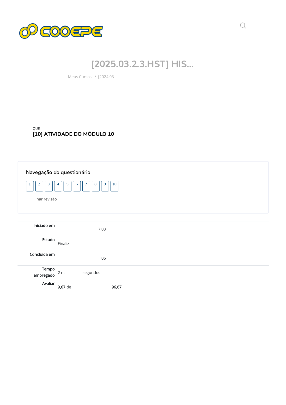 [2025.03.2.3.HST] HIS… Meus Cursos / [2024.03.2.3.HST] / Atividades / [10] ATIVIDADE DO MÓDULO 10 Iniciado em sábado, 6 dez. 2025, 07:03 Estado Finalizada Concluída em sábado, 6 dez. 2025, 07:06 Tempo empregado 2 minutos 29 segundos Avaliar 9,67 de um máximo de 10,00(96,67%) Navegação do questionário Terminar revisão 1 2 3 4 5 6 7 8 9 10 QUESTIONÁRIO [10] ATIVIDADE DO MÓDULO 10 https://eadcooepe.com.br/my/courses.php https://eadcooepe.com.br/course/view.php?id=3788 https://eadcooepe.com.br/course/view.php?id=3788#section-1 https://eadcooepe.com.br/mod/quiz/view.php?id=56359 https://eadcooepe.com.br/mod/quiz/view.php?id=56359 https://eadcooepe.com.br/ QUESTÃO Correto Atingiu 1,00 de 1,00 QUESTÃO Correto Atingiu 1,00 de 1,00 1 (Prof. Fábio Garcia) Luís Carlos Prestes líder da Aliança Nacional Libertadora, comunista, teve sua vida retratada em romance escrito por Jorge Amado em 1942, intitulado: Escolha uma opção: a. Luís Carlos Prestes: vida e obra. b. O grande Comunista. c. O Cavaleiro da Esperança. d. O amigo da Rússia. Sua resposta está correta. A resposta correta é: O Cavaleiro da Esperança. Correto Notas para este envio: 1,00/1,00. 2 (Prof. Fábio Garcia) Lima Barreto, importante escritor popular do início do século XX, foi autor de diversas obras de grande influência na cultura literária do país. Dos títulos abaixo apenas um é do referido autor. Assinale a alternativa correta. Escolha uma opção: a. Tenda dos Milagres. b. A volta ao mundo em oitenta dias. c. Clara dos Anjos. d. O Alienista. Sua resposta está correta. A resposta correta é: Clara dos Anjos. Correto Notas para este envio: 1,00/1,00. QUESTÃO Correto Atingiu 1,00 de 1,00 3 (Prof. Fábio Garcia) Leia atentamente o trecho da música de João Bosco, intitulada "O Dragão do Mar” e responda: "Há muito tempo nas águas Da guanabara O dragão no mar reapareceu Na figura de um bravo Feiticeiro A quem a história Não esqueceu Conhecido como Navegante negro Tinha a dignidade de um Mestre-sala” A música de João Bosco faz referência a qual acontecimento histórico? Escolha uma opção: a. Guerra de Canudos. b. Revolta da Armada. c. Revolta da Vacina. d. Revolta da Chibata. Sua resposta está correta. A resposta correta é: Revolta da Chibata. Correto Notas para este envio: 1,00/1,00. QUESTÃO Correto Atingiu 1,00 de 1,00 QUESTÃO Correto Atingiu 1,00 de 1,00 4 (Prof. Alvim Siqueira) Sobre a república velha assinale a alternativa correta. Escolha uma opção: a. Todas as alternativas anteriores estão corretas. b. Período político Brasileiro que iniciou-se em 1889 e terminou em 1930. c. Com a queda da monarquia o regime político Brasileiro passou a chamar-se república. d. A revolução de 1930 marcou o fim da república velha no Brasil. Sua resposta está correta. A resposta correta é: Todas as alternativas anteriores estão corretas. Correto Notas para este envio: 1,00/1,00. 5 (Prof. Alvim Siqueira) A coluna prestes representava: Escolha uma opção: a. Quem comandava esta organização era Luiz Carlos Prestes. b. Era uma organização contra as oligarquias. c. A coluna prestes foi uma organização política que incentivava as populações a se rebelarem contra o poder dos coronéis. d. Todas as alternativas anteriores estão corretas. Sua resposta está correta. A resposta correta é: Todas as alternativas anteriores estão corretas. Correto Notas para este envio: 1,00/1,00. QUESTÃO Correto Atingiu 1,00 de 1,00 QUESTÃO Correto Atingiu 1,00 de 1,00 6 (Prof. Fábio Garcia) A respeito da guerra do contestado assinale a alternativa que contenha informações corretas quanto os aspectos sociais, políticos, econômicos e bélicos do sobre o tema: Escolha uma opção: a. Plantio de erva mate - disputa de terras entre Santa Catarina e Rio Grande do Sul - uso de helicópteros como arma de guerra. b. Extração de erva-mate e madeiras - disputa da fronteira entre Santa Catarina e Paraná - uso de aviões como arma de guerra. c. Extração de erva-mate e madeiras - disputa da fronteira entre Santa Catarina e Paraná - uso de helicópteros como arma de guerra. d. Extração de madeiras - disputas de terras entre camponeses de Santa Catarina e do Paraná - uso do navio encouraçado Minas Gerais no conflito. Sua resposta está correta. A resposta correta é: Extração de erva-mate e madeiras - disputa da fronteira entre Santa Catarina e Paraná - uso de aviões como arma de guerra. Correto Notas para este envio: 1,00/1,00. 7 (Prof. Fábio Garcia) Quais conflitos sociais conferiram a Floriano Peixoto o título de "Marechal de Ferro”. Escolha uma opção: a. Guerra do Paraguai e Revolta da Armada. b. Revolta da Armada e Revolução Federalista. c. Revolução Federalista e Guerra do Contestado. d. Guerra do Paraguai e Guerra do Contestado. Sua resposta está correta. A resposta correta é: Revolta da Armada e Revolução Federalista. Correto Notas para este envio: 1,00/1,00. QUESTÃO Correto Atingiu 0,67 de 1,00 QUESTÃO Correto Atingiu 1,00 de 1,00 8 (Prof. Fábio Garcia) Na década de 30 houve a descoberta do plano Cohen, segundo o serviço de inteligência do governo Vargas ele teria por objetivo: Escolha uma opção: a. Implementar o Estado Novo. b. Derrubar o governo por meio de um golpe político. c. Nacionalizar as empresas produtoras de petróleo. d. Promover a Revolta Constitucionalista. Sua resposta está correta. A resposta correta é: Derrubar o governo por meio de um golpe político. Correto Notas para o envio: 1,00/1,00. De acordo com as tentativas anteriores 0,67/1,00. 9 (Prof. Fábio Garcia) Em 1945 houve um movimento em prol da permanência de Getúlio Vargas na presidência da República. Este movimento foi chamado de: Escolha uma opção: a. Varguismo. b. Fica Presidente. c. Queremismo. d. Nenhuma das alternativas acima. Sua resposta está correta. A resposta correta é: Queremismo. Correto Notas para este envio: 1,00/1,00. QUESTÃO Correto Atingiu 1,00 de 1,00 10 (Prof