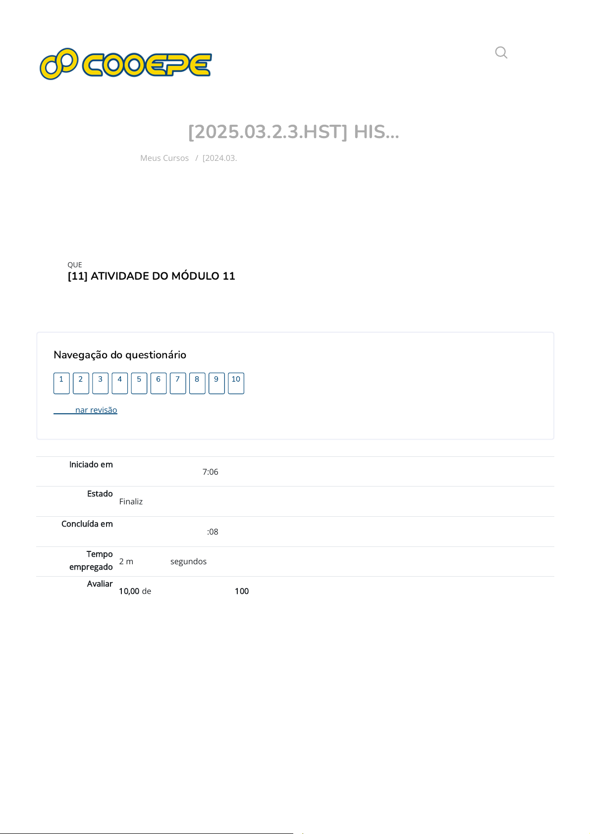 [2025.03.2.3.HST] HIS… Meus Cursos / [2024.03.2.3.HST] / Atividades / [11] ATIVIDADE DO MÓDULO 11 Iniciado em sábado, 6 dez. 2025, 07:06 Estado Finalizada Concluída em sábado, 6 dez. 2025, 07:08 Tempo empregado 2 minutos 19 segundos Avaliar 10,00 de um máximo de 10,00(100%) Navegação do questionário Terminar revisão 1 2 3 4 5 6 7 8 9 10 QUESTIONÁRIO [11] ATIVIDADE DO MÓDULO 11 https://eadcooepe.com.br/my/courses.php https://eadcooepe.com.br/course/view.php?id=3788 https://eadcooepe.com.br/course/view.php?id=3788#section-1 https://eadcooepe.com.br/mod/quiz/view.php?id=56360 https://eadcooepe.com.br/mod/quiz/view.php?id=56360 https://eadcooepe.com.br/ QUESTÃO Correto Atingiu 1,00 de 1,00 QUESTÃO Correto Atingiu 1,00 de 1,00 1 (Prof. Fábio Garcia) Sobre a expressão "Paz Armada” assinale a alternativa que melhor representa seu real significado: Escolha uma opção: a. Significou que os países Europa estavam difundido a fé cristã e se protegendo contra um ataque muçulmano. b. Significou que os países da Europa estavam se preparando para um eventual confronto armado contra os povos africanos e asiáticos. c. Significou uma aliança africana e americana contra os europeus. d. Significou que os países da Europa estavam se armando para um eventual confronto entre si. Sua resposta está correta. A resposta correta é: Significou que os países da Europa estavam se armando para um eventual confronto entre si. Correto Notas para este envio: 1,00/1,00. 2 (Prof. Fábio Garcia) O Dadaísmo foi: Escolha uma opção: a. Um movimento artístico que visava criticar a Tríplice Aliança. b. Um movimento literário favorável a vitória dos aliados da Alemanha. c. Um movimento teatral contra a Rússia. d. Um movimento artístico contrário aos horrores da guerra. Sua resposta está correta. A resposta correta é: Um movimento artístico contrário aos horrores da guerra. Correto Notas para este envio: 1,00/1,00. QUESTÃO Correto Atingiu 1,00 de 1,00 QUESTÃO Correto Atingiu 1,00 de 1,00 3 (Profª Vanusa Teresinha Perin) Qual foi o tratado mais importante entre Alemanha e Inglaterra, França e Japão? Escolha uma opção: a. Tratado de manter a paz mundial. b. Tratado de finalizar as guerras. c. Tratado da Tríplice Aliança. d. Tratado de Versalhes. Sua resposta está correta. A resposta correta é: Tratado de Versalhes. Correto Notas para este envio: 1,00/1,00. 4 (Profª Vanusa Teresinha Perin) Com o final da 2ª Guerra, a Alemanha foi dividida em duas. Quais são elas: Escolha uma opção: a. Republica do Norte e a Republica Democrática Alemã. b. Republica Democrática Alemã e as Republica Japonesa. c. Republica Federal Alemanha e a Republica Japonesa. d. Republica Federal da Alemanha e a Republica Democrática Alemã. Sua resposta está correta. A resposta correta é: Republica Federal da Alemanha e a Republica Democrática Alemã. Correto Notas para este envio: 1,00/1,00. QUESTÃO Correto Atingiu 1,00 de 1,00 QUESTÃO Correto Atingiu 1,00 de 1,00 5 (Profª Vanusa Teresinha Perin) Entre os fatores que ocasionaram a crise de 1929 nos EUA destacaram-se: Escolha uma opção: a. A saturação do mercado, a crise na agricultura e o crasch da bolsa de Nova York. b. A superprodução, a saturação do mercado e a expansão desmedida o crédito bancário. c. A adoção de propagandas de construção de obras financiadas pelo Estado para melhorar o desemprego. d. O protecionismo rígido, a escassez de crédito bancárioe a superprodução. Sua resposta está correta. A resposta correta é: A superprodução, a saturação do mercado e a expansão desmedida o crédito bancário. Correto Notas para este envio: 1,00/1,00. 6 (Prof. Alvim Siqueira) Assinale a alternativa que apresente a justificação dos EUA entrarem na guerra. Escolha uma opção: a. Todas as alternativas anteriores estão corretas. b. Os EUA mantiveram-se afastados da guerra durante todo o seu período de duração. c. O interesse dos norte-americanos era defender o Brasil e a França. d. Vários navios norte-americanos foram afundados pela Alemanha. Sua resposta está correta. A resposta correta é: Vários navios norte-americanos foram afundados pela Alemanha. Correto Notas para este envio: 1,00/1,00. QUESTÃO Correto Atingiu 1,00 de 1,00 QUESTÃO Correto Atingiu 1,00 de 1,00 7 (Profª Vanusa Teresinha Perin) No século XIX a indústria foi base da exploração qual a mais poderosa nação imperialista neste século. Escolha uma opção: a. Japão. b. Itália. c. Inglaterra. d. África. Sua resposta está correta. A resposta correta é: Inglaterra. Correto Notas para este envio: 1,00/1,00. 8 (Profª Vanusa Teresinha Perin) Quais foram os grupos econômicos que se organizaram: Escolha uma opção: a. Comercialistas e os economistas. b. Trustese os pobres. c. Cartéis e os trustes. d. Economistas e os cartéis. Sua resposta está correta. A resposta correta é: Cartéis e os trustes. Correto Notas para este envio: 1,00/1,00. QUESTÃO Correto Atingiu 1,00 de 1,00 QUESTÃO Correto Atingiu 1,00 de 1,00 9 (Profª Vanusa Teresinha Perin) As relações internacionais no entre guerras ( 1918 - 1939) foram marcadas por uma tentativa de criar um órgão internacional que teria como uma de suas funções evitar um novo conflito mundial. Essa organização ficou conhecida como: Escolha uma opção: a. Organização do Tratado do Atlântico Norte (OTAN). b. Organização dos Estados Americanos (OEA). c. Organização das Nações Unidas (ONU). d. Sociedade das Nações ou liga das Nações. Sua resposta está correta. A resposta correta é: Sociedade das Nações ou liga das Nações. Correto Notas para este envio: 1,00/1,00. 10 (Prof. Pedro Paulo Fanzio) As causas da Primeira Guerra Mundial foram muitas, exceto: Escolha uma opção: a. Revanchismo frances por perder territórios na Guerra Franco-Prussiana. b. Invasão da Polônia pela Alemanha. c. Crise na região dos Balcãs. d. Rivalidade econômica entre as nações imperialistas