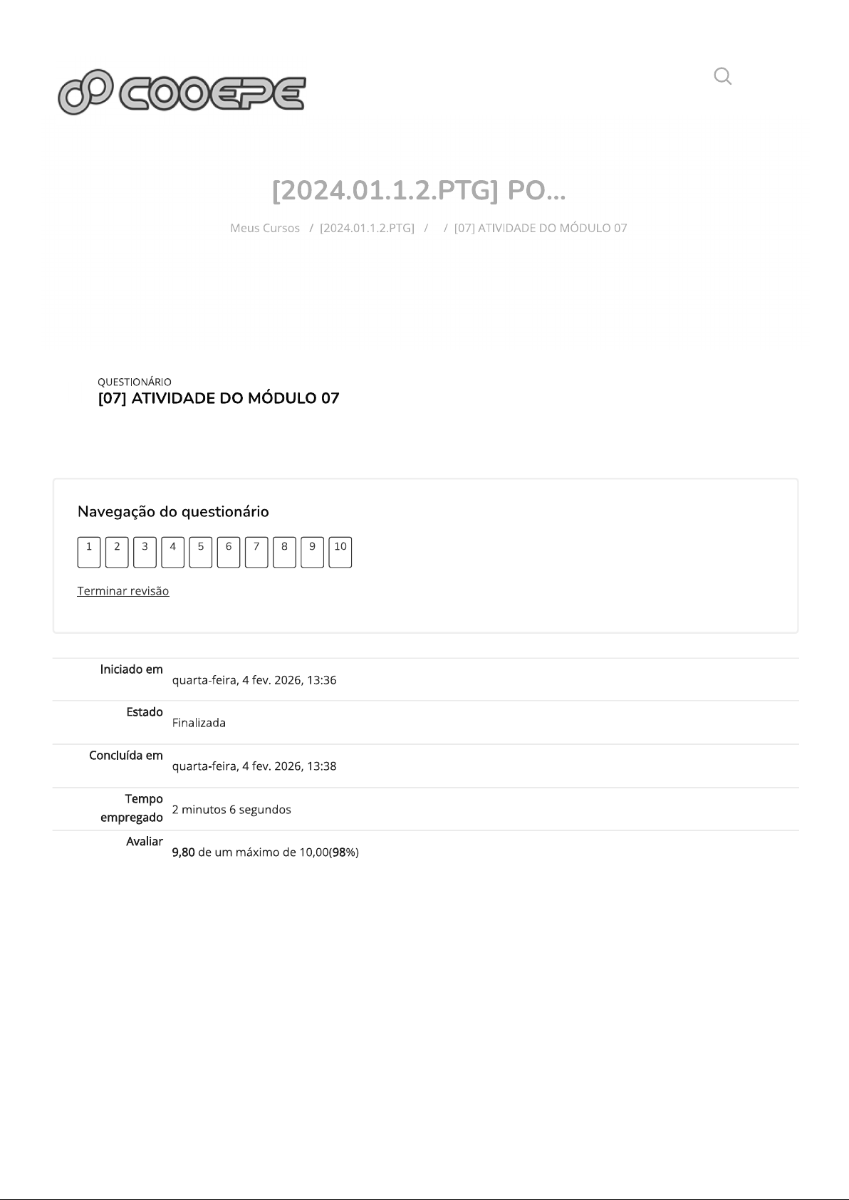 COOEPE [2024.01.1.2.PTG] PO... Meus Cursos / [2024.01.1.2.PTG] / / [07] ATIVIDADE DO MÓDULO 07 QUESTIONÁRIO [07] ATIVIDADE DO MÓDULO 07 Navegação do questionário 12345678910 Terminar revisão Iniciado em quarta-feira, 4 fev. 2026, 13:36 Estado Finalizada Concluída em quarta-feira, 4 fev. 2026, 13:38 Tempo 2 minutos 6 segundos empregado Avaliar 9,80 de um máximo de 10,00(98%)QUESTÃO 1 Correto Atingiu 1,00 de 1,00 (Professora Lurdes Bruenig) Associe a primeira coluna com a segunda, referente feminino e masculino dos adjetivos e assinale a alternativa correspondente: a- gato vaidoso ( ) amiga legal b- homem chorão ( ) mulher chorona amigo legaL ( ) gata vaidosa d- autor espanhol autora espanhola Escolha uma opção: a. b; a; d b. C; b; a; d C. a; d; b d. a; b; d A resposta correta é: b; a; d Correto Notas para este envio: 1,00/1,00. QUESTÃO 2 Correto Atingiu 1,00 de 1,00 (Professora Lurdes Bruenig) É a palavra que modifica 0 substantivo, atribuindo-lhe características: Escolha uma opção: a. Adjetivo. b. Advérbio. C. Preposição. d. Numeral. A resposta correta é: Adjetivo. Correto Notas para este envio: 1,00/1,00.QUESTÃO 3 Correto Atingiu 1,00 de 1,00 (Professora Lurdes Bruenig) É a expressão formada por mais de uma palavra com a função de adjetivo. Exemplo: Dia de chuva dia chuvoso. Escolha uma opção: a. flexão dos adjetivos. b. locução adjetiva C. adjetivo pátrio d. locução adverbial A resposta correta é: locução adjetiva Correto Notas para este envio: 1,00/1,00. QUESTÃO 4 Correto Atingiu 1,00 de 1,00 (Professora Lurdes Bruenig) superlativo absoluto sintético dos adjetivos alto, fácil, amigo, amável é: Escolha uma opção: a. altíssimo, facílimo, amicíssimo, amabilíssimo b. altíssimo, facílimo, amiguíssimo, amabilíssimo C. altíssimo, facílimo, amiguíssimo, amabilíssimo d. altíssimo, facílimo, amicíssimo, amabelíssimo A resposta correta é: altíssimo, facílimo, amicíssimo, amabilíssimo Correto Notas para este envio: 1,00/1,00.QUESTÃO 5 Correto Atingiu 0,80 de 1,00 (Professora Lurdes Bruenig) Assinale a alternativa que apresenta o plural correto da palavra indicada: Escolha uma opção: a. blusa azul-escura blusas azuis-escuras b. bandeira rubro- negra bandeiras rubros- negras C. país sul americano países sul americanos d. cabelo castanho -escuro cabelos castanhos- escuros A resposta correta é: país sul americano países sul americanos Correto Notas para o envio: 1,00/1,00. De acordo com as tentativas anteriores 0,80/1,00.QUESTÃO 6 Correto Atingiu 1,00 de 1,00 (Professora Lurdes Bruenig) Indique o grau dos adjetivos das frases, usando o código. (A) comparativo de superioridade (B) comparativo de inferioridade (C) comparativo de igualdade ( ) Pedro é mais alto que Marcos. Marcelo é tão alto quanto José. ( ) Esses jogadores são menos velozes que aqueles A seqüência correta é: Escolha uma opção: a. A; C; b. A; B; C. B; C; A d. C; B; A A resposta correta é: A; C; Correto Notas para este envio: 1,00/1,00.QUESTÃO 7 Correto Atingiu 1,00 de 1,00 (Professora Lurdes Bruenig) Na frase: "Ele falou com uma misteriosa voz descarnada". Os adjetivos dessa frase são: Escolha uma opção: a. misteriosa e descarnada b. descarnada C. Nem há adjetivos d. misteriosa A resposta correta é: misteriosa e descarnada Correto Notas para este envio: 1,00/1,00. QUESTÃO 8 Correto Atingiu 1,00 de 1,00 (Professora Lurdes Bruenig) Na frase : "O passageiro apavorado quase sofreu um esgotamento de nervos" locução adjetiva da frase é: Escolha uma opção: a. de nervos b. apavorado C. esgotamento d. passageiros A resposta correta é: de nervos Correto Notas para este envio: 1,00/1,00.QUESTÃO 9 Correto Atingiu 1,00 de 1,00 (Professora Lurdes Bruenig) "Pedro é mais forte que Lucas e "Lucas é mais esperto que Júlio". Em ambas as frases o adjetivo está no: Escolha uma opção: a. superlativo b. comparativo de superioridade C. comparativo de inferioridade d. comparativo de igualdade A resposta correta é: comparativo de superioridade Correto Notas para este envio: 1,00/1,00. QUESTÃO 10 Correto Atingiu 1,00 de 1,00 (Professora Lurdes Bruenig) adjetivo das locuções adjetivos de "noite de tempestade, faixa etária, refeição da manhã e passeata de estudante" é: Escolha uma opção: a. tempestade, etárias, matutino, estudante b. tempestade, etárias. matutino, estudantil C. tempestuosa, etária, matinal, estudantil d. tempestade. Etárias, matinal, estudantil. A resposta correta é: tempestuosa, etária, matinal, estudantil Correto Notas para este envio: 1,00/1,00. [06] ATIVIDADE DO MÓDULO 06 Seguir para... [08] ATIVIDADE DO MÓDULO 08Contato APP MATRIZ App Store Rua Álvaro Medeiros Santiago, n° 116 Instale no seu dispositivo Bairro Areias Areias - São José - SC 88113-600 Telefone: Google Play Email: cooepe@cooepe.com.br Instale no seu dispositivo Flexibilidade de estudos e professores qualificados à sua disposição! COOEPE f Copyright © 2024 COOEPE. All Rights Reserved.