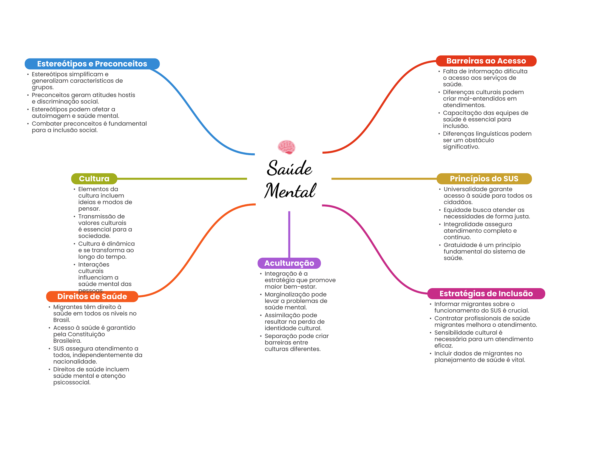 Estereótipos e Preconceitos Barreiras ao Acesso Estereótipos simplificam e Falta de informação dificulta generalizam características de acesso aos serviços de saúde. grupos. Preconceitos geram atitudes hostis Diferenças culturais podem criar mal-entendidos em e discriminação social. atendimentos. Estereótipos podem afetar a autoimagem e saúde mental. Capacitação das equipes de saúde é essencial para Combater preconceitos é fundamental inclusão. para a inclusão social. Diferenças linguísticas podem ser um obstáculo significativo. Saúde Cultura Princípios do SUS Elementos da cultura incluem Mental Universalidade garante acesso à saúde para todos ideias e modos de cidadãos. pensar. Equidade busca atender as Transmissão de necessidades de forma justa. valores culturais Integralidade assegura é essencial para a atendimento completo e sociedade. contínuo. Cultura é dinâmica Gratuidade é um princípio e se transforma ao fundamental do sistema de longo do tempo. saúde. Interações Aculturação culturais Integração é a influenciam a estratégia que promove saúde mental das maior bem-estar. pessoas Direitos de Saúde Marginalização pode Estratégias de Inclusão levar a problemas de Migrantes têm direito à saúde mental. Informar migrantes sobre funcionamento do SUS é crucial. saúde em todos níveis no Assimilação pode Brasil. resultar na perda de Contratar profissionais de saúde Acesso à saúde é garantido identidade cultural. migrantes melhora atendimento. pela Constituição Sensibilidade cultural é Separação pode criar Brasileira. barreiras entre necessária para um atendimento eficaz. SUS assegura atendimento a culturas diferentes. todos, independentemente da Incluir dados de migrantes no nacionalidade. planejamento de saúde é vital. Direitos de saúde incluem saúde mental e atenção psicossocial.