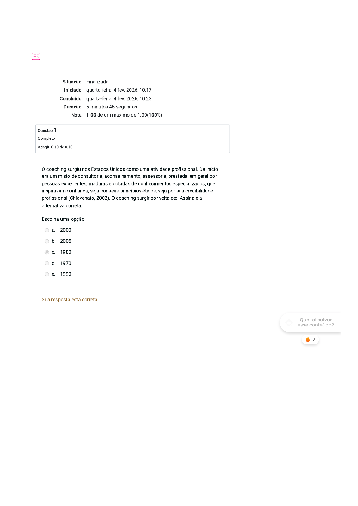 Situação Finalizada Iniciado quarta-feira, 4 fev. 2026, 10:17 Concluído quarta-feira, 4 fev. 2026, 10:23 Duração 5 minutos 46 segundos Nota 1.00 de um máximo de 1.00(100%) Questão 1 Completo Atingiu 0.10 de 0.10 O coaching surgiu nos Estados Unidos como uma atividade pro�ssional. De início era um misto de consultoria, aconselhamento, assessoria, prestada, em geral por pessoas experientes, maduras e dotadas de conhecimentos especializados, que inspiravam con�ança, seja por seus princípios éticos, seja por sua credibilidade pro�ssional (Chiavenato, 2002). O coaching surgir por volta de: Assinale a alternativa correta: Escolha uma opção: a. 2000. b. 2005. c. 1980. d. 1970. e. 1990. Sua resposta está correta. Que tal salvar esse conteúdo? 0 Questão 2 Completo Atingiu 0.10 de 0.10 A liderança, como podemos ver, está ligada ao relacionamento, entre liderados e líderes, com foco a estimular o processo motivacional, com isso, criando relações mais fortes e duradouras entre os indivíduos da organização, resultando em um clima organizacional equilibrado e motivador. As interações entre as pessoas são extremamente dinâmicas, onde os desejos de cada indivíduo re�etem em suas ações. Pensando nisso, os estilos de liderança dependerão da forma com que as pessoas recebem novas ideias e objetivos, ou como se relacionam com outras pessoas. Nesse sentido podemos a�rmar que existem os seguintes tipos de liderança: I. Habilidades no relacionamento humano; II. Autocrática; III. Democrática; IV. Liberal. É correto somente o que se a�rma em: Assinale a alternativa correta: Escolha uma opção: a. I, II, III e IV. b. II, III e IV, apenas. c. I e II, apenas. d. II e III, apenas. e. I, apenas. Sua resposta está correta. Que tal salvar esse conteúdo? Questão 3 Completo Atingiu 0.10 de 0.10 Chiavenato (2005) reforça mais algumas posturas que o líder e�ciente precisa ter, principalmente no momento de relacionamento com as pessoas que estão a sua volta, sendo elas: Assinale Verdadeiro (V) ou Falso (F): ( ) Mente estratégica. ( ) Protelação constante. ( ) Ousadia, capacidade de assumir riscos. Assinale a alternativa correta: Escolha uma opção: a. F-F-F. b. V-F-V. c. F-V-V. d. V-V-V. e. V-F-F. Sua resposta está correta. Que tal salvar esse conteúdo? Questão 4 Completo Atingiu 0.10 de 0.10 Os novos líderes precisam aprender que aquele modelo "de cima para baixo" já não obtém mais resultados satisfatórios e que o modelo agora deverá ser horizontal. Tem que perceber que pesando no funcionário, este também pensará nele e o ajudará na realização dos objetivos. Esse é o princípio da liderança servidora. Nesse sentido podemos a�rmar que são características da Liderança Servidora: I. Capacitar e desenvolver pessoas; II. Autenticidade; III. Direcionamento; IV. Empatia. É correto somente o que se a�rma em: Assinale a alternativa correta: Escolha uma opção: a. I, II, III e IV. b. I e II, apenas. c. I, apenas. d. II, III e IV, apenas. e. II e III, apenas. Sua resposta está correta. Que tal salvar esse conteúdo? Questão 5 Completo Atingiu 0.10 de 0.10 Questão 6 Completo Atingiu 0.10 de 0.10 O líder precisa ter um conjunto de características para poder atuar com e�ciência no seu papel de mentor de um grupo. Na visão de Chiavenato (2005), o líder atual deve ser alguém que renove o ambiente e a atitude dos indivíduos a sua volta. Ele defende que o líder precisa ter as seguintes características: I. Habilidades no relacionamento humano; II. Criatividade e Inovação; III. Flexibilidade; IV. Tomada de Decisão. É correto somente o que se a�rma em: Assinale a alternativa correta: Escolha uma opção: a. II e III, apenas. b. I, apenas. c. I e II, apenas. d. I, II, III e IV. e. II, III e IV, apenas. Sua resposta está correta. Avalie a a�rmativa a seguir: “A participação do líder no debate é limitada apresentando apenas alternativas ao grupo, esclarecendo que poderia fornecer informações desde que solicitada”. Essa a�rmativa pertence a qual tipo de liderança? Escolha uma opção: a. Autocrática. b. Liberal. c. Democrática. d. Coaching. e. Servidora. Sua resposta está correta. Que tal salvar esse conteúdo? Questão 7 Completo Atingiu 0.10 de 0.10 Segundo DAFT (2002), as pressões para que as organizações se modi�quem provavelmente aumentarão nas próximas décadas e os líderes devem desenvolver qualidades pessoais, habilidades e métodos necessários para ajudar suas empresas a permanecer competitiva. Ele a�rma ainda que os gestores devem converter suas organizações em agentes de mudança, utilizando o presente para realmente recriar o futuro. O líder servidor pode e deve aplicar métodos de desenvolvimento organizacional, os chamados DO, como denominado por Robbins (2005). Para ele, as técnicas do DO envolvem: ( ) valores; ( ) feedbacks; ( ) treinamentos. Assinale a alternativa correta: Escolha uma opção: a. V-F-V. b. V-F-F. c. F-F-F. d. F-V-V. e. V-V-V. Sua resposta está correta. Que tal salvar esse conteúdo? Questão 8 Completo Atingiu 0.10 de 0.10 Avalie a de�nição: “é um relacionamento no qual uma pessoa se compromete a apoiar outra a atingir um determinado resultado, seja ele o de adquirir competências e/ou produzir uma mudança especí�ca. Não signi�ca apenas um compromisso com os resultados, mas sim com a pessoa como um todo, seu desenvolvimento e sua realização” (Porché; Niederer, 2002). Esta de�nição se aplica a: ( ) coaching; ( ) liderança; ( ) treinamento. Assinale a alternativa correta: Escolha uma opção: a. F-F-F. b. F-V-V. c. V-F-V. d. V-F-F. e. V-V-V. Sua resposta está correta. Que tal salvar esse conteúdo? Questão 9 Completo Atingiu 0.10 de 0.10 Questão 10 Completo Atingiu 0.10 de 0.10 Pensando nos conceitos de liderança, é visto que na sua mais simples de�nição nada mais é do que levar um grupo a atingir objetivos traçados. A origem dessa in�uên