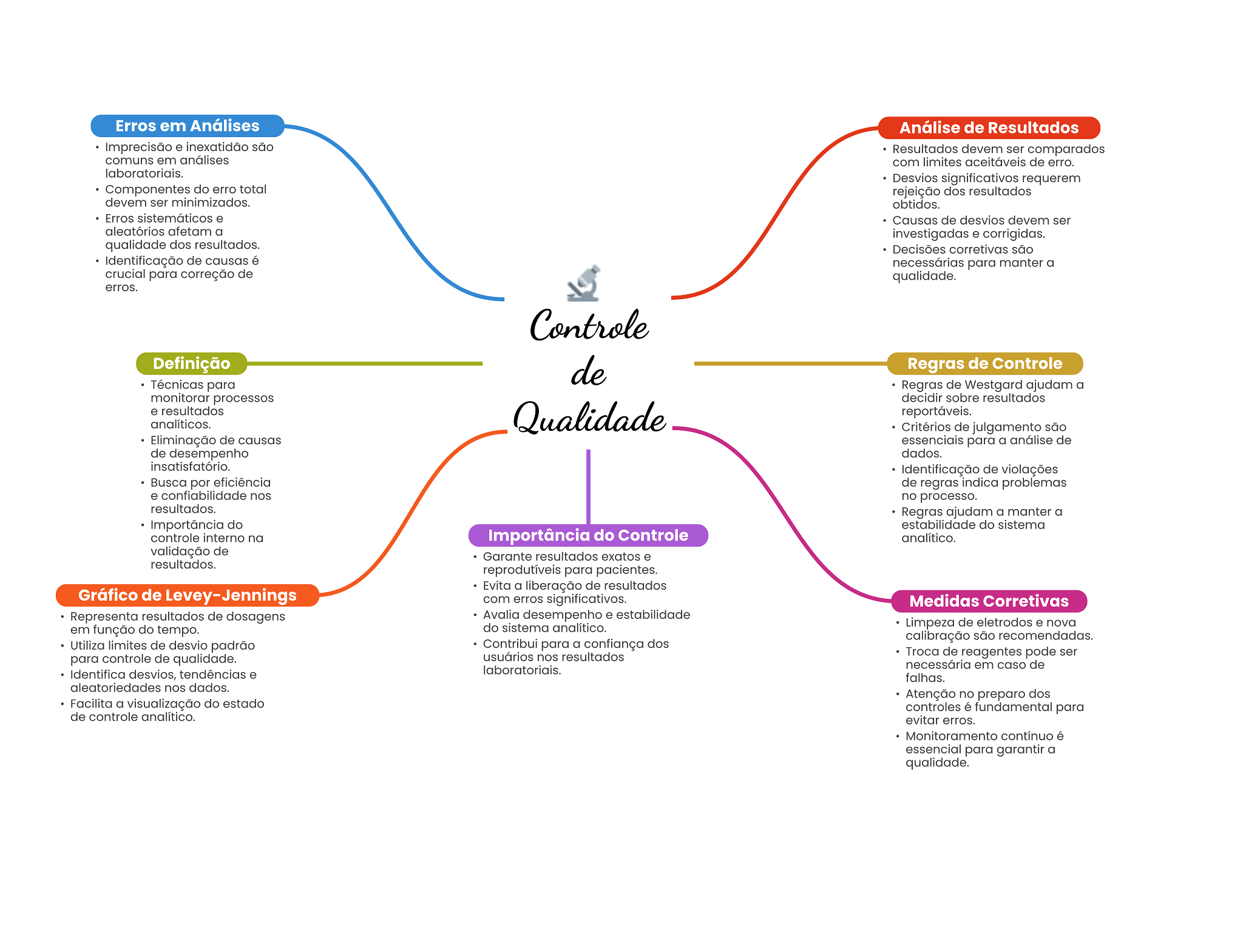 Erros em Análises Análise de Resultados Imprecisão e inexatidão são Resultados devem ser comparados comuns em análises com limites aceitáveis de erro. laboratoriais. Desvios significativos requerem Componentes do erro total rejeição dos resultados devem ser minimizados. obtidos. Erros sistemáticos e Causas de desvios devem ser aleatórios afetam a investigadas e corrigidas. qualidade dos resultados. Decisões corretivas são Identificação de causas é necessárias para manter a crucial para correção de qualidade. erros. Controle Definição de Regras de Controle Técnicas para Regras de Westgard ajudam a monitorar processos decidir sobre resultados e resultados analíticos. Qualidade reportáveis. Critérios de julgamento são Eliminação de causas essenciais para a análise de de desempenho dados. insatisfatório. Identificação de violações Busca por eficiência de regras indica problemas e confiabilidade nos no processo. resultados. Regras ajudam a manter a Importância do estabilidade do sistema controle interno na Importância do Controle analítico. validação de Garante resultados exatos e resultados. reprodutíveis para pacientes. Evita a liberação de resultados Gráfico de Levey-Jennings com erros significativos. Medidas Corretivas Representa resultados de dosagens Avalia desempenho e estabilidade em função do tempo. do sistema analítico. Limpeza de eletrodos e nova calibração são recomendadas. Utiliza limites de desvio padrão Contribui para a confiança dos para controle de qualidade. usuários nos resultados Troca de reagentes pode ser Identifica desvios, tendências e laboratoriais. necessária em caso de falhas. aleatoriedades nos dados. Atenção no preparo dos Facilita a visualização do estado controles é fundamental para de controle analítico. evitar erros. Monitoramento contínuo é essencial para garantir a qualidade.
