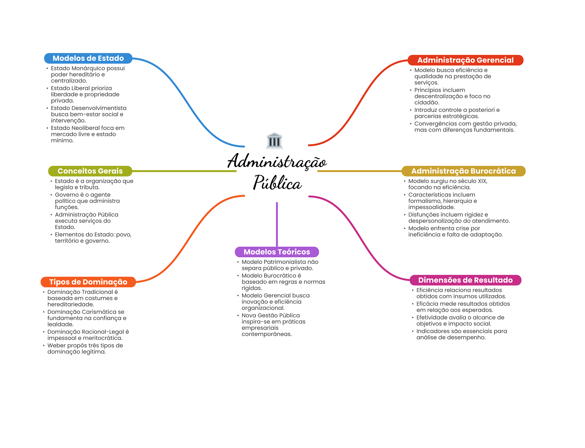 Modelos de Estado Administração Gerencial Estado Monárquico possui Modelo busca eficiência e poder hereditário e qualidade na prestação de centralizado. serviços. Estado Liberal prioriza Princípios incluem liberdade e propriedade descentralização e foco no privada. cidadão. Estado Desenvolvimentista Introduz controle a posteriori e busca bem-estar social e parcerias estratégicas. intervenção. Convergências com gestão privada, Estado Neoliberal foca em mas com diferenças fundamentais. mercado livre e estado mínimo. Administração Conceitos Gerais Administração Burocrática Estado é a organização que Pública Modelo surgiu no século XIX, legisla e tributa. focando na eficiência. Governo é agente Características incluem político que administra formalismo, hierarquia e funções. impessoalidade. Administração Pública Disfunções incluem rigidez e executa serviços do despersonalização do atendimento. Estado. Modelo enfrenta crise por Elementos do Estado: povo, ineficiência e falta de adaptação. território e governo. Modelos Teóricos Modelo Patrimonialista não separa público e privado. Modelo Burocrático é Tipos de Dominação baseado em regras e normas Dimensões de Resultado rígidas. Dominação Tradicional é Eficiência relaciona resultados baseada em costumes e Modelo Gerencial busca obtidos com insumos utilizados. hereditariedade. inovação e eficiência Eficácia mede resultados obtidos organizacional. Dominação Carismática se em relação aos esperados. Nova Gestão Pública fundamenta na confiança e Efetividade avalia O alcance de lealdade. inspira-se em práticas objetivos e impacto social. empresariais Dominação Racional-Legal é contemporâneas. Indicadores são essenciais para impessoal e meritocrática. análise de desempenho. Weber propôs três tipos de dominação legítima.