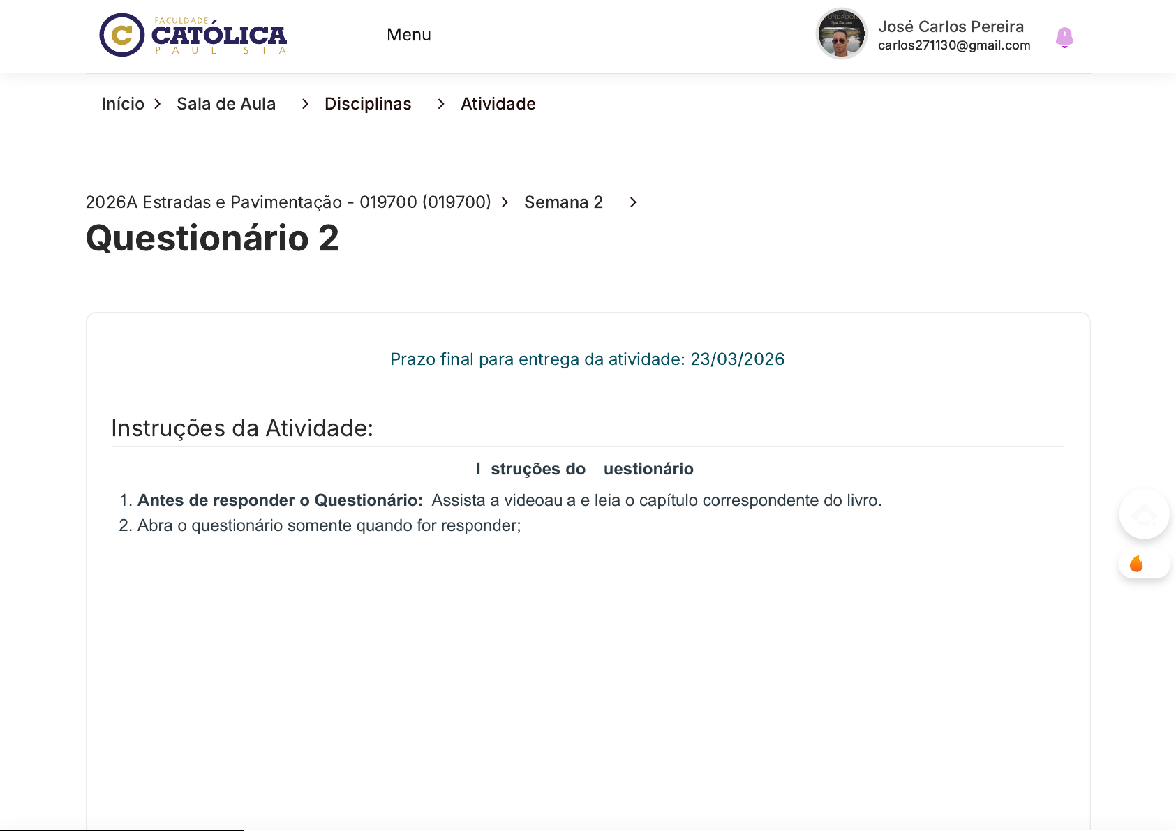 Início 〉 Sala de Aula 〉 Disciplinas 〉 Atividade 2026A Estradas e Pavimentação - 019700 (019700) 〉 Semana 2 〉 Questionário 2 Instruções da Atividade: Prazo final para entrega da atividade: 23/03/2026 Instruções do Questionário: 1. Antes de responder o Questionário: Assista a videoaula e leia o capítulo correspondente do livro. 2. Abra o questionário somente quando for responder; 3. Ao abrir o questionário você terá 4 questões para responder; 4. Leia com calma todas as questões e entenda o que pede a questão: se pede a incorreta, a correta e qual o tema da questão; 5. Lembre-se de Clicar no botão "Enviar"; 6. Você tem duas tentativas para fazer o teste, a segunda tentativa é opcional; 7. Lembre-se que as respostas mudam de lugar em cada tentativa; 8. As respostas corretas só aparecem após o envio da segunda tentativa; 9. O sistema considera a maior nota entre as duas tentativas; 10. Lembre-se que na segunda tentativa zera TODAS as questões, inclusive as que você acertou na primeira tentativa. Bons estudos! Menu José Carlos Pereira carlos271130@gmail.com 0 https://ava.uca.edu.br/aluno/sala-de-aula/disciplina/modulo/atividade/677933 https://ava.uca.edu.br/aluno/sala-de-aula/disciplina/modulo/atividade/677933 https://ava.uca.edu.br/aluno/sala-de-aula/disciplina https://ava.uca.edu.br/aluno/sala-de-aula/disciplina/modulo/atividade/:id/:nome javascript:void(0); javascript:void(0) javascript:void(0) Primeira Tentativa 8C86FE58-9470-FBAD-32BB-B68C91E1178D -- Nota Automática -- Nota Final: 0,400 de 0,400 pontos carlos271130@gmail.com - 27/01/2026 22:33:01 Visualizar Entrega Fazer Segunda Tentativa Perguntas Pergunta 1. Pergunta 2. Pergunta 3. Pergunta 4. pontos: 0,100Pergunta 1. Após a realização de estudos da área envolvendo os principais aspectos de caracterização, como planialtimetria, geologia, hidrografia entre outros, é necessário realizar a interpretação Avaliação Nota Avaliada: 0,100 de 0,100 Menu José Carlos Pereira carlos271130@gmail.com javascript:void(0); javascript:void(0) javascript:void(0) desses dados. Os dados devem ser apresentados em pontos obrigados. Um dos tipos de pontos obrigados diz respeito a característica de ordem técnica, qual é ele? Múltipla Escolha: A. Pontos obrigados de Estrutura B. Pontos obrigados de Passagem C. Pontos obrigados de Acessibilidade D. Pontos obrigados de Condição E. Pontos obrigados de Ocorrência pontos: 0,100Pergunta 2. A distância de visibilidade de ultrapassagem é um elemento que deve ser considerado em estradas de pista única com dois sentidos de tráfego, é necessário que existam trechos com visibilidade suficiente para que os veículos mais rápidos possam ultrapassar os mais lentos. Dessa forma, qual deve ser a distância de visibilidade de Ultrapassagem de uma rodovia que tenha velocidade de projeto de 110 km/h? Múltipla Escolha: A. 550 metros. B. 110 metros. Avaliação Nota Avaliada: 0,100 de 0,100 Menu José Carlos Pereira carlos271130@gmail.com javascript:void(0); javascript:void(0) javascript:void(0) C. 880 metros. D. 792 metros. E. 440 metros. pontos: 0,100Pergunta 3. A distância de Visibilidade de Frenagem é um elemento importante da engenharia rodoviária em que se calcula a distância percorrida por um carro até parar quando o motorista visualiza um objeto no percurso. Calcule a distância de Frenagem em um trecho de rodovia que a velocidade de projeto é de 90km/h, com um aclive (veículo subindo) de 5%. Múltipla Escolha: A. 178,8 m B. 165,1 m C. 153,3 m D. 63,9 m E. 216,7 m Avaliação Nota Avaliada: 0,100 de 0,100 Menu José Carlos Pereira carlos271130@gmail.com javascript:void(0); javascript:void(0) javascript:void(0) pontos: 0,100Pergunta 4. O estudo de área quanto a Topografia diz respeito a altimetria do terreno, quando se tem uma altimetria com pouca variação o terreno é considerado plano. Quando se tem altimetria com moderada variação, o terreno é considerado ondulado. Porém, quando se tem um alto índice de variação da altimetria, o terreno é classificado como montanhoso. Analise as seguintes alternativas e encontre aquela que é verdadeira. Múltipla Escolha: A. Terrenos ondulados em maior liberdade de escolha de traçado do que terrenos planos. B. O custo de movimentação de terra é baixo em terrenos montanhosos. C. A adoção de traçado em zigue-zague é uma boa solução para terrenos montanhosos. D. É comum adotar em terrenos planos obras de arte especial para superar vales. E. Terrenos ondulados tendem a ter um gasto na execução de uma rodovia maior do que terrenos montanhosos. Avaliação Nota Avaliada: 0,100 de 0,100 Menu José Carlos Pereira carlos271130@gmail.com javascript:void(0); javascript:void(0) javascript:void(0) Fechar Visualização 〈 Voltar aos Módulos 〈 Anterior Próxima 〉 Faculdade Católica Paulista Contato Endereço Avenida Cristo Rei, 305 – Banzato Marília, São Paulo – CEP: 17515-200 Horário De Funcionamento Segunda a quinta, das 8:00 às 20:00 horas As sextas, das 8:00 às 18:00 horas. WhatsApp : (14) 9.8826-3000 Telefone Sede: (14) 3422-1815 Central de Atendimento: 0800 664 5583 E-mail : secretaria@uca.edu.br Menu José Carlos Pereira carlos271130@gmail.com https://www.instagram.com/faculdadecatolicaead/ https://facebook.com/ucaead https://www.youtube.com/@UcaEduBr https://www.linkedin.com/school/faculdade-catolica-paulista/?originalSubdomain=br https://maps.app.goo.gl/wWsD9QX5fVPa3h6PA https://api.whatsapp.com/send?phone=5514988263000&text=Suporte tel:14-3422-1815 tel:14-3422-1815 tel:0800-664-5583 tel:0800-664-5583 mailto:secretaria@uca.edu.br javascript:void(0); javascript:void(0) javascript:void(0)