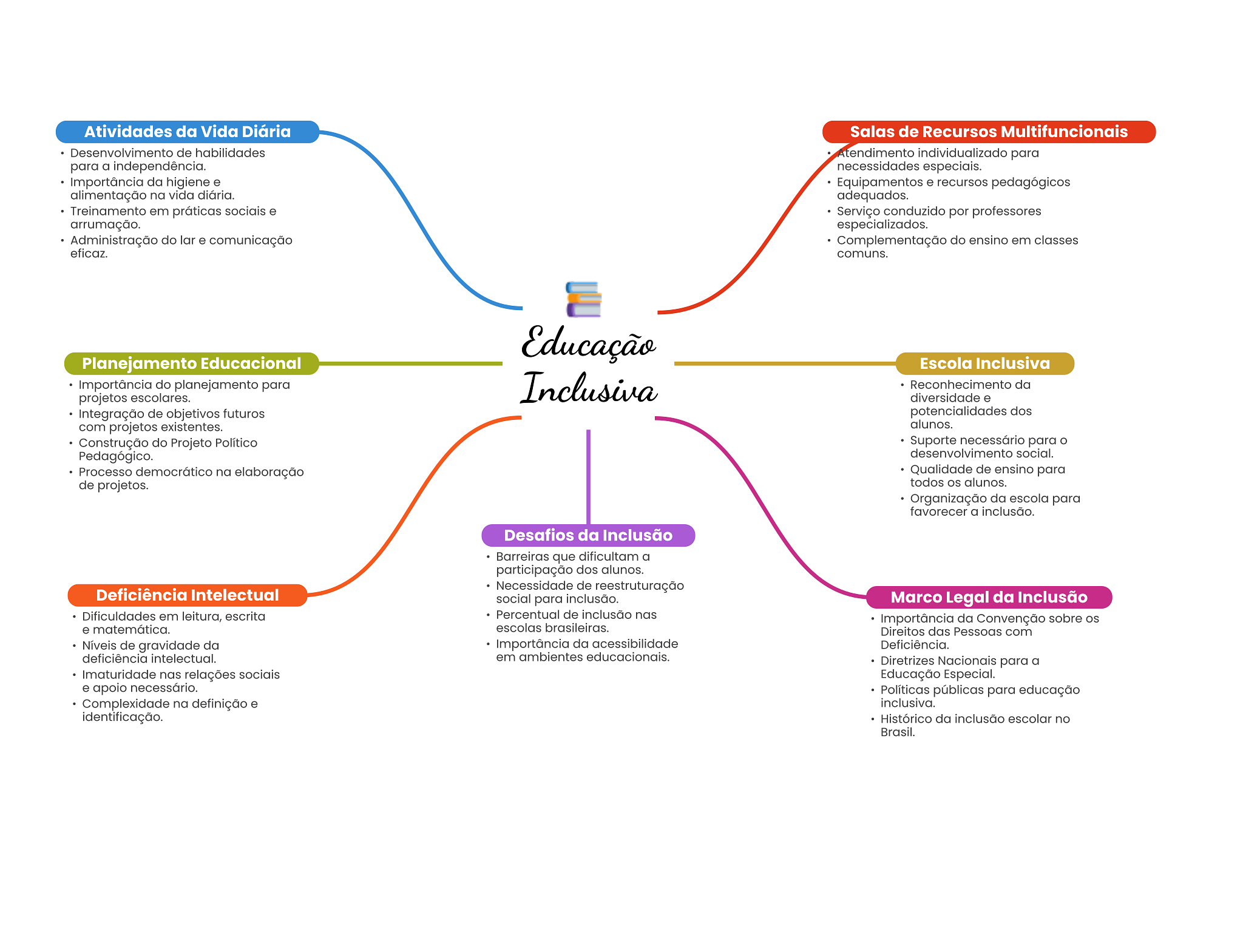 Atividades da Vida Diária Salas de Recursos Multifuncionais Desenvolvimento de habilidades Atendimento individualizado para para a independência. necessidades especiais. Importância da higiene e Equipamentos e recursos pedagógicos alimentação na vida diária. adequados. Treinamento em práticas sociais e Serviço conduzido por professores arrumação. especializados. Administração do lar e comunicação Complementação do ensino em classes eficaz. comuns. Educação Planejamento Educacional Escola Inclusiva Importância do planejamento para projetos escolares. Inclusiva Reconhecimento da diversidade e Integração de objetivos futuros potencialidades dos com projetos existentes. alunos. Construção do Projeto Político Suporte necessário para O Pedagógico. desenvolvimento social. Processo democrático na elaboração Qualidade de ensino para de projetos. todos alunos. Organização da escola para favorecer a inclusão. Desafios da Inclusão Barreiras que dificultam a participação dos alunos. Necessidade de reestruturação Deficiência Intelectual social para inclusão. Marco Legal da Inclusão Dificuldades em leitura, escrita Percentual de inclusão nas Importância da Convenção sobre e matemática. escolas brasileiras. Direitos das Pessoas com Níveis de gravidade da Importância da acessibilidade Deficiência. deficiência intelectual. em ambientes educacionais. Diretrizes Nacionais para a Imaturidade nas relações sociais Educação Especial. e - apoio necessário. Políticas públicas para educação Complexidade na definição e inclusiva. identificação. Histórico da inclusão escolar no Brasil.