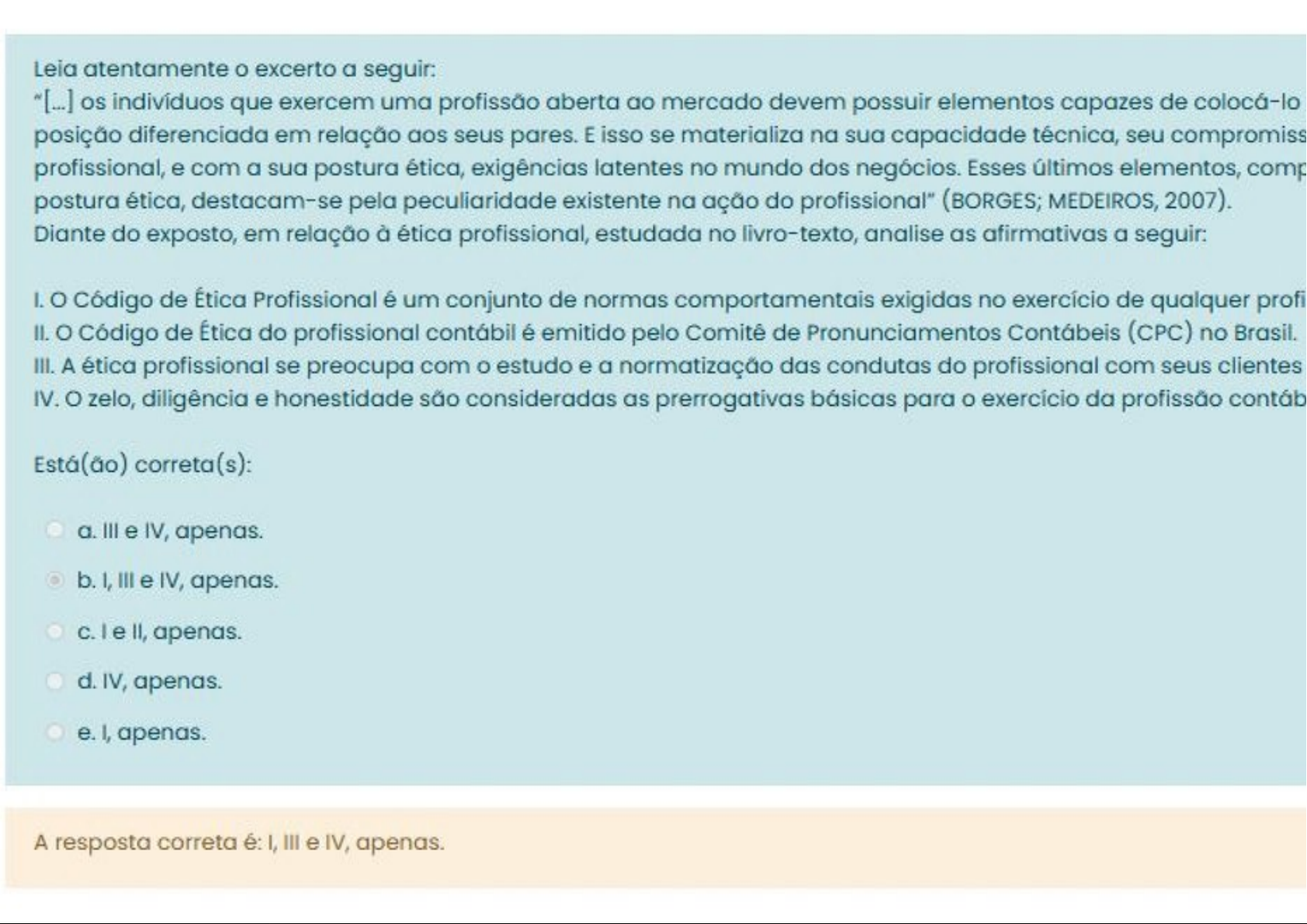 Leia atentamente o excerto a seguir: os indivíduos que exercem uma profissão aberta ao mercado devem possuir elementos capazes de colocá-lo posição diferenciada em relação aos seus pares. E isso se materializa na sua capacidade técnica, seu compromiss profissional, e com a sua postura ética, exigências latentes no mundo dos negócios. Esses últimos elementos, comp postura ética, destacam-se pela peculiaridade existente na ação do profissional" (BORGES; MEDEIROS, 2007). Diante do exposto, em relação à ética profissional, estudada no livro-texto, analise as afirmativas a seguir: I. Código de Ética Profissional é um conjunto de normas comportamentais exigidas no exercício de qualquer profi II. Código de Ética do profissional contábil é emitido pelo de Pronunciamentos Contábeis (CPC) no Brasil. III. A ética profissional se preocupa com estudo e a normatização das condutas do profissional com seus clientes IV. zelo, diligência e honestidade são consideradas as prerrogativas básicas para o exercício da profissão contáb Está(ão) correta(s): a. III e IV, apenas. b. III e IV, apenas. C. I e II, apenas. d. IV, apenas. e. I, apenas. A resposta correta é: I, III e IV, apenas.