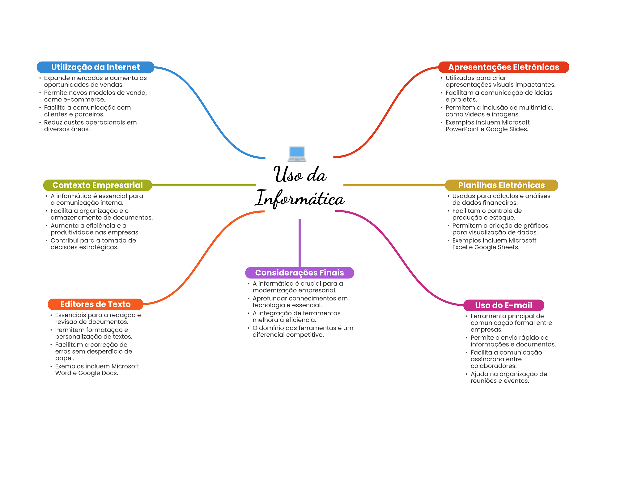 Utilização da Internet Apresentações Eletrônicas Expande mercados e aumenta as Utilizadas para criar oportunidades de vendas. apresentações visuais impactantes. Permite novos modelos de venda, Facilitam a comunicação de ideias como e-commerce. e projetos. Facilita a comunicação com Permitem a inclusão de multimídia, clientes e parceiros. como vídeos e imagens. Reduz custos operacionais em Exemplos incluem Microsoft diversas áreas. PowerPoint e Google Slides. Uso da Contexto Empresarial Planilhas Eletrônicas A informática é essencial para Informática Usadas para cálculos e análises a comunicação interna. de dados financeiros. Facilita a organização e Facilitam O controle de armazenamento de documentos. produção e estoque. Aumenta a eficiência e a Permitem a criação de gráficos produtividade nas empresas. para visualização de dados. Contribui para a tomada de Exemplos incluem Microsoft decisões estratégicas. Excel e Google Sheets. Considerações Finais A informática é crucial para a modernização empresarial. Aprofundar conhecimentos em Editores de Texto tecnologia é essencial. Uso do E-mail Essenciais para a redação e A integração de ferramentas revisão de documentos. melhora a eficiência. Ferramenta principal de comunicação formal entre Permitem formatação e O domínio das ferramentas é um empresas. personalização de textos. diferencial competitivo. Permite envio rápido de Facilitam a correção de informações e documentos. erros sem desperdício de Facilita a comunicação papel. assíncrona entre Exemplos incluem Microsoft colaboradores. Word e Google Docs. Ajuda na organização de reuniões e eventos.