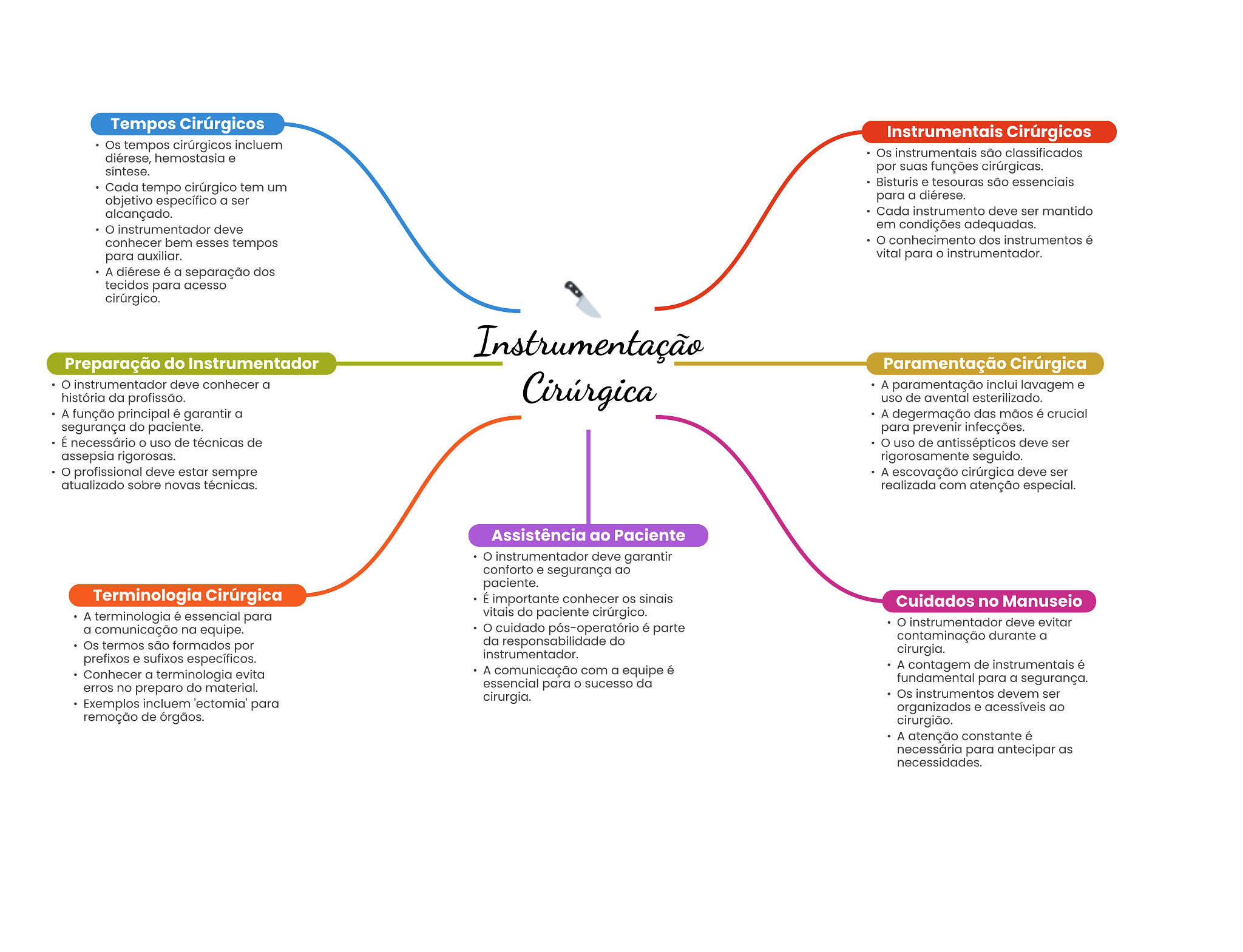 Tempos Cirúrgicos Instrumentais Cirúrgicos Os tempos cirúrgicos incluem diérese, hemostasia e Os instrumentais são classificados síntese. por suas funções cirúrgicas. Cada tempo cirúrgico tem um Bisturis e tesouras são essenciais objetivo específico a ser para a diérese. alcançado. Cada instrumento deve ser mantido instrumentador deve em condições adequadas. conhecer bem esses tempos conhecimento dos instrumentos é para auxiliar. vital para instrumentador. A diérese é a separação dos tecidos para acesso cirúrgico. Instrumentação Preparação do Instrumentador Paramentação Cirúrgica instrumentador deve conhecer a Cirúrgica A paramentação inclui lavagem e história da profissão. uso de avental esterilizado. A função principal é garantir a A degermação das mãos é crucial segurança do paciente. para prevenir infecções. É necessário uso de técnicas de uso de antissépticos deve ser assepsia rigorosas. rigorosamente seguido. profissional deve estar sempre A escovação cirúrgica deve ser atualizado sobre novas técnicas. realizada com atenção especial. Assistência ao Paciente instrumentador deve garantir conforto e segurança ao paciente. Terminologia Cirúrgica É importante conhecer sinais Cuidados no Manuseio A terminologia é essencial para vitais do paciente cirúrgico. instrumentador deve evitar a comunicação na equipe. cuidado pós-operatório é parte Os termos são formados por da responsabilidade do contaminação durante a prefixos e sufixos específicos. instrumentador. cirurgia. A comunicação com a equipe é A contagem de instrumentais é Conhecer a terminologia evita essencial para sucesso da fundamental para a segurança. erros no preparo do material. cirurgia. Os instrumentos devem ser Exemplos incluem 'ectomia' para organizados e acessíveis ao remoção de órgãos. cirurgião. A atenção constante é necessária para antecipar as necessidades.