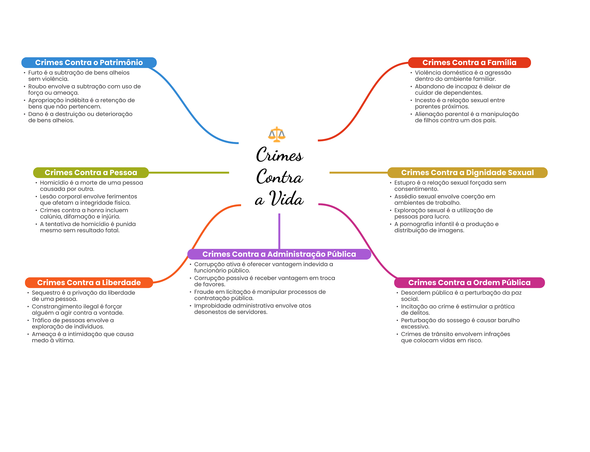 Crimes Contra Patrimônio Crimes Contra a Família Furto é a subtração de bens alheios Violência doméstica é a agressão sem violência. dentro do ambiente familiar. Roubo envolve a subtração com uso de Abandono de incapaz é deixar de força ou ameaça. cuidar de dependentes. Apropriação indébita é a retenção de Incesto é a relação sexual entre bens que não pertencem. parentes próximos. Dano é a destruição ou deterioração Alienação parental é a manipulação de bens alheios. de filhos contra um dos pais. Crimes Crimes Contra a Pessoa Contra Crimes Contra a Dignidade Sexual Homicídio é a morte de uma pessoa Estupro é a relação sexual forçada sem causada por outra. consentimento. Lesão corporal envolve ferimentos a Vida Assédio sexual envolve coerção em que afetam a integridade física. ambientes de trabalho. Crimes contra a honra incluem Exploração sexual é a utilização de calúnia, difamação e injúria. pessoas para lucro. A tentativa de homicídio é punida A pornografia infantil é a produção e mesmo sem resultado fatal. distribuição de imagens. Crimes Contra a Administração Pública Corrupção ativa é oferecer vantagem indevida a funcionário público. Corrupção passiva é receber vantagem em troca Crimes Contra a Liberdade de favores. Crimes Contra a Ordem Pública Sequestro é a privação da liberdade Fraude em licitação é manipular processos de Desordem pública é a perturbação da paz de uma pessoa. contratação pública. social. Constrangimento ilegal é forçar Improbidade administrativa envolve atos Incitação ao crime é estimular a prática alguém a agir contra a vontade. desonestos de servidores. de delitos. Tráfico de pessoas envolve a Perturbação do sossego é causar barulho exploração de indivíduos. excessivo. Ameaça é a intimidação que causa Crimes de trânsito envolvem infrações medo à vítima. que colocam vidas em risco.
