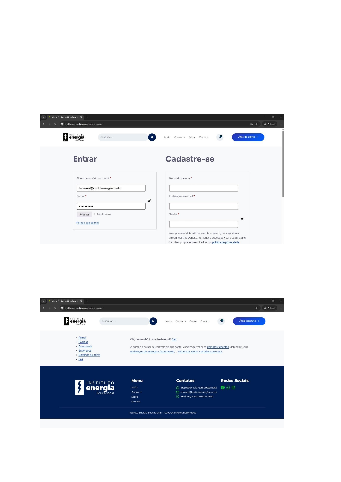 Tutorial Acesso ao Curso EAD Acesse o site pelo link: www.institutoenergia.com.br/minha-conta/ e preencha as informações de usuário e senha que foram repassadas. Finalize clicando no botão “Acessar”. Ao acessar verá essa tela. Clique no botão azul “Área do aluno” na parte superior direita da página, para acesso ao painel com os cursos matriculados. http://www.institutoenergia.com.br/minha-conta/ Ao acessar o painel verá essa página abaixo, desça a página até aparecer o curso que está matriculado. Ao aparecer o curso, como no exemplo “NR10 Básico – EAD” pode clicar no nome do curso para abrir as opções. Dentro da pagina do curso clique no botão azul “Ver aulas” ao lado da imagem. Ao entrar no curso, verá uma introdução aos alunos EAD em seguida a apostila em PDF para download e na sequencia as Aulas e Exercícios. Em “Apostila” verá 3 abas: Visão geral, Material didático e Comentários. Para baixar o PDF da apostila clique na aba “Material didático” e em seguida clique no ícone de baixar. Ao marcar a aula como completa ou clicar em “Próxima” será redirecionado e seguira assim por todas as aulas até o final. Caso a próxima aula seja de vídeo, ao terminar o vídeo é redirecionado a próxima automaticamente, caso seja aula de slide, clique novamente em “Material didático” e baixe o slide da aula. Nas aulas de exercícios pode clicar em “Iniciar questionário” e resolver as questões assim como mostra nas imagens abaixo. Ao responder cada uma, clique em “Submit & Next” para as próximas. Você também tem a opção de Voltar as questões caso queira antes de Enviar o questionário resolvido e receber a nota. Os questionários tem mais de uma tentativa, caso não atinja a nota mínima. Caso não atinja a nota mínima para o exercício, aparecerá um ícone vermelho ao lado. Você pode observar quais respostas errou e iniciar o questionário novamente para atingir uma melhor nota. Ao refazer o exercício e atingir a nota mínima, o ícone fica verde e pode dar sequência. OBS.: Caso use as 3 chances de cada questionário e não consiga a aprovação, entre em contato para liberarmos mais tentativas.