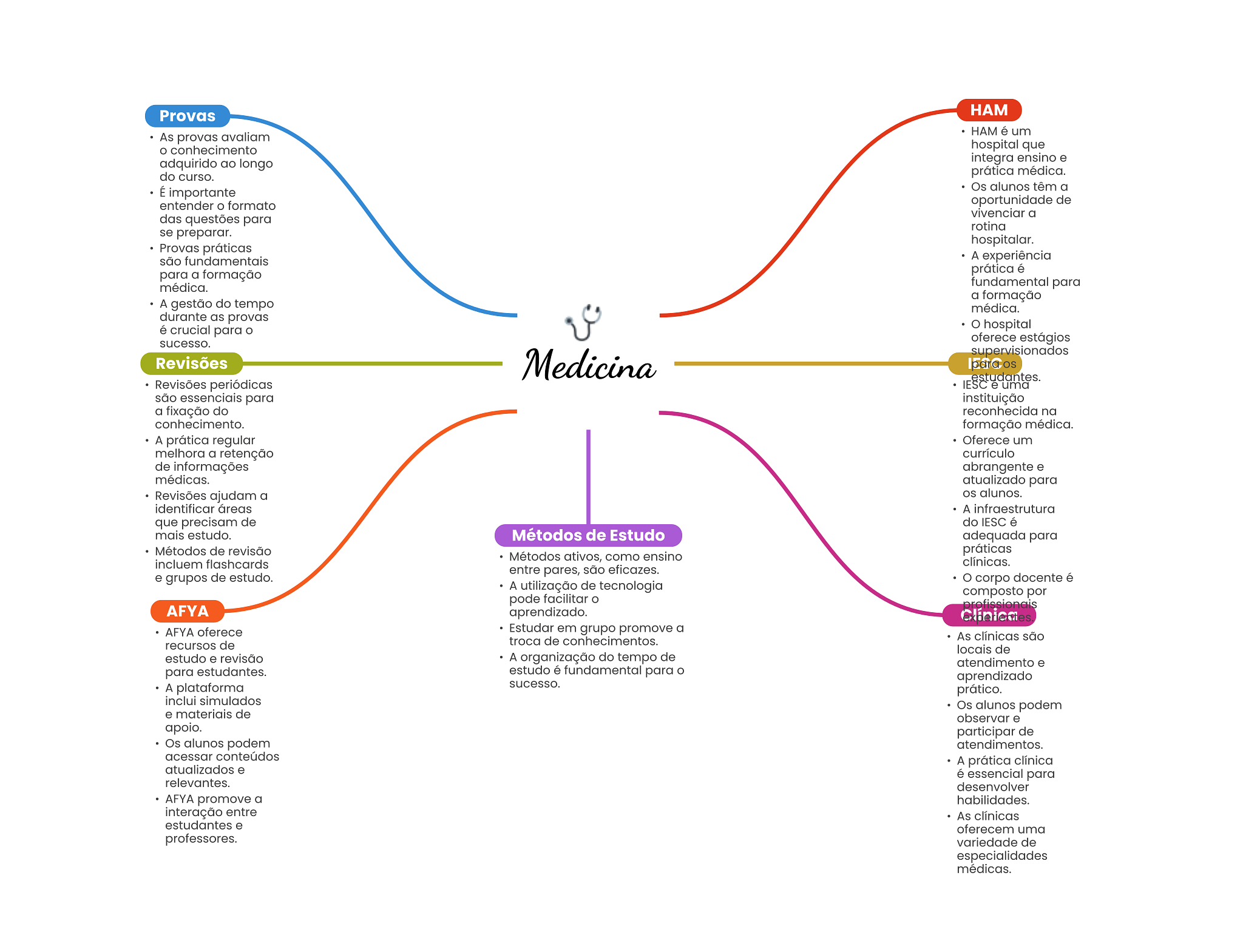 Provas HAM HAM é um As provas avaliam conhecimento hospital que adquirido ao longo integra ensino e do curso. prática médica. É importante Os alunos têm a entender formato oportunidade de vivenciar a das questões para rotina se preparar. hospitalar. Provas práticas são fundamentais A experiência para a formação prática é médica. fundamental para a formação A gestão do tempo médica. durante as provas é crucial para O hospital oferece estágios sucesso. supervisionados Revisões Medicina para Revisões periódicas IESC estudantes. e uma são essenciais para instituição a fixação do reconhecida na conhecimento. formação médica. A prática regular Oferece um melhora a retenção currículo de informações abrangente e médicas. atualizado para Revisões ajudam a alunos. identificar áreas A infraestrutura que precisam de do IESC é mais estudo. Métodos de Estudo adequada para Métodos de revisão práticas Métodos ativos, como ensino incluem flashcards clínicas. entre pares, são eficazes. e grupos de estudo. O corpo docente é A utilização de tecnologia composto por pode facilitar o profissionais AFYA aprendizado. Clínica AFYA oferece Estudar em grupo promove a troca de conhecimentos. As clínicas são recursos de locais de estudo e revisão A organização do tempo de atendimento e para estudantes. estudo é fundamental para o aprendizado A plataforma sucesso. prático. inclui simulados Os alunos podem e materiais de observar e apoio. participar de Os alunos podem atendimentos. acessar conteúdos A prática clínica atualizados e é essencial para relevantes. desenvolver AFYA promove a habilidades. interação entre As clínicas estudantes e oferecem uma professores. variedade de especialidades médicas.