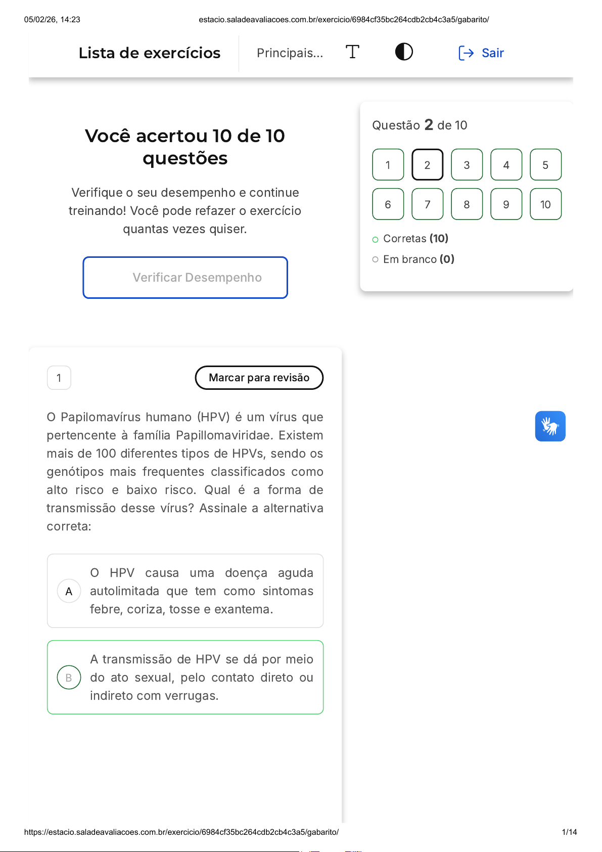 Você acertou 10 de 10 questões Verifique o seu desempenho e continue treinando! Você pode refazer o exercício quantas vezes quiser. Verificar Desempenho A B 1 Marcar para revisão O Papilomavírus humano (HPV) é um vírus que pertencente à família Papillomaviridae. Existem mais de 100 diferentes tipos de HPVs, sendo os genótipos mais frequentes classificados como alto risco e baixo risco. Qual é a forma de transmissão desse vírus? Assinale a alternativa correta: O HPV causa uma doença aguda autolimitada que tem como sintomas febre, coriza, tosse e exantema. A transmissão de HPV se dá por meio do ato sexual, pelo contato direto ou indireto com verrugas. Questão 2 de 10 Corretas (10) Em branco (0) 1 2 3 4 5 6 7 8 9 10 Lista de exercícios Principais… Sair 05/02/26, 14:23 estacio.saladeavaliacoes.com.br/exercicio/6984cf35bc264cdb2cb4c3a5/gabarito/ https://estacio.saladeavaliacoes.com.br/exercicio/6984cf35bc264cdb2cb4c3a5/gabarito/ 1/14 C D E O HPV, se não tratado adequadamente, pode causar cirrose hepática, devido a seu tropismo pelo fígado. O HPV é um arbovírus, portanto sua transmissão se dá através da picada de mosquito do gênero Anopheles. Quando o indivíduo é infectado pelo HPV de alto risco, é preciso ter cuidado com a ocorrência de extravasamento plasmático e choque hipovolêmico. Resposta correta Parabéns, você selecionou a alternativa correta. Confira o gabarito comentado! Gabarito Comentado A transmissão de HPV se dá por meio do ato sexual, pelo contato direto ou indireto com verrugas. O HPV é um vírus que pertence à família Papillomaviridae e causa verrugas na pele e nas mucosas. A transmissão do HPV se dá por meio do contato direto ou indireto com verrugas, ou por meio do ato sexual. O HPV é um vírus muito contagioso e pode ser transmitido mesmo quando a pessoa não apresenta sintomas. 2 Marcar para revisão 05/02/26, 14:23 estacio.saladeavaliacoes.com.br/exercicio/6984cf35bc264cdb2cb4c3a5/gabarito/ https://estacio.saladeavaliacoes.com.br/exercicio/6984cf35bc264cdb2cb4c3a5/gabarito/ 2/14 A B C D E Sobre hepatites virais, assinale a alternativa correta. Hepatite é uma inflamação no fígado que pode ser causada por vírus, utilização de alguns medicamentos, álcool, drogas e doenças autoimunes, metabólicas e genéticas. As hepatites A e B são difundidas por transmissão sexual, transfusão de sangue e objetos perfurocortantes. A vacina é uma das formas de prevenção contra os tipos C e E de hepatite. A hepatite C pode ser prevenida com saneamento básico adequado, com limpeza de alimentos antes de ingeri- los e higiene pessoal. Hepatite E é conhecida como vírus satélite, e só consegue infectar quando existe a presença do vírus da hepatite A. Resposta correta Parabéns, você selecionou a alternativa correta. Confira o gabarito comentado! Gabarito Comentado A hepatite é uma inflamação no fígado que pode ser causada por diversos fatores, incluindo vírus, uso de certos medicamentos, consumo de álcool, uso de 05/02/26, 14:23 estacio.saladeavaliacoes.com.br/exercicio/6984cf35bc264cdb2cb4c3a5/gabarito/ https://estacio.saladeavaliacoes.com.br/exercicio/6984cf35bc264cdb2cb4c3a5/gabarito/ 3/14 A B C drogas e doenças autoimunes, metabólicas e genéticas. Esta é uma definição abrangente e precisa de hepatite, que engloba suas várias possíveis causas. As outras alternativas contêm informações incorretas ou incompletas sobre as formas de transmissão e prevenção das hepatites virais. 3 Marcar para revisão O sarampo é uma doença viral exantemática aguda, pertencente à família Paramyxoviridae, e altamente contagiosa. Em relação ao sarampo, podemos afirmar que: A infecção por sarampo não gera imunidade para toda a vida, por isso é impossível o desenvolvimento de vacina. Para o tratamento do sarampo, é muito utilizado o antiviral Tamiflu, que é administrado não só para o paciente, mas também para os parentes próximos. O sarampo é uma doença transmitida por água e alimentos contaminados. 05/02/26, 14:23 estacio.saladeavaliacoes.com.br/exercicio/6984cf35bc264cdb2cb4c3a5/gabarito/ https://estacio.saladeavaliacoes.com.br/exercicio/6984cf35bc264cdb2cb4c3a5/gabarito/ 4/14 D E O indivíduo infectado sintomático pode apresentar febre, tosse, coriza, conjuntivite, manchas de Koplik e exantema maculopapular eritematoso. O sarampo pode causar síndrome congênita quando ocorre na gravidez. Resposta correta Parabéns, você selecionou a alternativa correta. Confira o gabarito comentado! Gabarito Comentado O sarampo é uma doença viral exantemática aguda, pertencente à família Paramyxoviridae, e altamente contagiosa. Os sintomas do sarampo incluem febre, tosse, coriza, conjuntivite, manchas de Koplik e exantema maculopapular eritematoso. O sarampo é uma doença grave e pode levar à morte. A vacina contra o sarampo é segura e eficaz e deve ser administrada a todas as crianças. 4 Marcar para revisão O vírus sincicial respiratório (VSR) é uma causa muito comum de infecções das vias aéreas. Sobre esse vírus, analise as afirmativas. I. As manifestações clínicas variam de doença leve do trato respiratório superior (URTI) até envolvimento grave do trato respiratório inferior (LRTI), apresentando então risco de morte. II. A vacina da gripe é uma forma de prevenção da VSR e é administrada em dose única na 05/02/26, 14:23 estacio.saladeavaliacoes.com.br/exercicio/6984cf35bc264cdb2cb4c3a5/gabarito/ https://estacio.saladeavaliacoes.com.br/exercicio/6984cf35bc264cdb2cb4c3a5/gabarito/ 5/14 A B C D E infância. III. A infecção por VSR é comum em bebês e crianças. De acordo com o exposto, estão corretas: Apenas I. Apenas II. Apenas II e III. Apenas I e II. Apenas I e III. Resposta correta Parabéns, você selecionou a alternativa correta. Confira o gabarito comentado! Gabarito Comentado Apenas as afirmativas I e III estão corretas. A afirmativa I está correta porque as manifestações clíni