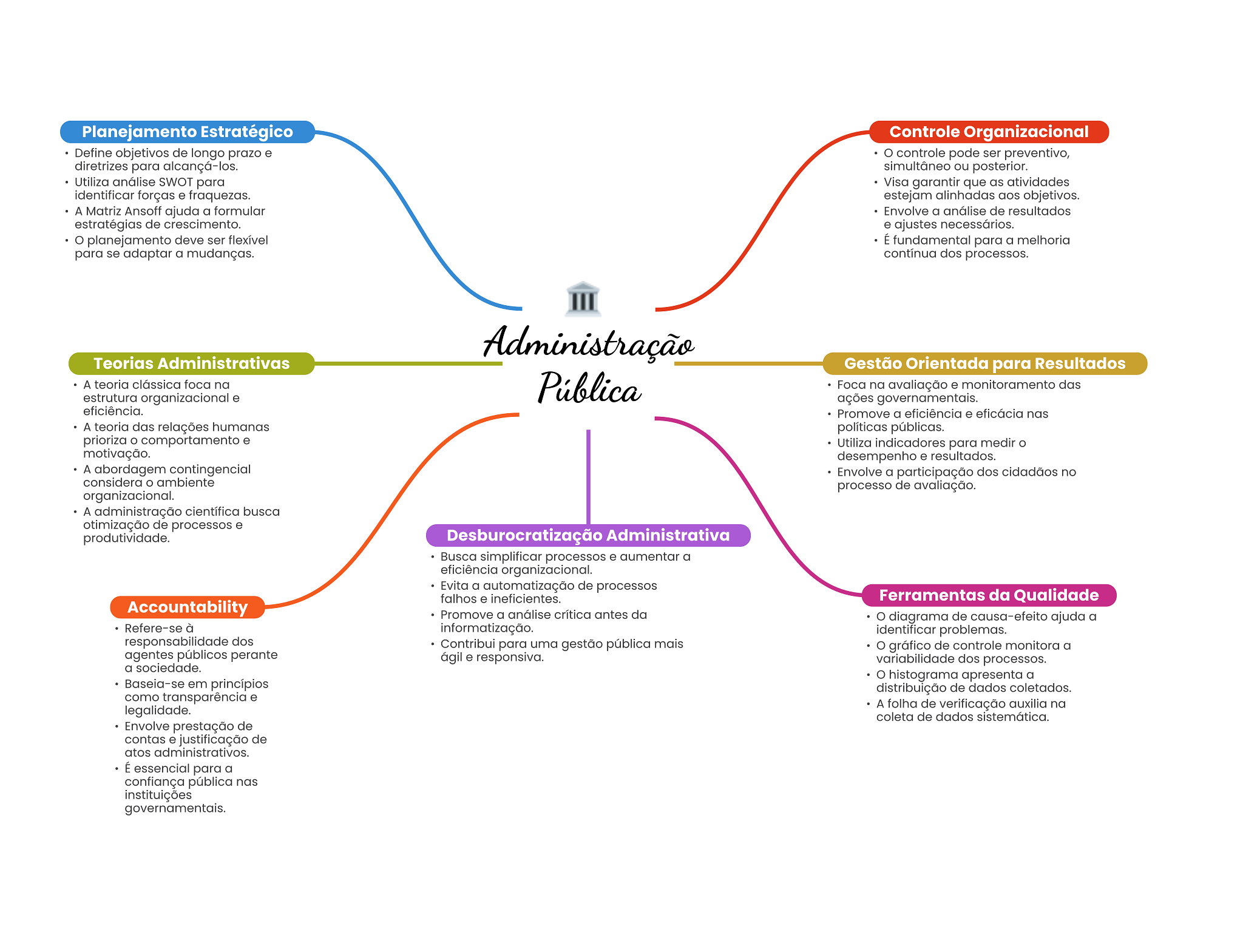Planejamento Estratégico Controle Organizacional Define objetivos de longo prazo e O controle pode ser preventivo, diretrizes para alcançá-los. simultâneo ou posterior. Utiliza análise SWOT para Visa garantir que as atividades identificar forças e fraquezas. estejam alinhadas aos objetivos. A Matriz Ansoff ajuda a formular Envolve a análise de resultados estratégias de crescimento. e ajustes necessários. planejamento deve ser flexível É fundamental para a melhoria para se adaptar a mudanças. contínua dos processos. Administração Teorias Administrativas Gestão Orientada para Resultados A teoria clássica foca na Pública Foca na avaliação e monitoramento das estrutura organizacional e ações governamentais. eficiência. Promove a eficiência e eficácia nas A teoria das relações humanas políticas públicas. prioriza O comportamento e Utiliza indicadores para medir motivação. desempenho e resultados. A abordagem contingencial Envolve a participação dos cidadãos no considera ambiente processo de avaliação. organizacional. A administração científica busca otimização de processos e produtividade. Desburocratização Administrativa Busca simplificar processos e aumentar a eficiência organizacional. Evita a automatização de processos falhos e ineficientes. Ferramentas da Qualidade Accountability Promove a análise crítica antes da diagrama de causa-efeito ajuda a Refere-se à informatização. identificar problemas. responsabilidade dos Contribui para uma gestão pública mais gráfico de controle monitora a agentes públicos perante ágil e responsiva. variabilidade dos processos. a sociedade. histograma apresenta a Baseia-se em princípios distribuição de dados coletados. como transparência e legalidade. A folha de verificação auxilia na coleta de dados sistemática. Envolve prestação de contas e justificação de atos administrativos. É essencial para a confiança pública nas instituições governamentais.