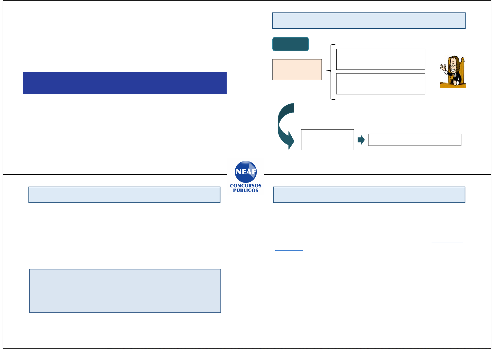 DO JUIZ Art. 251 podendo, para tal fim, AO JUIZ INCUMBIRÁ 1) prover à regularidade do processo 2) e manter a ordem no curso dos respectivos atos, requisitar a FORÇA PÚBLICA. Do Juiz Art. 252. O juiz não poderá exercer jurisdição no processo em que: • tiver funcionado seu cônjuge ou parente, consanguíneo ou afim, em linha reta ou colateral até o terceiro grau, inclusive, como ⮚ defensor ou advogado, ⮚ órgão do Ministério Público, ⮚ autoridade policial, ⮚ auxiliar da justiça ou perito; • ele próprio ou seu cônjuge ou parente, consanguíneo ou afim em linha reta ou colateral até o terceiro grau, inclusive, for ⮚ parte ou diretamente interessado no feito. Impedimento • ele próprio houver desempenhado qualquer dessas funções ou servido como testemunha; • tiver funcionado como juiz de outra instância, pronunciando-se, de fato ou de direito, sobre a questão; JUÍZOS COLETIVOS Art. 253. Nos juízos coletivos, não poderão servir no mesmo processo os juízes que forem entre si parentes, consanguíneos ou afins, em linha reta ou colateral até o terceiro grau, inclusive Impedimento Av. São Luís, 86 - São Paulo - SP - Whats. 11-31294356 www.neafconcursos.com.br Art. 254. O juiz dar-se-á por suspeito, e, se não o fizer, poderá ser recusado por qualquer das partes • se ele, seu cônjuge, ascendente ou descendente, estiver respondendo a processo por fato análogo, sobre cujo caráter criminoso haja controvérsia; • se ele, seu cônjuge, ou parente, consanguíneo, ou afim, até o terceiro grau, inclusive, sustentar demanda ou responder a processo que tenha de ser julgado por qualquer das partes; Suspeição • se for amigo íntimo ou inimigo capital de qualquer deles; • se tiver aconselhado qualquer das partes; • se for credor ou devedor, tutor ou curador das partes; • se for sócio, acionista ou administrador de sociedade interessada no processo ⮚ Defensor ⮚ Advogado, ⮚ Ministério Público, ⮚ Autoridade policial, ⮚ Perito ⮚ Auxiliar da Justiça ⮚ Parte ⮚ Interessado no feito. DO JUIZ JUIZ + CÔNJUGE E PARENTES (ATÉ TERCEIRO GRAU) • TESTEMUNHA; • JUIZ de outra instância, pronunciando-se, de fato ou de direito, sobre a questão; IMPEDIMENTOS sustentar demanda ou responder a processo que tenha de ser julgado por qualquer das partes; JUIZ + CÔNJUGE E PARENTES (ATÉ TERCEIRO GRAU)• se for amigo íntimo ou inimigo capital de qualquer deles; • se tiver aconselhado qualquer das partes; • se for credor ou devedor, tutor ou curador das partes; • se for sócio, acionista ou administrador de sociedade interessada no processo JUIZ + CAD responder a processo por fato análogo, sobre cujo caráter criminoso haja controvérsia; AMIGO ACONSELHOU o TUTOR A SER CREDOR DO SÓCIO. DO JUIZ SUSPEIÇÃO Do Juiz Art. 255 O impedimento decorrente de parentesco por afinidade CESSARÁ pela dissolução do casamento que Ihe tiver dado causa, salvo sobrevindo descendentes; ou suspeição mas, ainda que dissolvido o casamento sem descendentes, não funcionará como juiz o sogro, o padrasto, o cunhado, o genro ou enteado de quem for parte no processo Av. São Luís, 86 - São Paulo - SP - Whats. 11-31294356 www.neafconcursos.com.br Art. 256. A suspeição NÃO PODERÁ SER DECLARADA nem reconhecida, quando a parte INJURIAR o juiz ou de propósito der motivo para criá-la. Art. 274. As prescrições sobre suspeição dos juízes estendem- se aos serventuários e funcionários da justiça, no que Ihes for aplicável. Suspeição Caio, magistrado, casou-se, em abril de 2024, com Mévia, filha de Tércio, perito judicial. Posteriormente ao casamento, Caio verificou que Tércio atuou como perito judicial em processos que estão sob sua jurisdição. Com base na situação hipotética, assinale a alternativa correta. (A) Ainda que venha a se divorciar de Mévia, Caio não poderá exercer jurisdição nos processos em que Tércio funcionou como perito judicial. (B) Caio, por expressa previsão legal, é impedido de exercer jurisdição nos processos em que o sogro funcionou como perito judicial. VUNESP - 2024 - TJ/SP - Escrevente Técnico Caio, magistrado, casou-se, em abril de 2024, com Mévia, filha de Tércio, perito judicial. Posteriormente ao casamento, Caio verificou que Tércio atuou como perito judicial em processos que estão sob sua jurisdição. Com base na situação hipotética, assinale a alternativa correta. (C) Caio, por expressa previsão legal, deverá se declarar suspeito para exercer jurisdição nos processos em que o sogro atua como perito judicial, inexistindo, contudo, impedimento nos feitos em que a atuação já se encerrou. (D) Caio, por expressa previsão legal, deverá se declarar suspeito para exercer jurisdição nos processos em que o sogro atuou como perito judicial. (E) Caio, por expressa previsão legal, é impedido de exercer jurisdição nos processos em que o sogro funciona como perito judicial, inexistindo, contudo, impedimento nos feitos em que a atuação já se encerrou. VUNESP - 2024 - TJ/SP - Escrevente Técnico Caio, magistrado, casou-se, em abril de 2024, com Mévia, filha de Tércio, perito judicial. Posteriormente ao casamento, Caio verificou que Tércio atuou como perito judicial em processos que estão sob sua jurisdição. Com base na situação hipotética, assinale a alternativa correta. (A) Ainda que venha a se divorciar de Mévia, Caio não poderá exercer jurisdição nos processos em que Tércio funcionou como perito judicial. (B) Caio, por expressa previsão legal, é impedido de exercer jurisdição nos processos em que o sogro funcionou como perito judicial. VUNESP - 2024 - TJ/SP - Escrevente Técnico Av. São Luís, 86 - São Paulo - SP - Whats. 11-31294356 www.neafconcursos.com.br QUESTÃO DESAFIO Considere as situações abaixo: Américo, juiz de uma das Varas Criminais da Comarca Y, no Estado de São Paulo, foi designado para atuar em um processo no qual, o pai de sua ex- mulher figura c