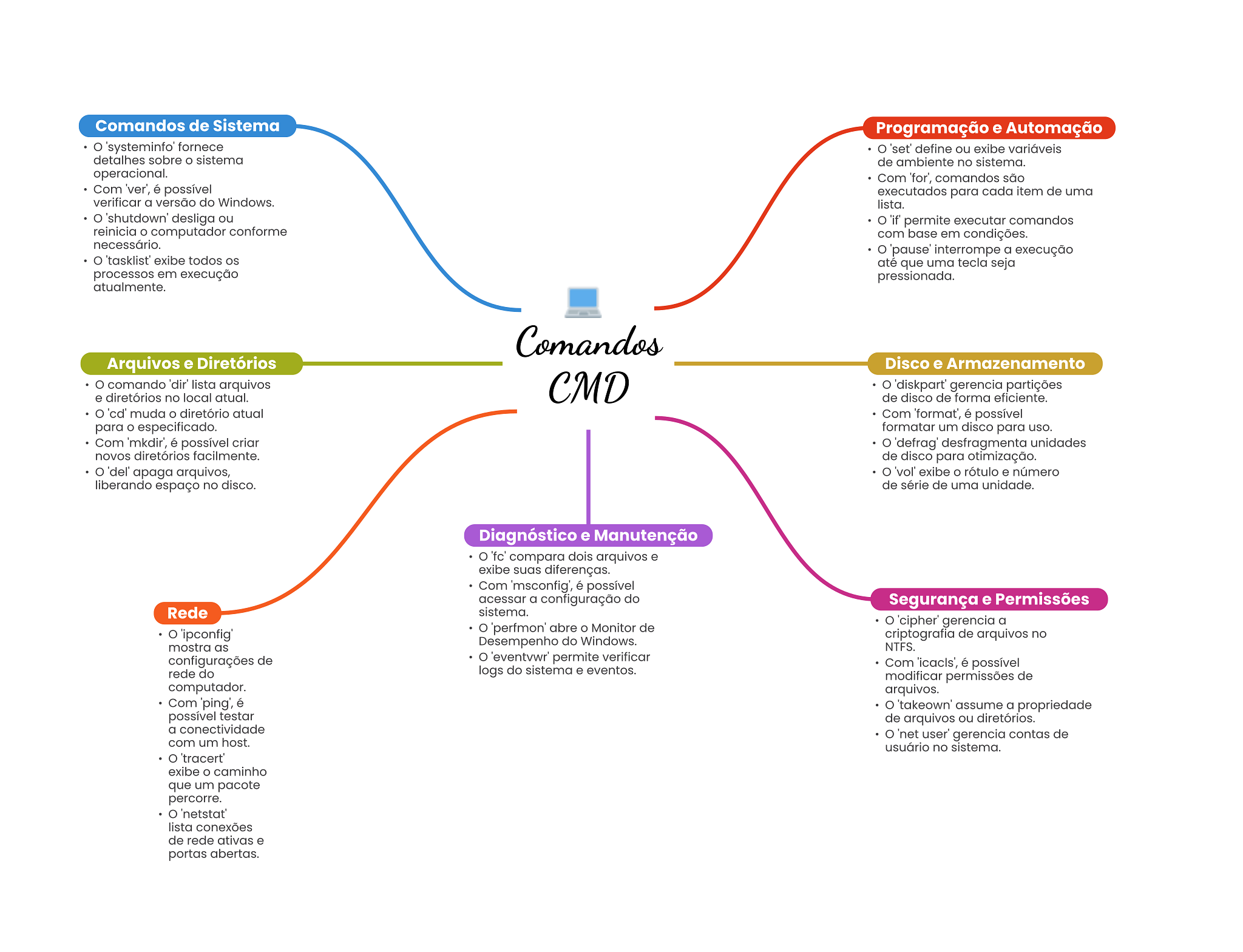 Comandos de Sistema Programação e Automação 'systeminfo' fornece 'set' define ou exibe variáveis detalhes sobre sistema de ambiente no sistema. operacional. Com 'for', comandos são Com 'ver', é possível executados para cada item de uma verificar a versão do Windows. lista. desliga ou 'if' permite executar comandos reinicia computador conforme com base em condições. necessário. 'pause' interrompe a execução 'tasklist' exibe todos até que uma tecla seja processos em execução pressionada. atualmente. Comandos Arquivos e Diretórios Disco e Armazenamento comando 'dir' lista arquivos CMD 'diskpart' gerencia partições e diretórios no local atual. de disco de forma eficiente. 'cd' muda diretório atual Com 'format', é possível para especificado. formatar um disco para uso. Com 'mkdir', é possível criar desfragmenta unidades novos diretórios facilmente. de disco para otimização. 'del' apaga arquivos, 'vol' exibe rótulo e número liberando espaço no disco. de série de uma unidade. Diagnóstico e Manutenção 'fc' compara dois arquivos e exibe suas diferenças. Com 'msconfig', é possível acessar a configuração do Segurança e Permissões Rede sistema. 'cipher' gerencia a 'perfmon' abre Monitor de criptografia de arquivos no mostra as Desempenho do Windows. NTFS. configurações de 'eventvwr' permite verificar Com 'icacls', é possível rede do logs do sistema e eventos. modificar permissões de computador. arquivos. Com 'ping', é 'takeown' assume a propriedade possível testar de arquivos ou diretórios. a conectividade user' gerencia contas de com um host. usuário no sistema. 'tracert' exibe caminho que um pacote percorre. lista conexões de rede ativas e portas abertas.