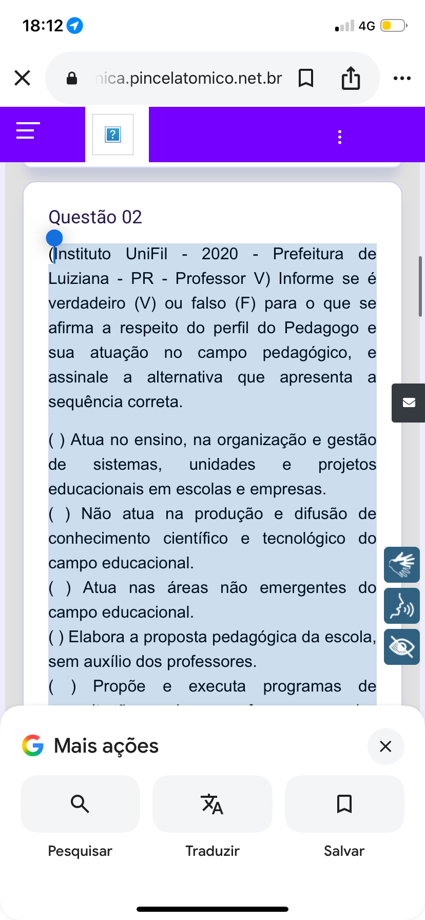 18:12 1 4G X nica.pincelatomico.net.br ? Questão 02 (Instituto UniFil - 2020 - Prefeitura de Luiziana PR Professor V) Informe se é verdadeiro (V) ou falso (F) para o que se afirma a respeito do perfil do Pedagogo e sua atuação no campo pedagógico, e assinale a alternativa que apresenta a sequência correta. Atua no ensino, na organização e gestão de sistemas, unidades e projetos educacionais em escolas e empresas. Não atua na produção e difusão de conhecimento científico e tecnológico do campo educacional. ( ) Atua nas áreas não emergentes do campo educacional. () Elabora a proposta pedagógica da escola, sem auxílio dos professores. ( ) Propõe e executa programas de Mais ações X Pesquisar Traduzir Salvar