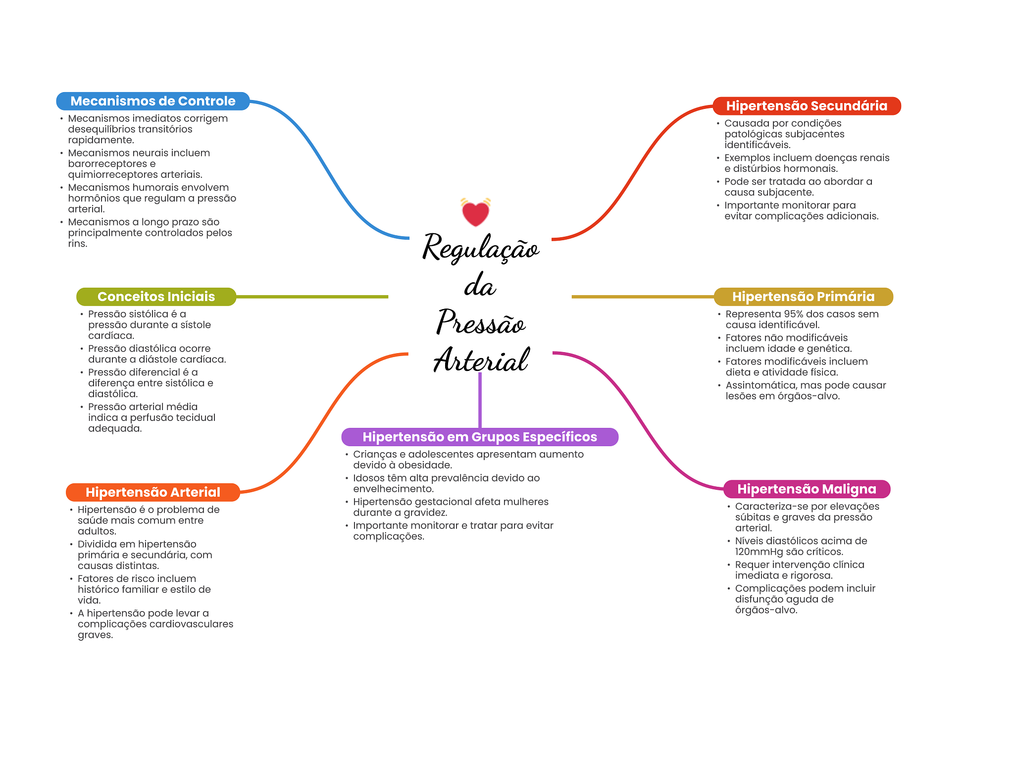 Mecanismos de Controle Hipertensão Secundária Mecanismos imediatos corrigem transitórios Causada por condições patológicas subjacentes rapidamente. identificáveis. Mecanismos neurais incluem Exemplos incluem doenças renais barorreceptores e e distúrbios hormonais. quimiorreceptores arteriais. Pode ser tratada ao abordar a Mecanismos humorais envolvem causa subjacente. hormônios que regulam a pressão arterial. Importante monitorar para Mecanismos a longo prazo são evitar complicações adicionais. principalmente controlados pelos rins. Regulação da Conceitos Iniciais Hipertensão Primária Pressão sistólica é a Pressão Representa 95% dos casos sem pressão durante a sístole causa identificável. cardíaca. Fatores não modificáveis Pressão diastólica ocorre durante a diástole cardíaca. Arterial incluem idade e genética. Fatores modificáveis incluem Pressão diferencial é a dieta e atividade física. diferença entre sistólica e Assintomática, mas pode causar diastólica. lesões em órgãos-alvo. Pressão arterial média indica a perfusão tecidual adequada. Hipertensão em Grupos Específicos Crianças e adolescentes apresentam aumento devido à obesidade. Idosos têm alta prevalência devido ao Hipertensão Arterial envelhecimento. Hipertensão Maligna Hipertensão gestacional afeta mulheres Hipertensão é problema de Caracteriza-se por elevações durante a gravidez. saúde mais comum entre súbitas e graves da pressão adultos. Importante monitorar e tratar para evitar arterial. complicações. Dividida em hipertensão Níveis diastólicos acima de primária e secundária, com 120mmHg são críticos. causas distintas. Requer intervenção clínica Fatores de risco incluem imediata e rigorosa. histórico familiar e estilo de Complicações podem incluir vida. disfunção aguda de A hipertensão pode levar a órgãos-alvo. complicações cardiovasculares graves.