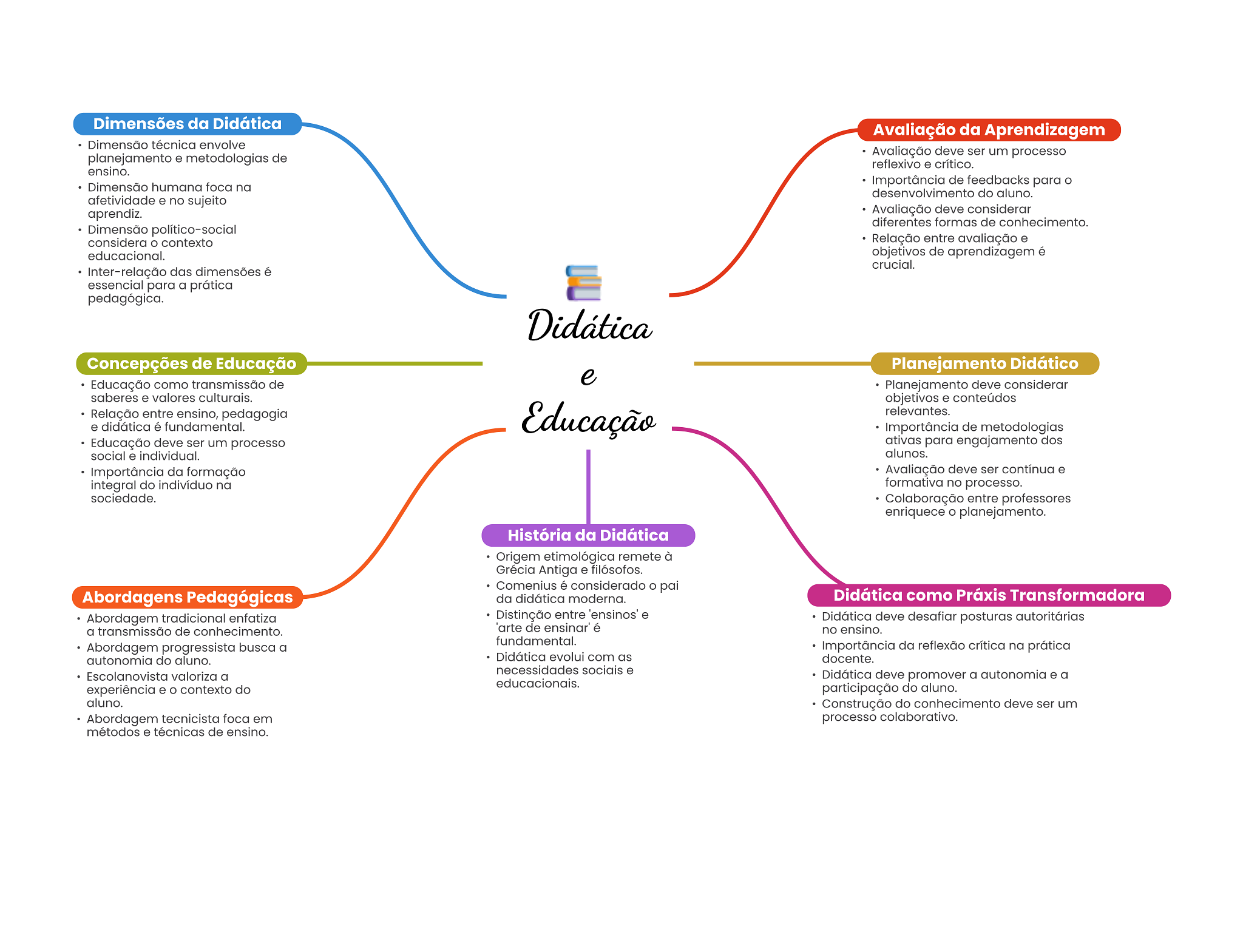Dimensões da Didática Avaliação da Aprendizagem Dimensão técnica envolve planejamento e metodologias de Avaliação deve ser um processo reflexivo e crítico. ensino. Dimensão humana foca na Importância de feedbacks para desenvolvimento do aluno. afetividade e no sujeito aprendiz. Avaliação deve considerar diferentes formas de conhecimento. Dimensão político-social considera contexto Relação entre avaliação e educacional. objetivos de aprendizagem é crucial. Inter-relação das dimensões é essencial para a prática pedagógica. Didática Concepções de Educação Planejamento Didático e Educação como transmissão de Planejamento deve considerar saberes e valores culturais. objetivos e conteúdos Relação entre ensino, pedagogia Educação relevantes. e didática é fundamental. Importância de metodologias Educação deve ser um processo ativas para engajamento dos social e individual. alunos. Importância da formação Avaliação deve ser contínua e integral do indivíduo na formativa no processo. sociedade. Colaboração entre professores enriquece planejamento. História da Didática Origem etimológica remete à Grécia Antiga e filósofos. Comenius é considerado pai Abordagens Pedagógicas da didática moderna. Didática como Práxis Transformadora Abordagem tradicional enfatiza Distinção entre 'ensinos' e Didática deve desafiar posturas autoritárias a transmissão de conhecimento. 'arte de ensinar' é no ensino. fundamental. Abordagem progressista busca a Importância da reflexão crítica na prática autonomia do aluno. Didática evolui com as docente. necessidades sociais e Escolanovista valoriza a Didática deve promover a autonomia e a educacionais. experiência e contexto do participação do aluno. aluno. Construção do conhecimento deve ser um Abordagem tecnicista foca em processo colaborativo. métodos e técnicas de ensino.