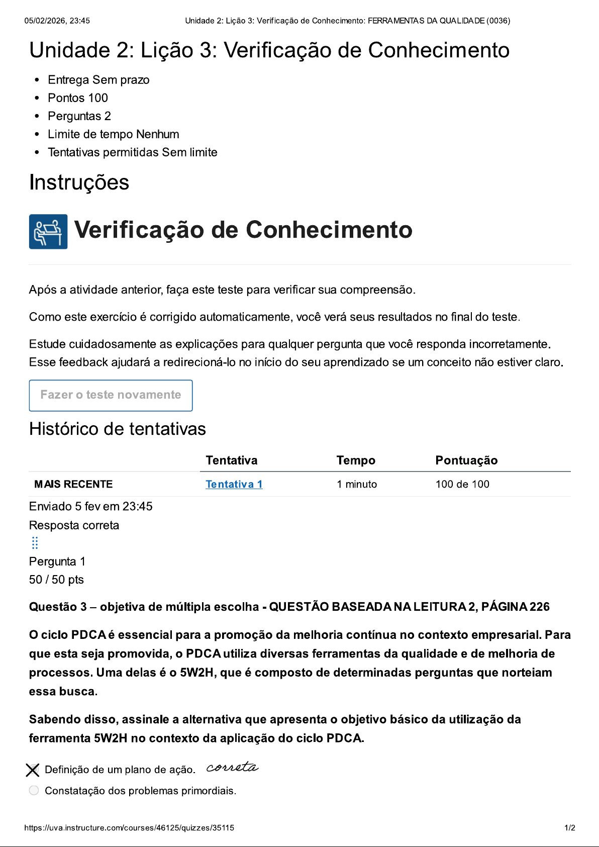 05/02/2026, 23:45 Unidade 2: Lição 3: Verificação de Conhecimento: FERRAMENTAS DA QUALIDADE (0036) Unidade 2: Lição 3: Verificação de Conhecimento Entrega Sem prazo Pontos 100 Perguntas 2 Limite de tempo Nenhum Tentativas permitidas Sem limite Instruções Verificação de Conhecimento Após a atividade anterior, faça este teste para verificar sua compreensão. Como este exercício é corrigido automaticamente, você verá seus resultados no final do teste. Estude cuidadosamente as explicações para qualquer pergunta que você responda incorretamente. Esse feedback ajudará a redirecioná-lo no início do seu aprendizado se um conceito não estiver claro. Fazer teste novamente Histórico de tentativas Tentativa Tempo Pontuação MAIS RECENTE Tentativa 1 1 minuto 100 de 100 Enviado 5 fev em 23:45 Resposta correta Pergunta 1 50 / 50 pts Questão 3 objetiva de múltipla escolha QUESTÃO BASEADA NA LEITURA 2, PÁGINA 226 ciclo PDCAé essencial para a promoção da melhoria contínua no contexto empresarial. Para que esta seja promovida, PDCA utiliza diversas ferramentas da qualidade e de melhoria de processos. Uma delas é 5W2H, que é composto de determinadas perguntas que norteiam essa busca. Sabendo disso, assinale a alternativa que apresenta objetivo básico da utilização da ferramenta 5W2H no contexto da aplicação do ciclo PDCA. X Definição de um plano de ação. correta Constatação dos problemas primordiais. https://uva.instructure.com/courses/46125/quizzes/35115 1/205/02/2026, 23:45 Unidade 2: Lição 3: Verificação de Conhecimento: FERRAMENTAS DA QUALIDADE (0036) Verificação da variabilidade do processo. Identificação das causas do problema. Registro dos dados dos problemas. Uma das ferramentas básicas no contexto da melhoria contínua e, consequentemente, no ciclo PDCA, é o 5W2H. O objetivo básico dessa técnica é possibilitar a elaboração de um plano de ação para combater as causas de um problema. Resposta correta Pergunta 2 50 / 50 pts ciclo PDCAé uma das ferramentas mais importantes no contexto da melhoria contínua. Todavia ela não é isolada, pois abrange diversas outras ferramentas diferentes. Uma delas é 5W2H, que é essencial para a resolução de problemas no contexto empresarial. Sabendo disso, assinale a alternativa que apresenta a etapa do ciclo PDCA na qual é normalmente empregada a ferramenta 5W2H. Etapa de checagem. Etapa de ação corretiva. X Etapa de planejamento. correta Etapa de execução. Etapa de verificação. Normalmente, a ferramenta 5W2H é aplicada na etapa de planejamento do ciclo PDCA, visto que, nessa fase, é importante determinar as ações que precisam ser realizadas para combater as causas fundamentais do problema analisado inicialmente. https://uva.instructure.com/courses/46125/quizzes/35115 2/2