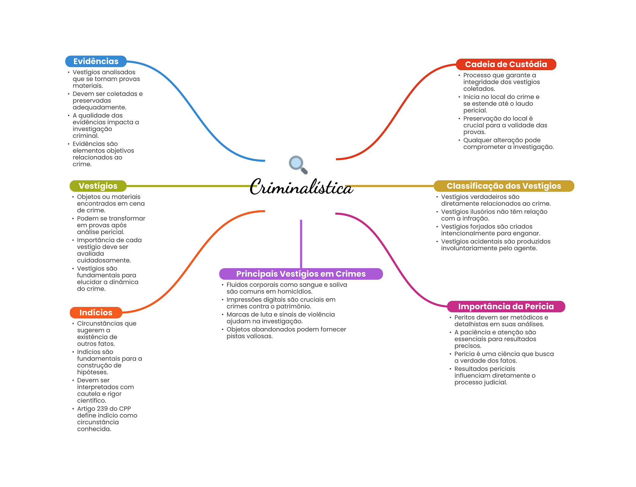 Evidências Cadeia de Custódia Vestígios analisados Processo que garante a que se tornam provas materiais. integridade dos vestígios coletados. Devem ser coletadas e Inicia no local do crime e preservadas se estende até O laudo adequadamente. pericial. A qualidade das Preservação do local é evidências impacta a crucial para a validade das investigação criminal. provas. Evidências são Qualquer alteração pode comprometer a investigação. elementos objetivos relacionados ao crime. Vestígios Criminalística Classificação dos Vestígios Objetos ou materiais Vestígios verdadeiros são encontrados em cena diretamente relacionados ao crime. de crime. Vestígios ilusórios não têm relação Podem se transformar com a infração. em provas após Vestígios forjados são criados análise pericial. intencionalmente para enganar. Importância de cada Vestígios acidentais são produzidos vestígio deve ser pelo agente. avaliada cuidadosamente. Vestígios são fundamentais para Principais Vestígios em Crimes elucidar a dinâmica Fluidos corporais como sangue e saliva do crime. são comuns em homicídios. Impressões digitais são cruciais em crimes contra patrimônio. Importância da Perícia Indícios Marcas de luta e sinais de violência Peritos devem ser metódicos e Circunstâncias que ajudam na investigação. detalhistas em suas análises. sugerem a Objetos abandonados podem fornecer A paciência e atenção são existência de pistas valiosas. essenciais para resultados outros fatos. precisos. Indícios são Perícia é uma ciência que busca fundamentais para a a verdade dos fatos. construção de hipóteses. Resultados periciais influenciam diretamente Devem ser processo judicial. interpretados com cautela e rigor científico. Artigo 239 do CPP define indício como circunstância conhecida.